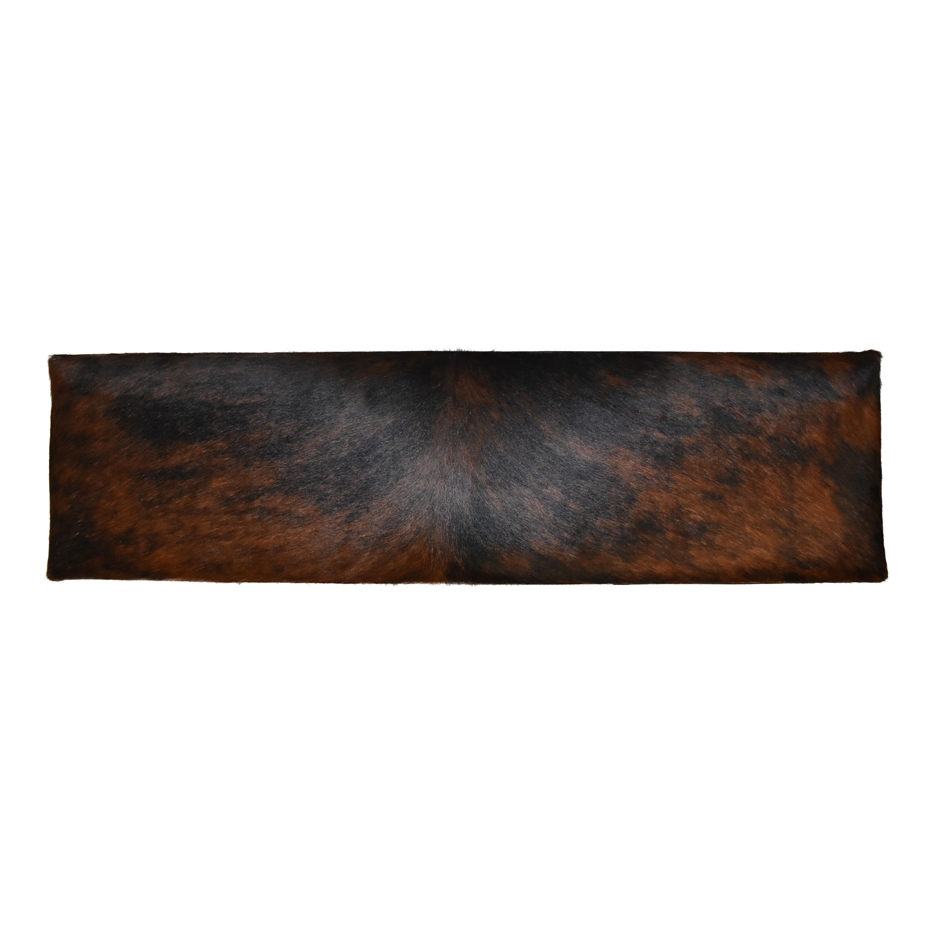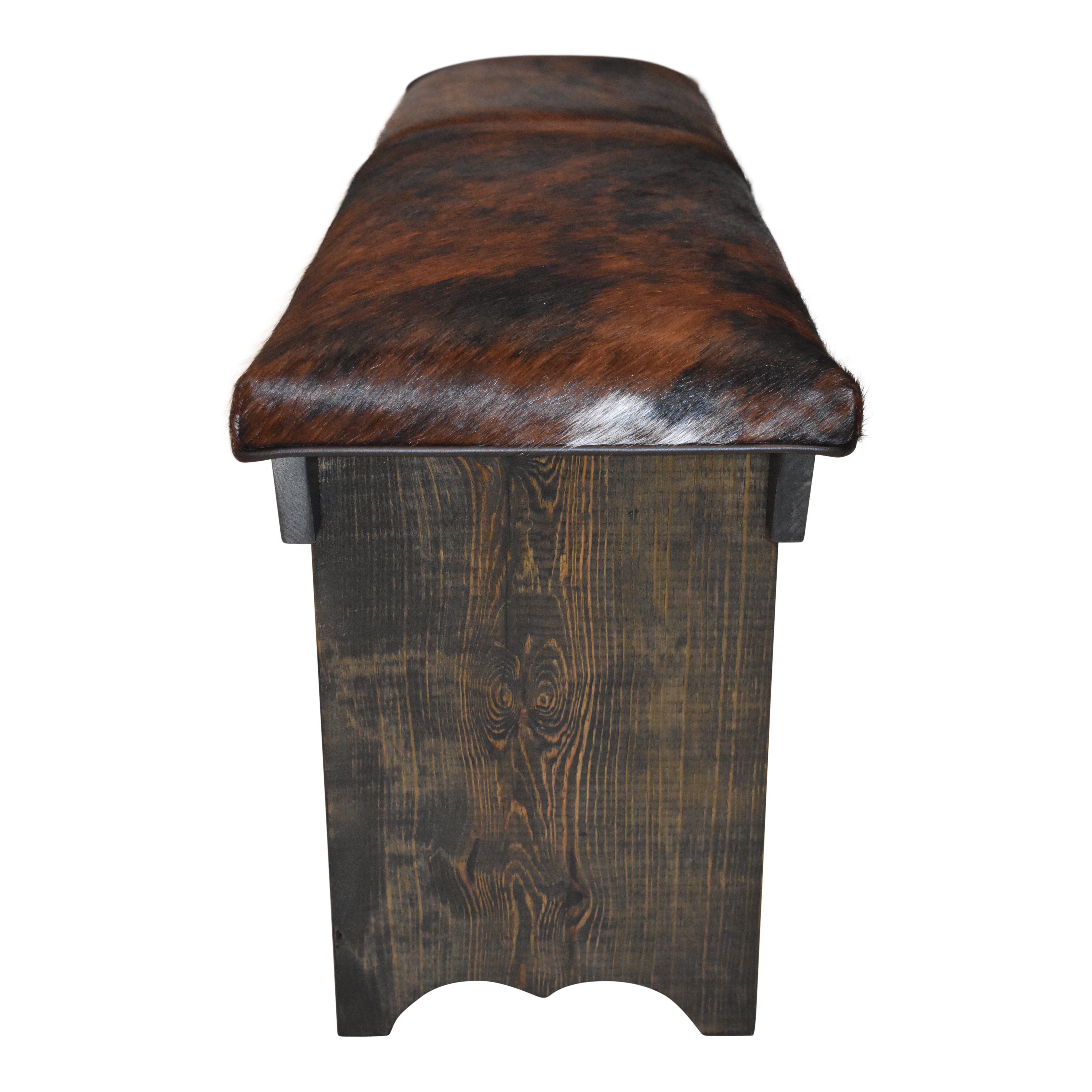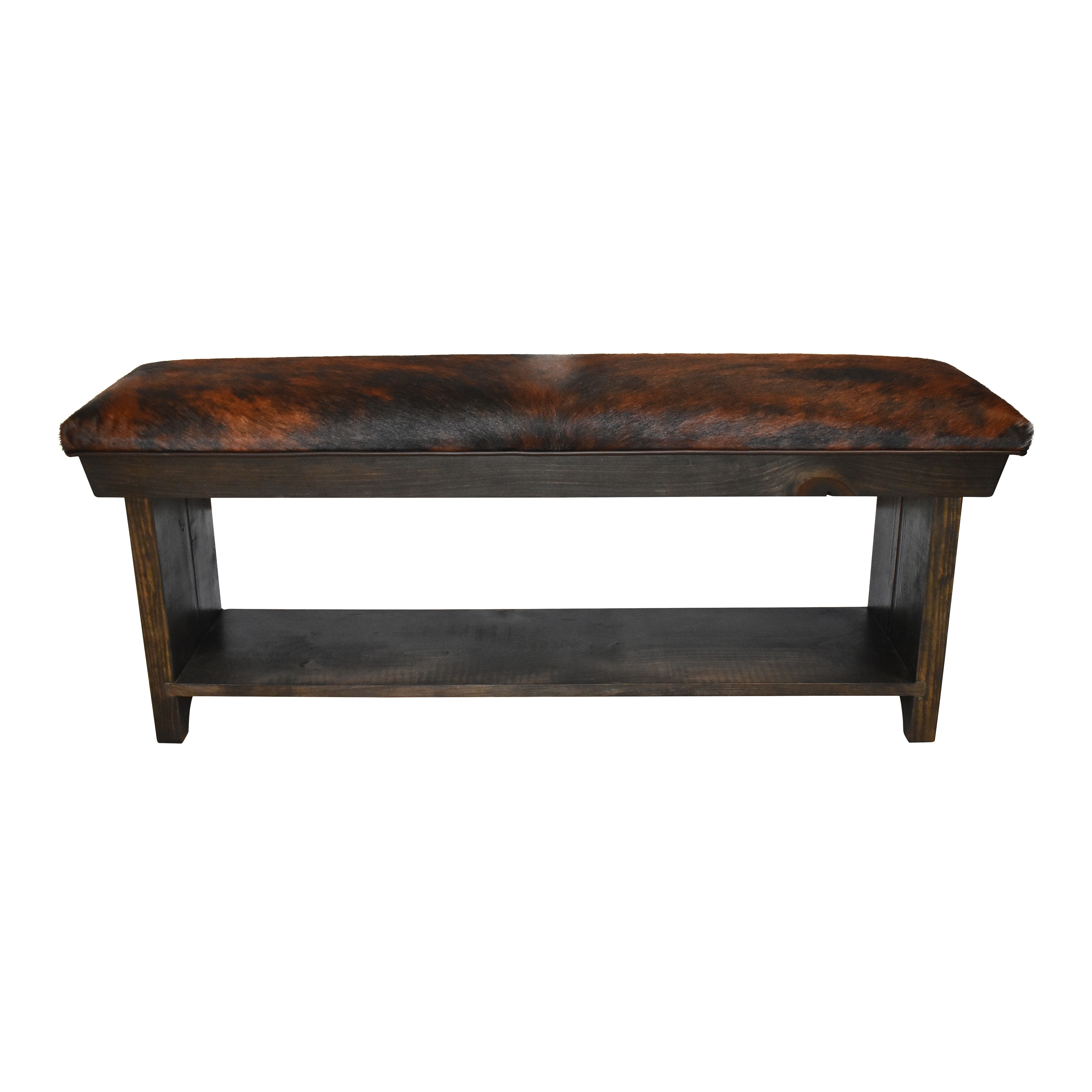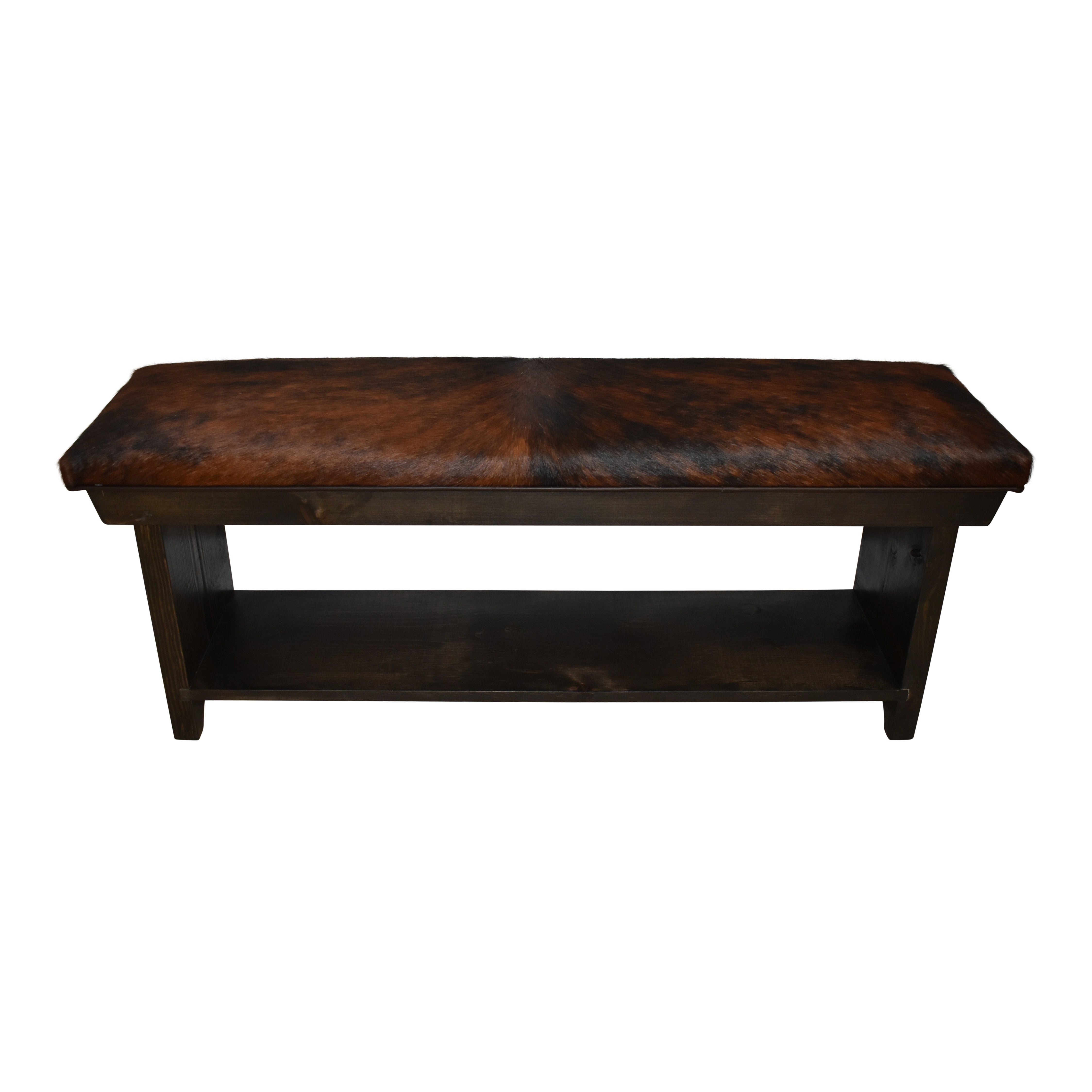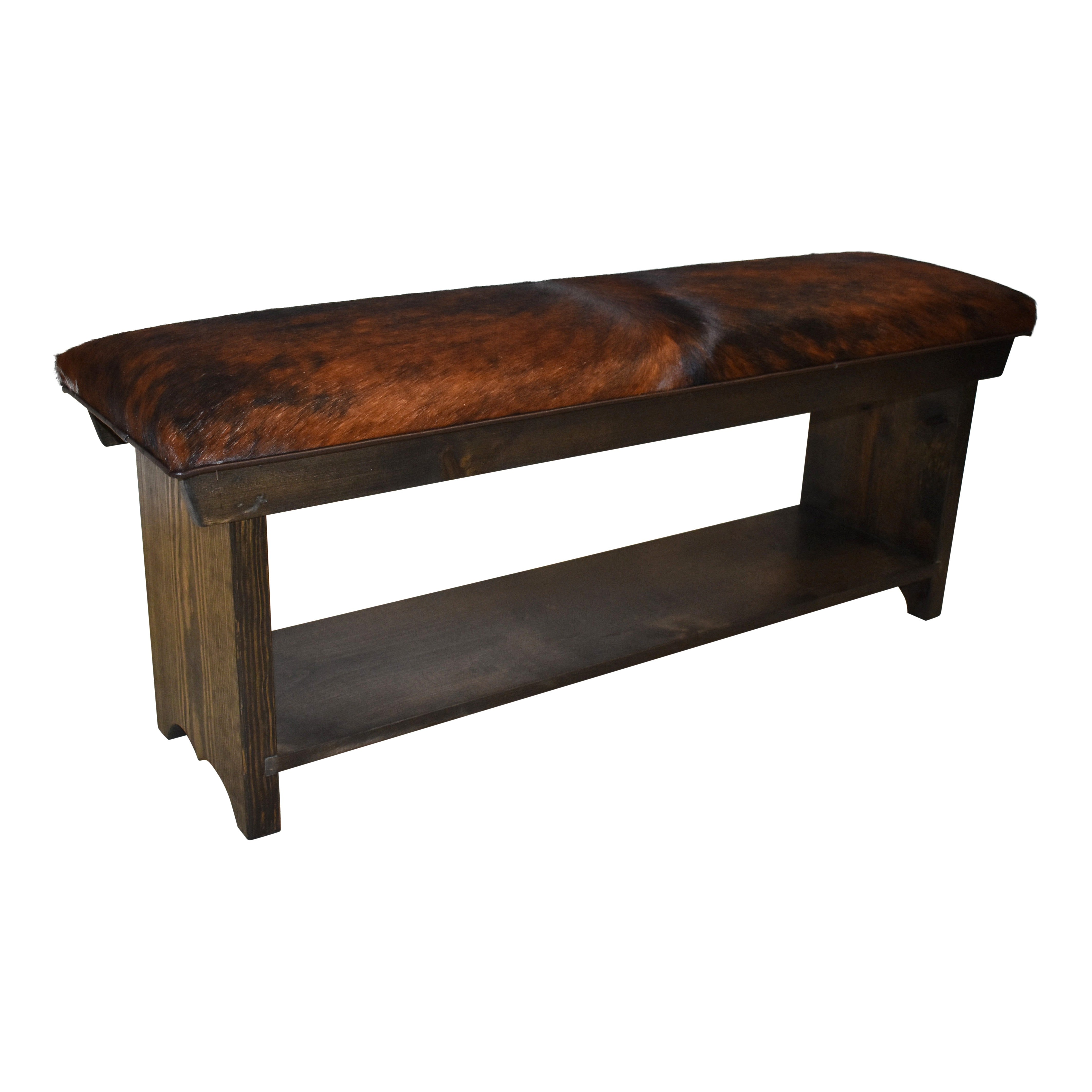 Bring a bit of the west to any room with this beautiful four foot bench! The bench pairs a luxurious cowhide and a solid wooden frame that is finished with a rich, dark stain. A lower shelf offers a great place to store footwear. This is a new item, not an antique.