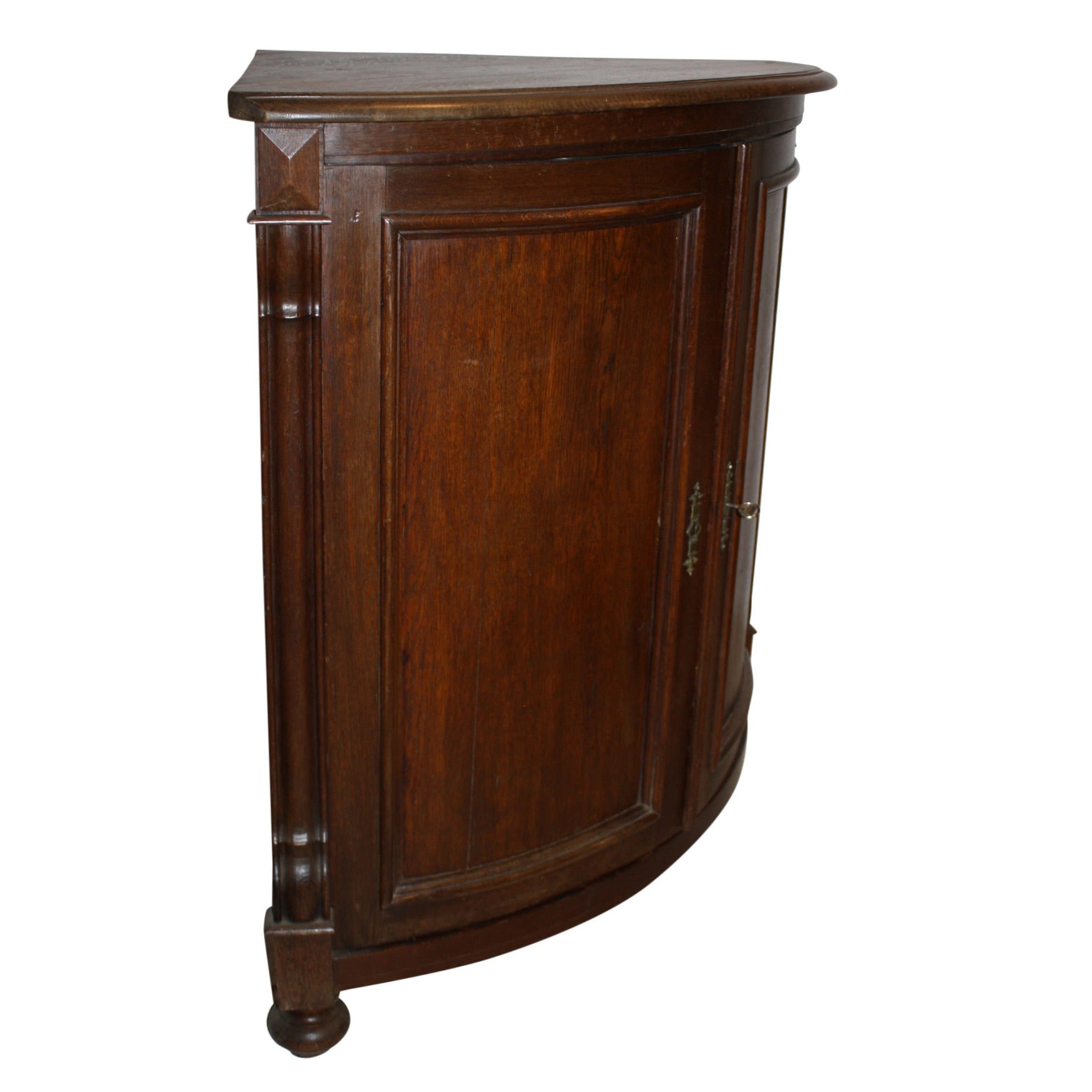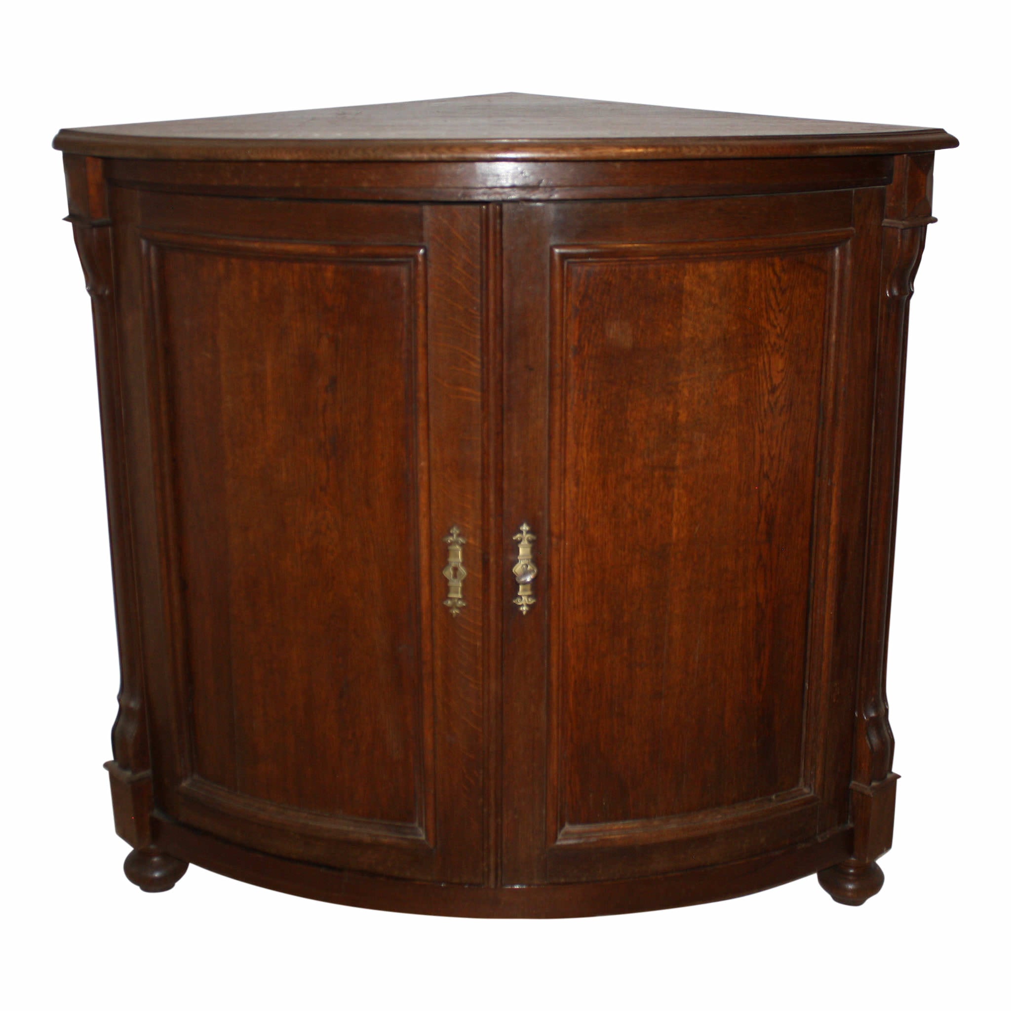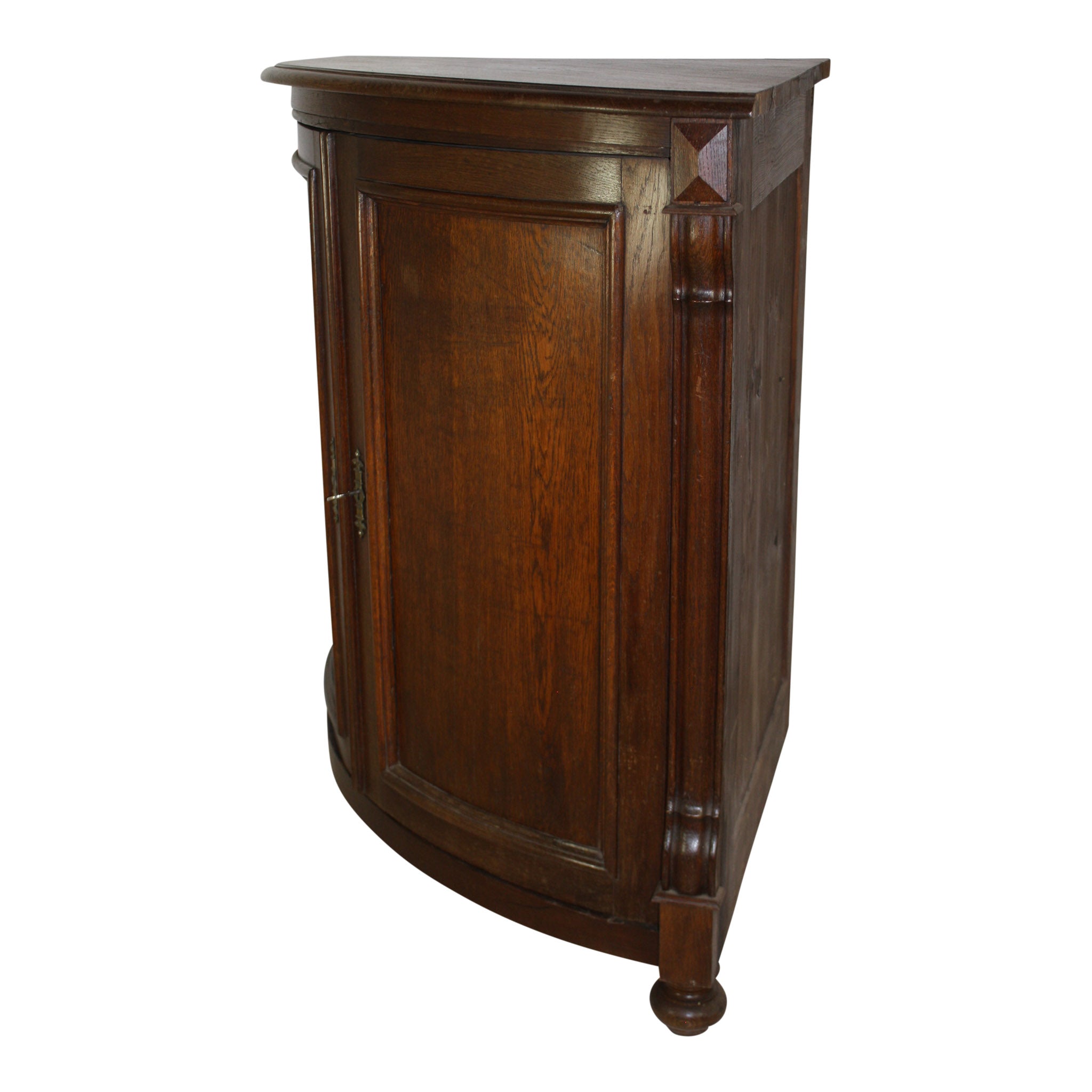 Crafted in Germany at the beginning of the 20th century, this corner cabinet combines timeless craftsmanship with sleek design. Its curved bow-front and rich oak finish create a striking focal point while maximizing corner space. Perfect for displaying cherished items on top while adding generous storage inside, the cabinet features double doors that open to two fixed shelves. Resting on turned bun feet, the cabinet is just over 40 inches tall.