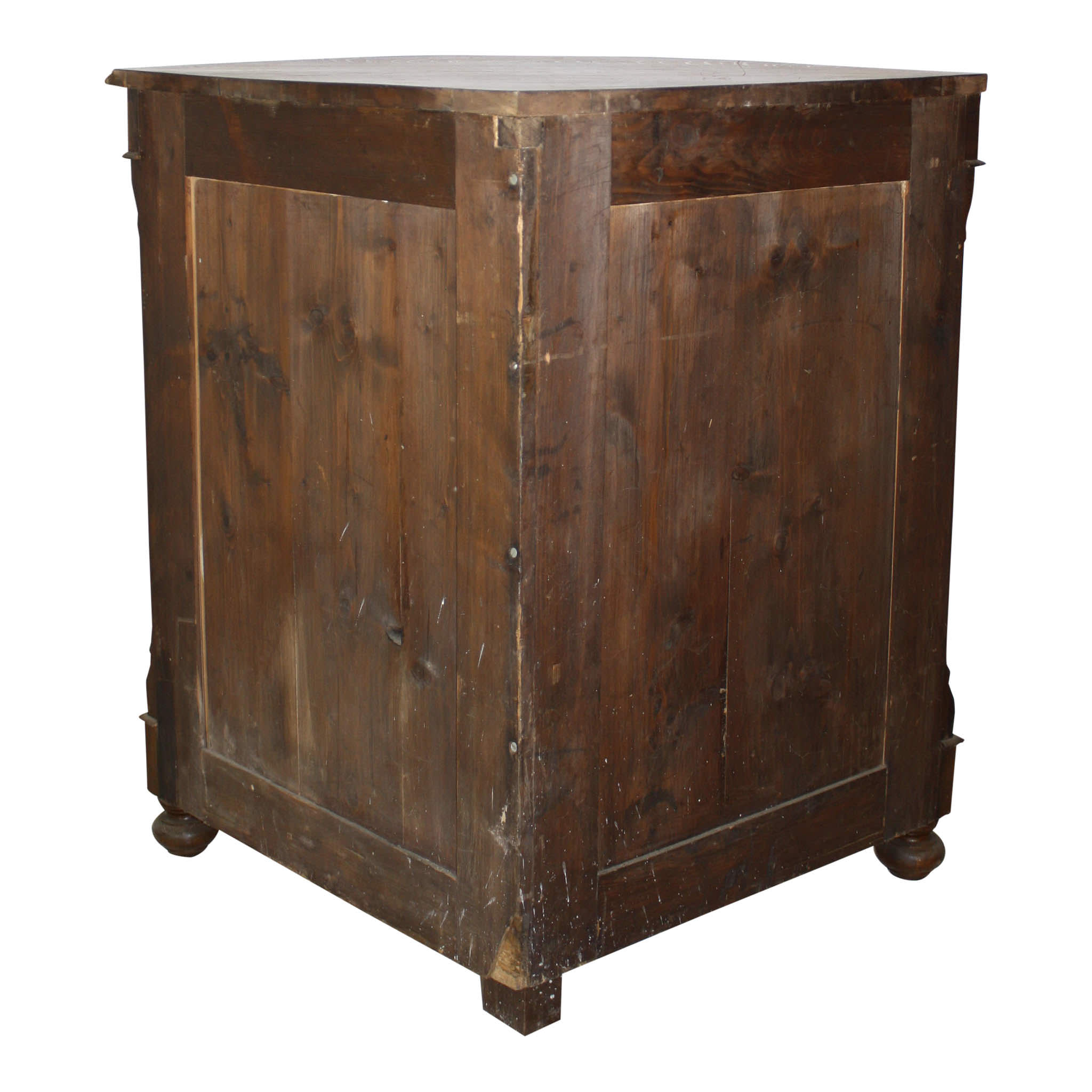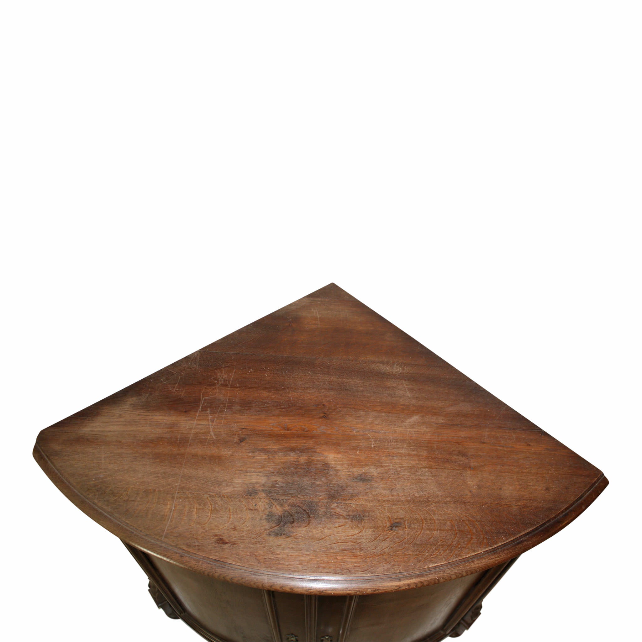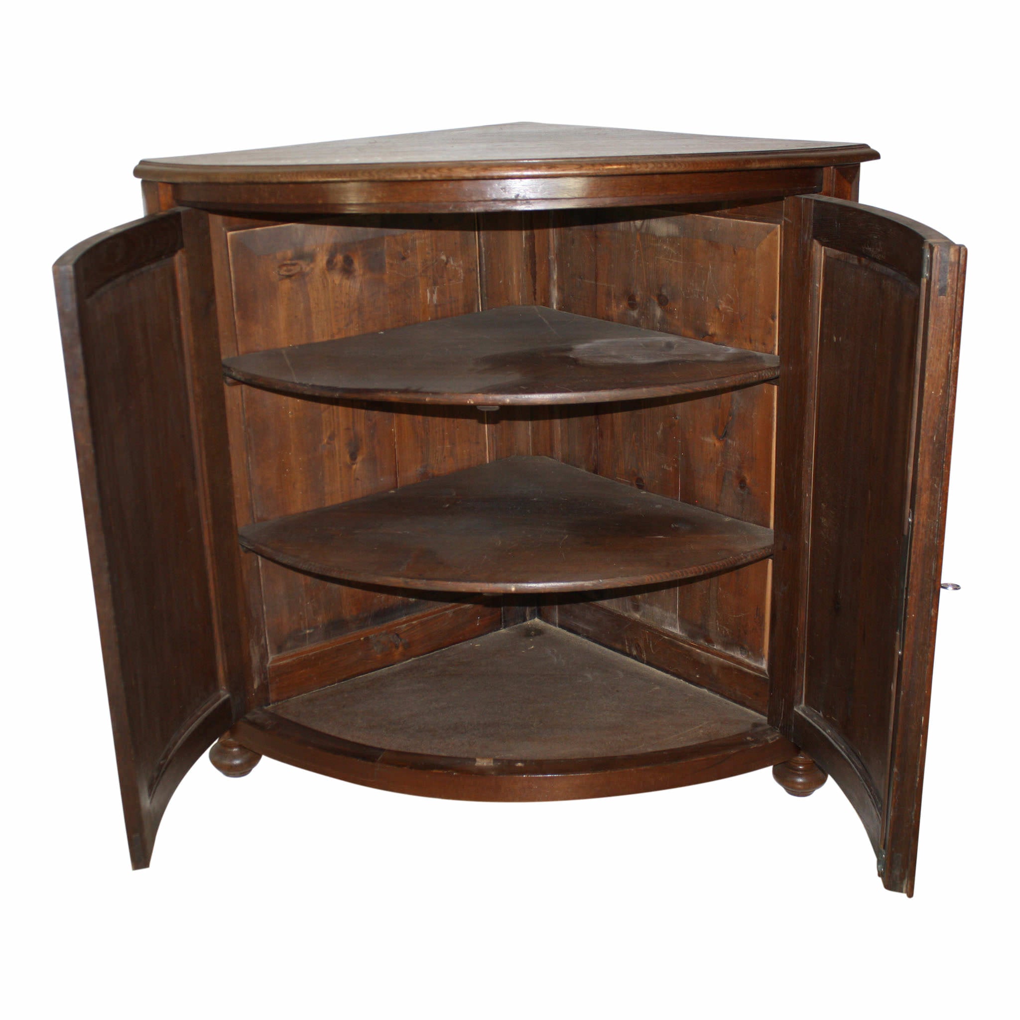Crafted in Germany at the beginning of the 20th century, this corner cabinet combines timeless craftsmanship with sleek design. Its curved bow-front and rich oak finish create a striking focal point while maximizing corner space. Perfect for displaying cherished items on top while adding generous storage inside, the cabinet features double doors that open to two fixed shelves. Resting on turned bun feet, the cabinet is just over 40 inches tall.
