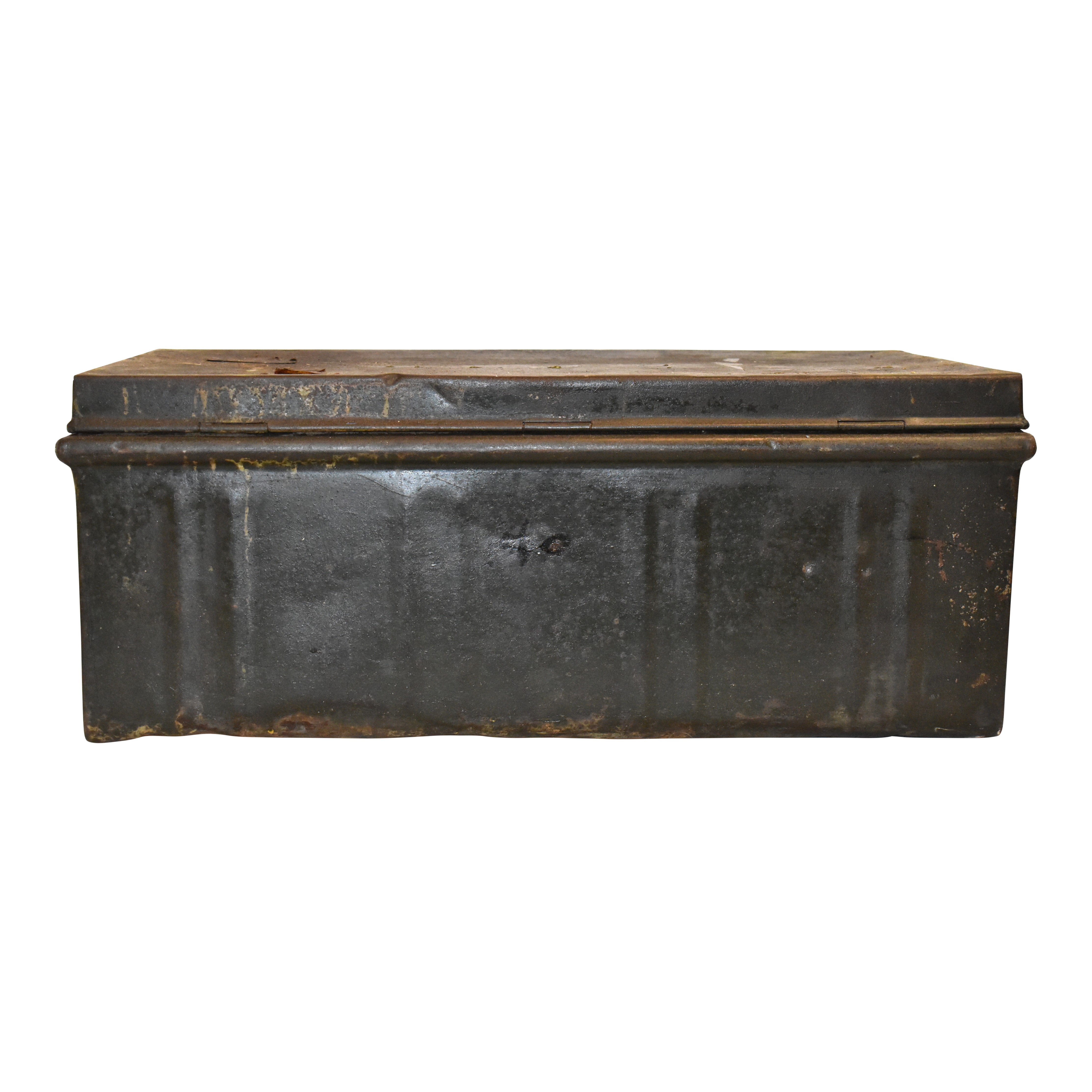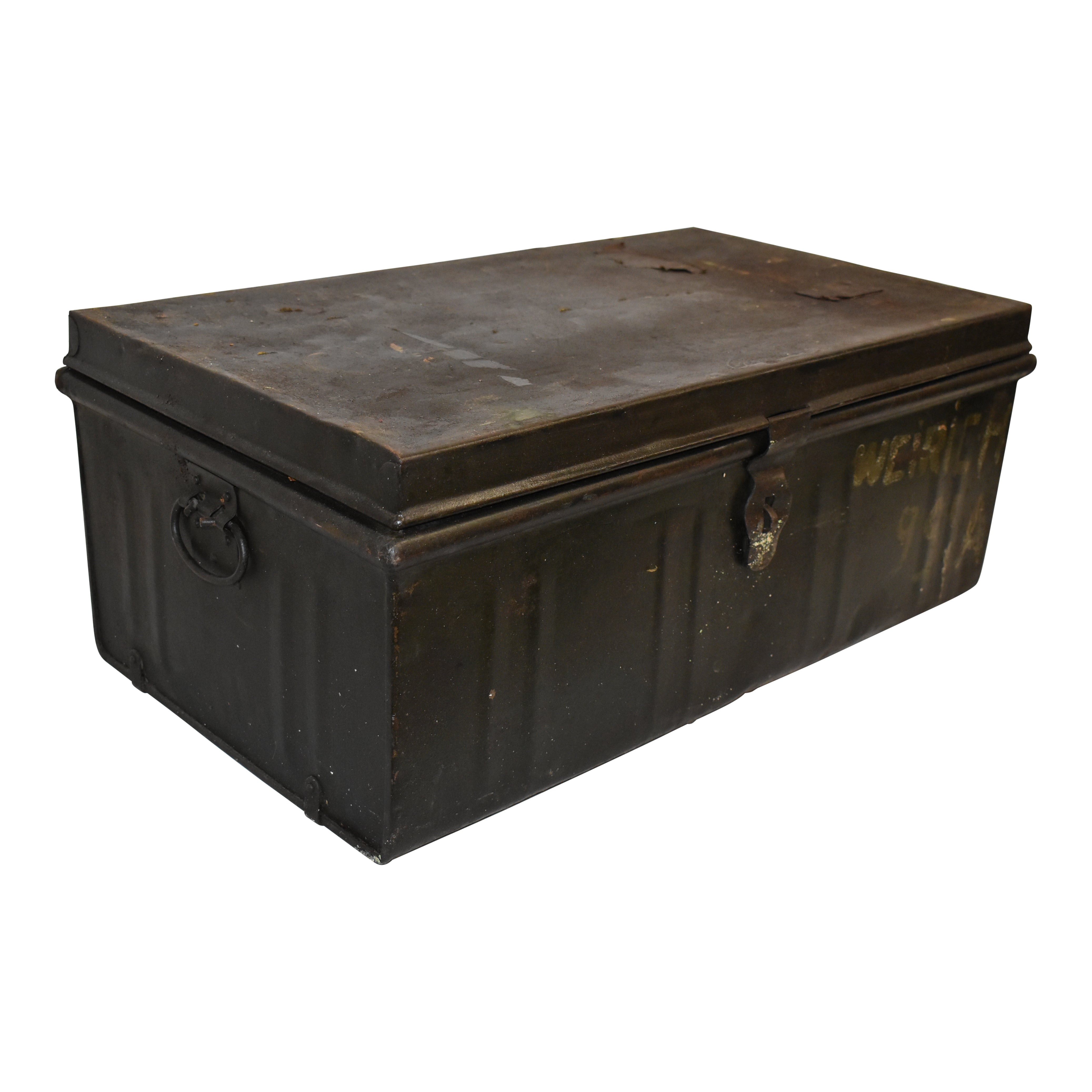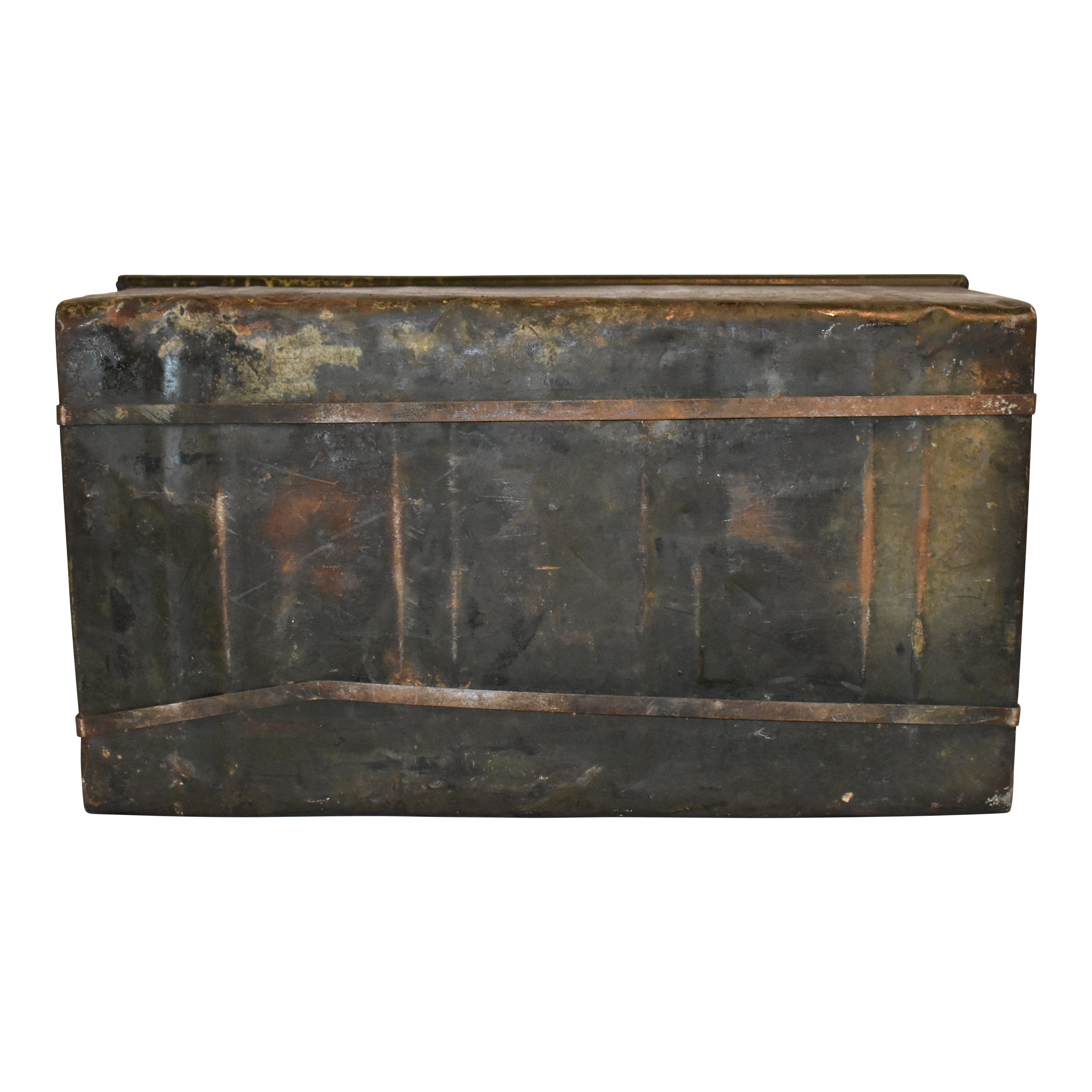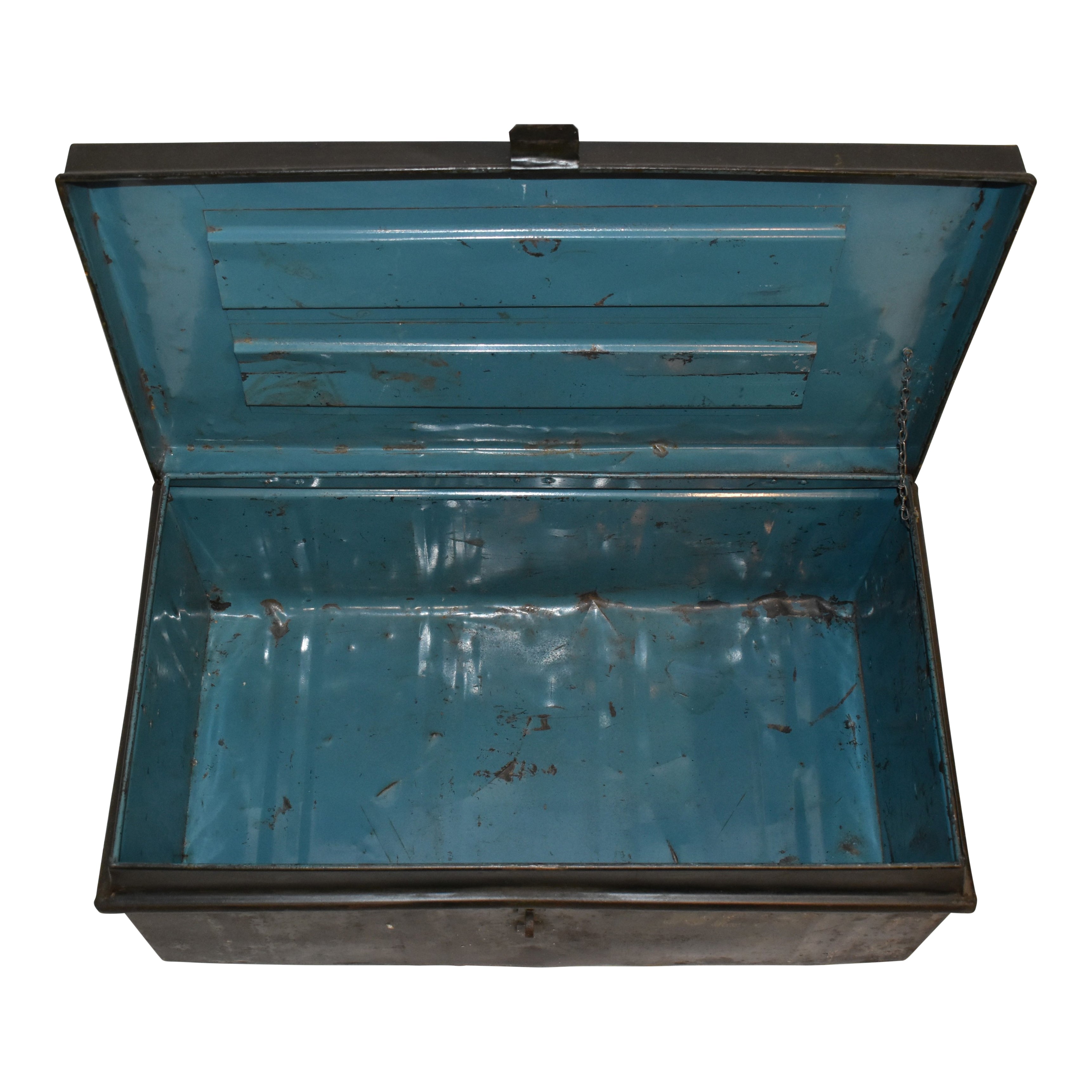Add a touch of old-world charm to your decor with this classic travel trunk. Both stylish and functional, its hinged lid opens to generous storage. Made of durable metal, the timeworn marks of wear and discoloration add to its unique look. The trunk features a center latch, two side handles, and a blue interior.