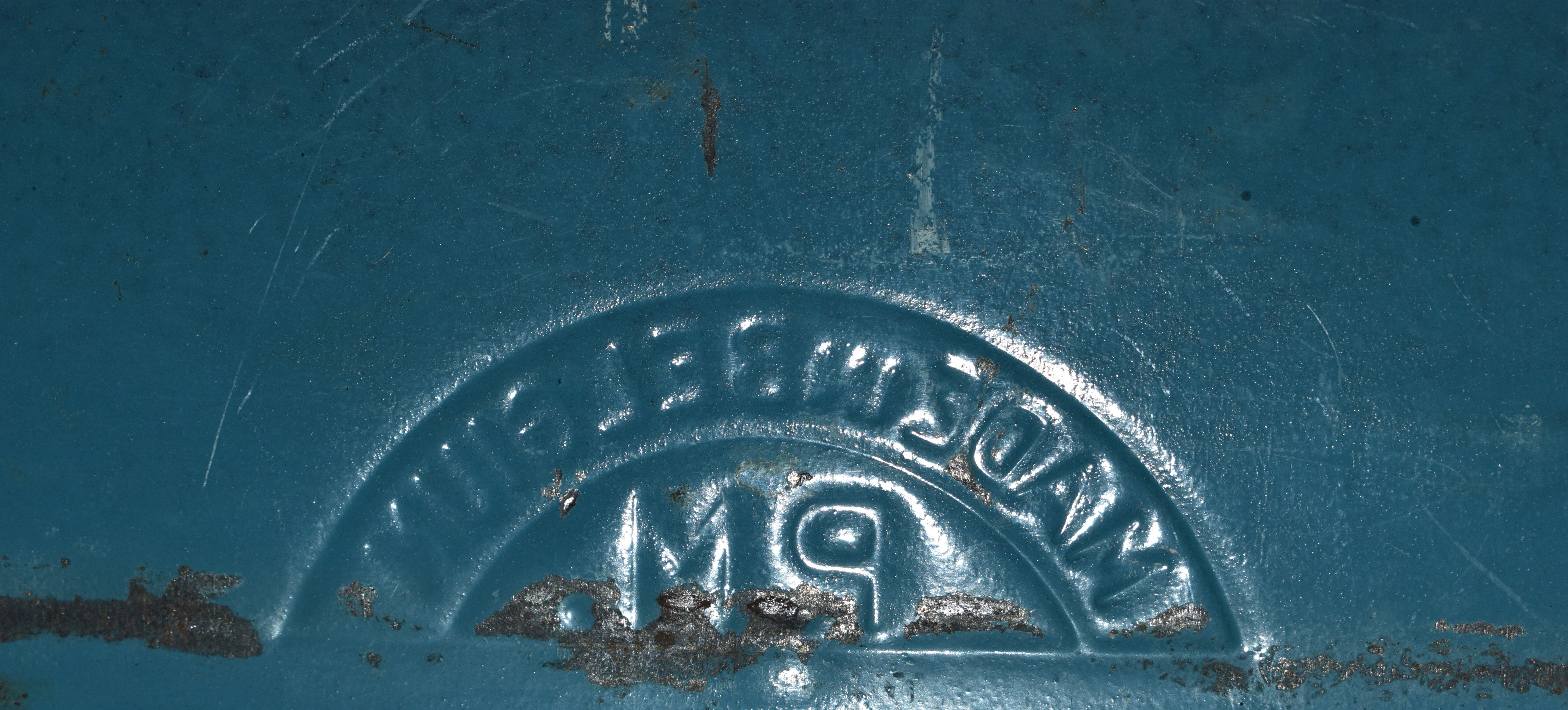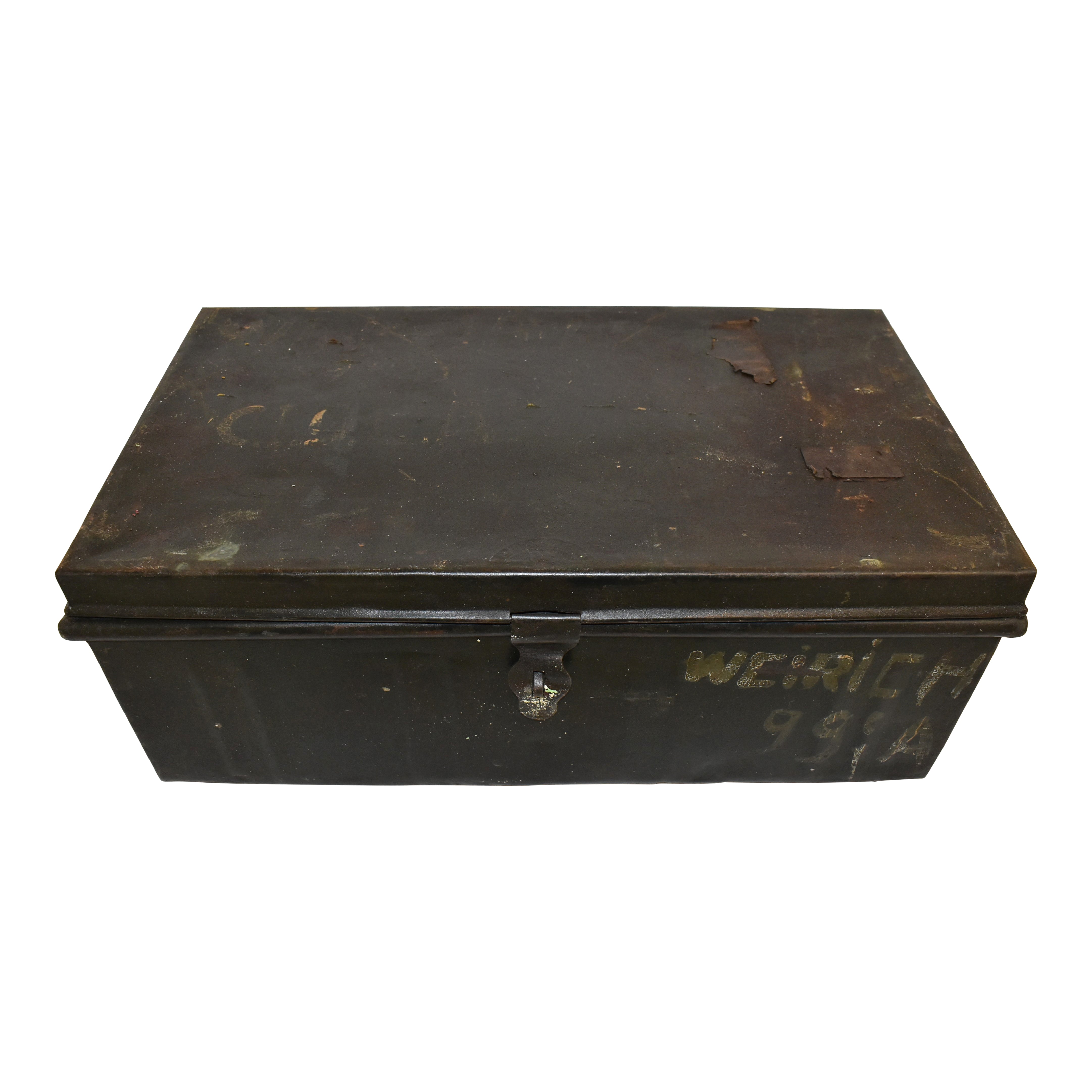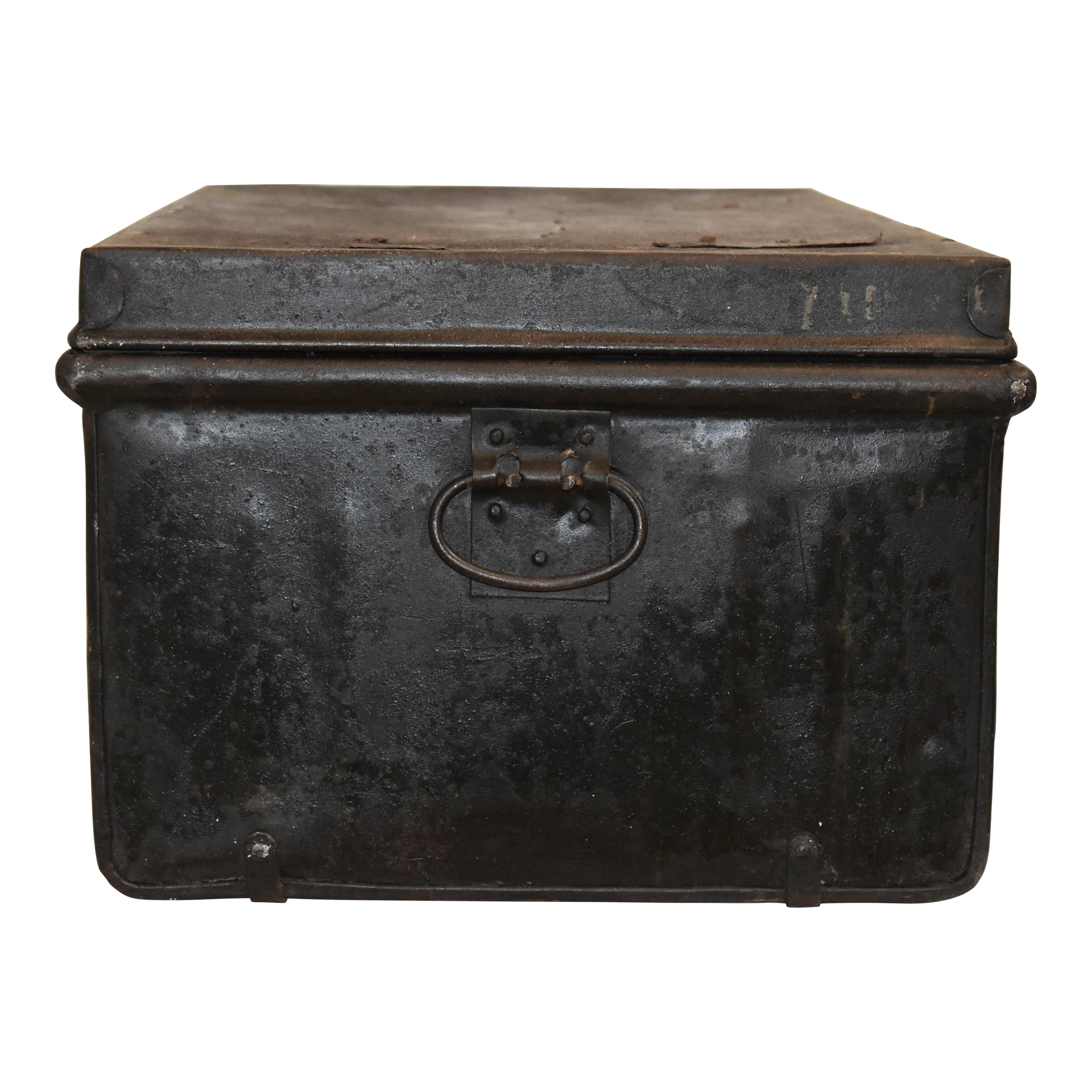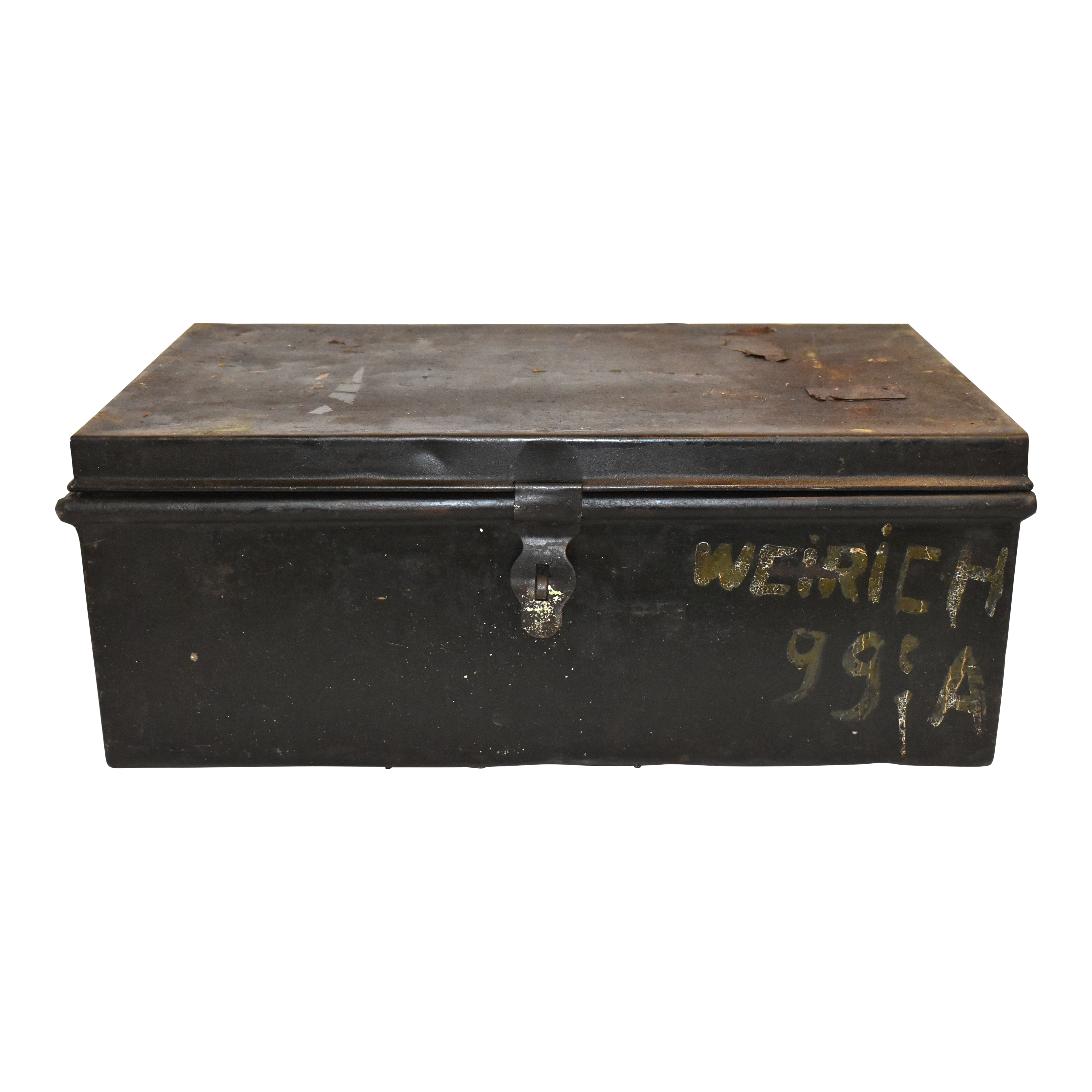 Add a touch of old-world charm to your decor with this classic travel trunk. Both stylish and functional, its hinged lid opens to generous storage. Made of durable metal, the timeworn marks of wear and discoloration add to its unique look. The trunk features a center latch, two side handles, and a blue interior.