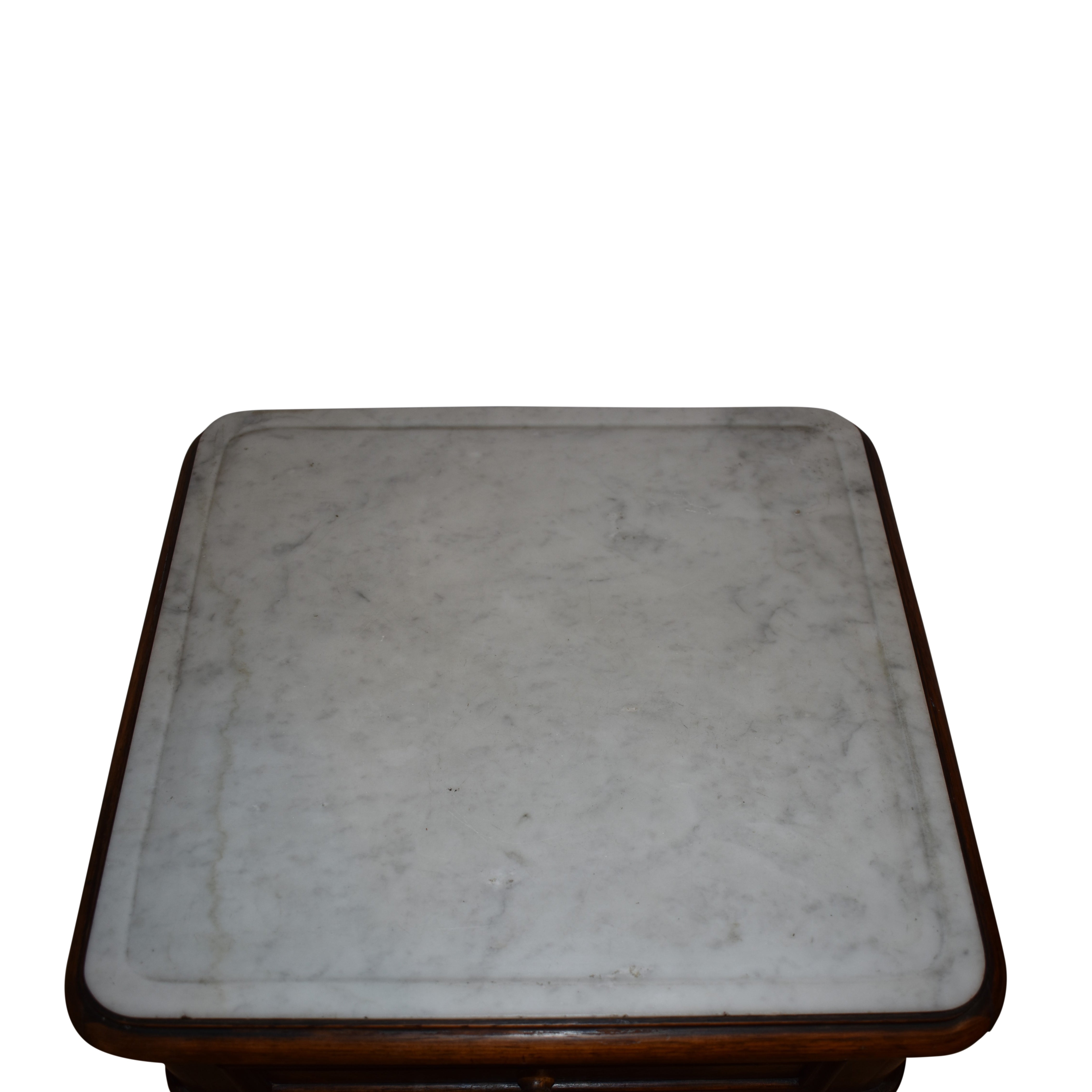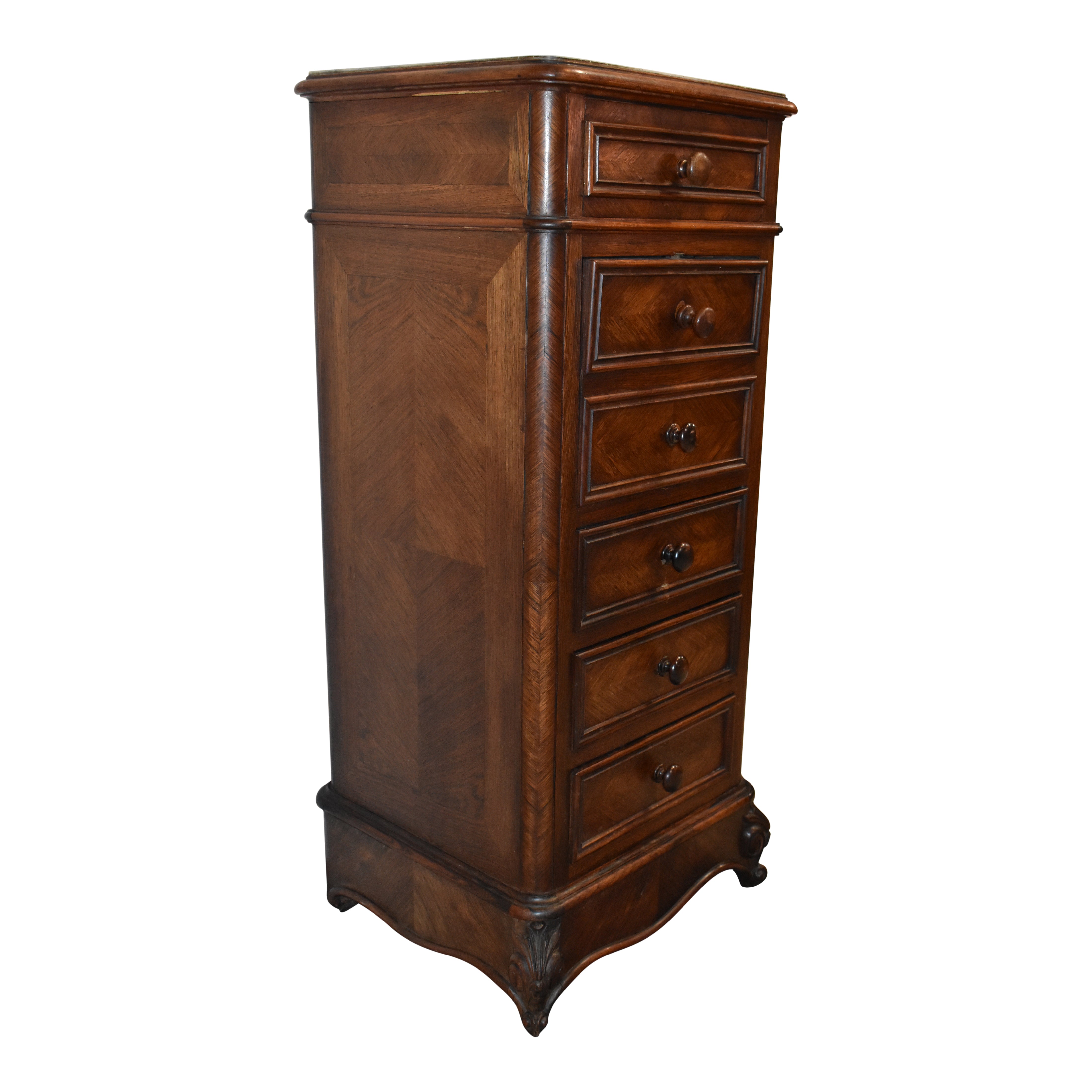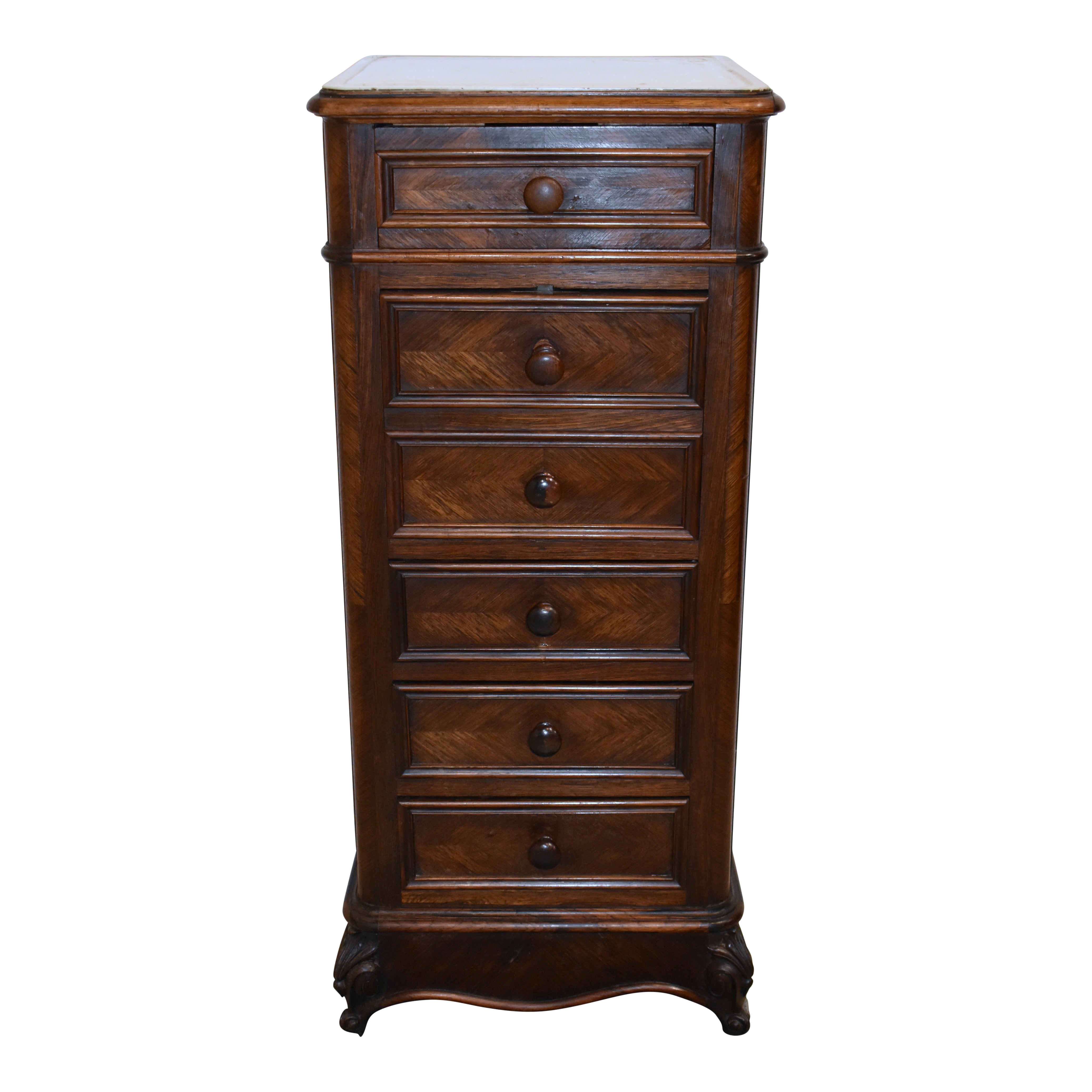 Crafted in France at the end of the 19th-century with a magnificient herringbone rosewood pattern, this delightful nightstand has a secret. The second and third drawers form a drop-down door that provided a place for a chamber pot right next to the bed. This space is lined with marble to protect the cabinet from spills and to keep the odor in. Four additional drawers are ideal for storing small items. The top showcases a beveled edge, rounded corners, and an inset piece of marble.