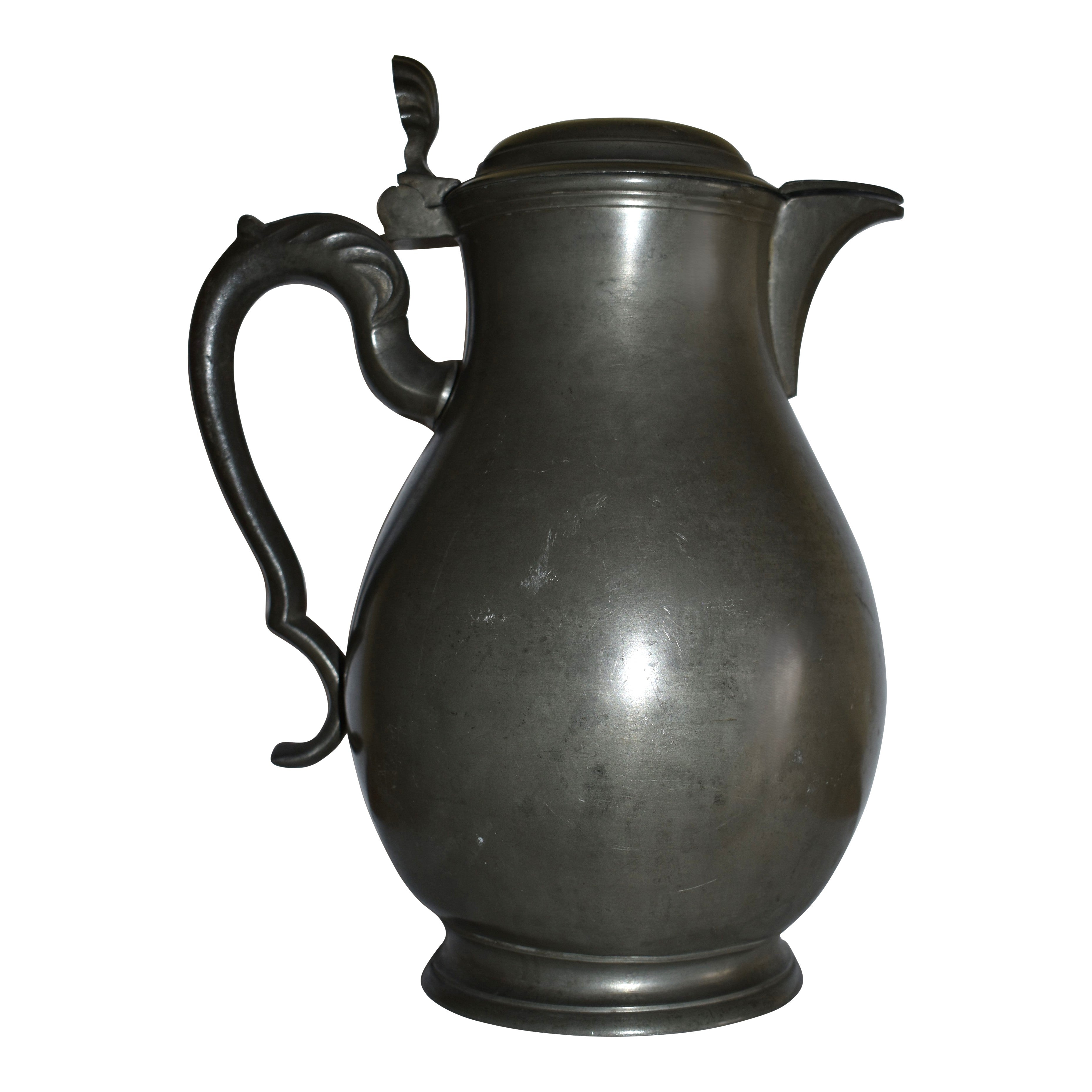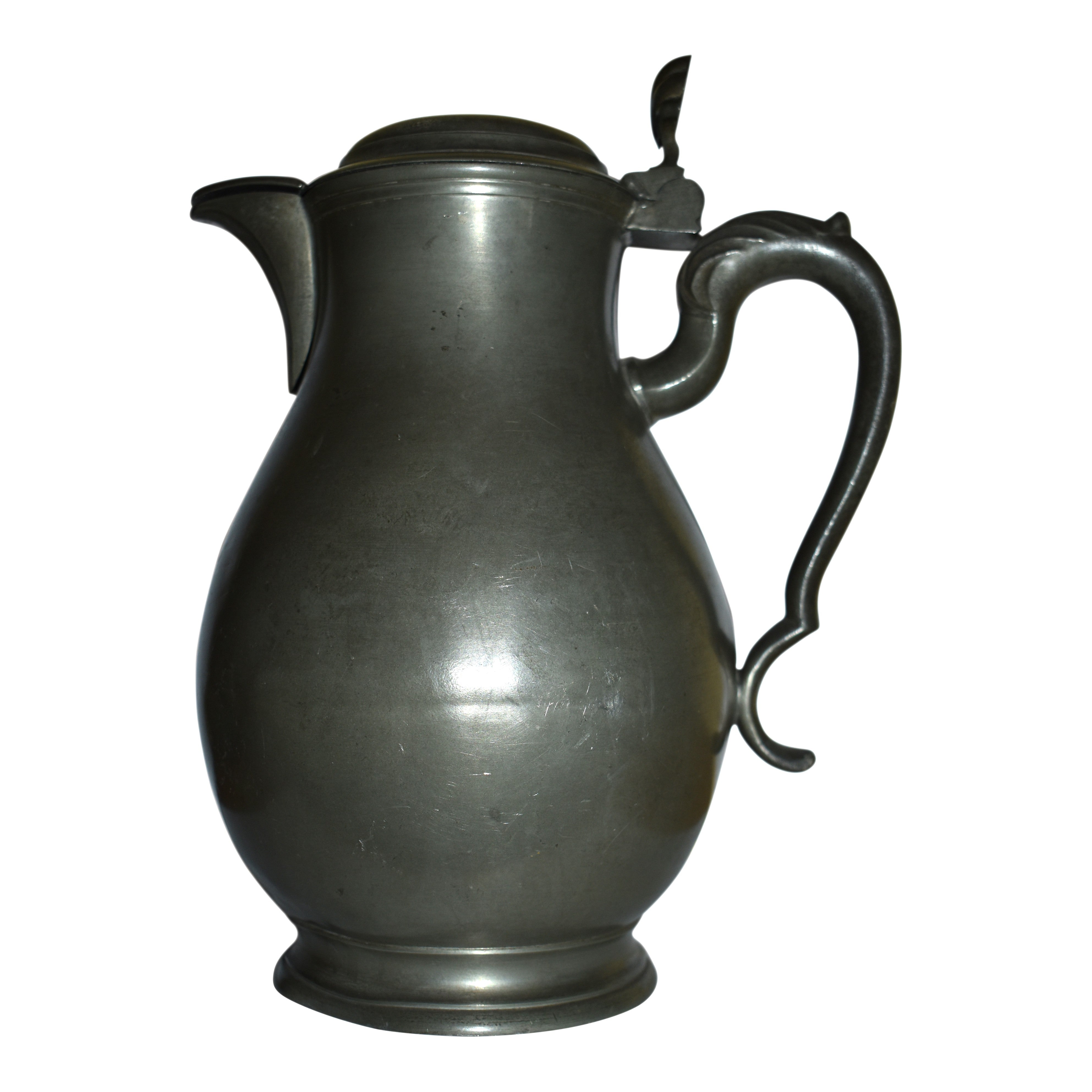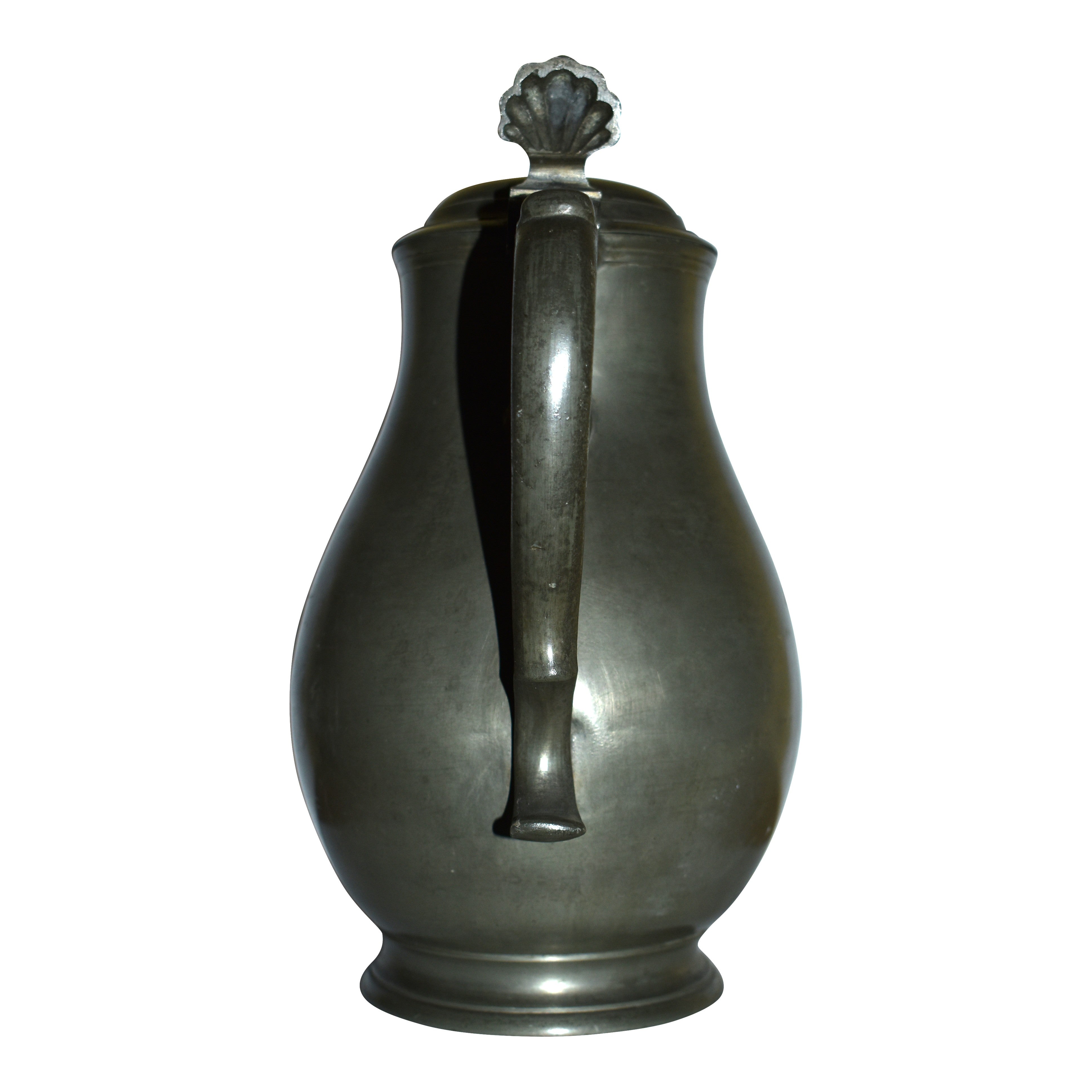 Crafted in the mid-18th century from pewter, this covered pitcher features a classic pot belly design, shell thumb lever, and stylish curved handle. Maker's marks on bottom of pitcher.