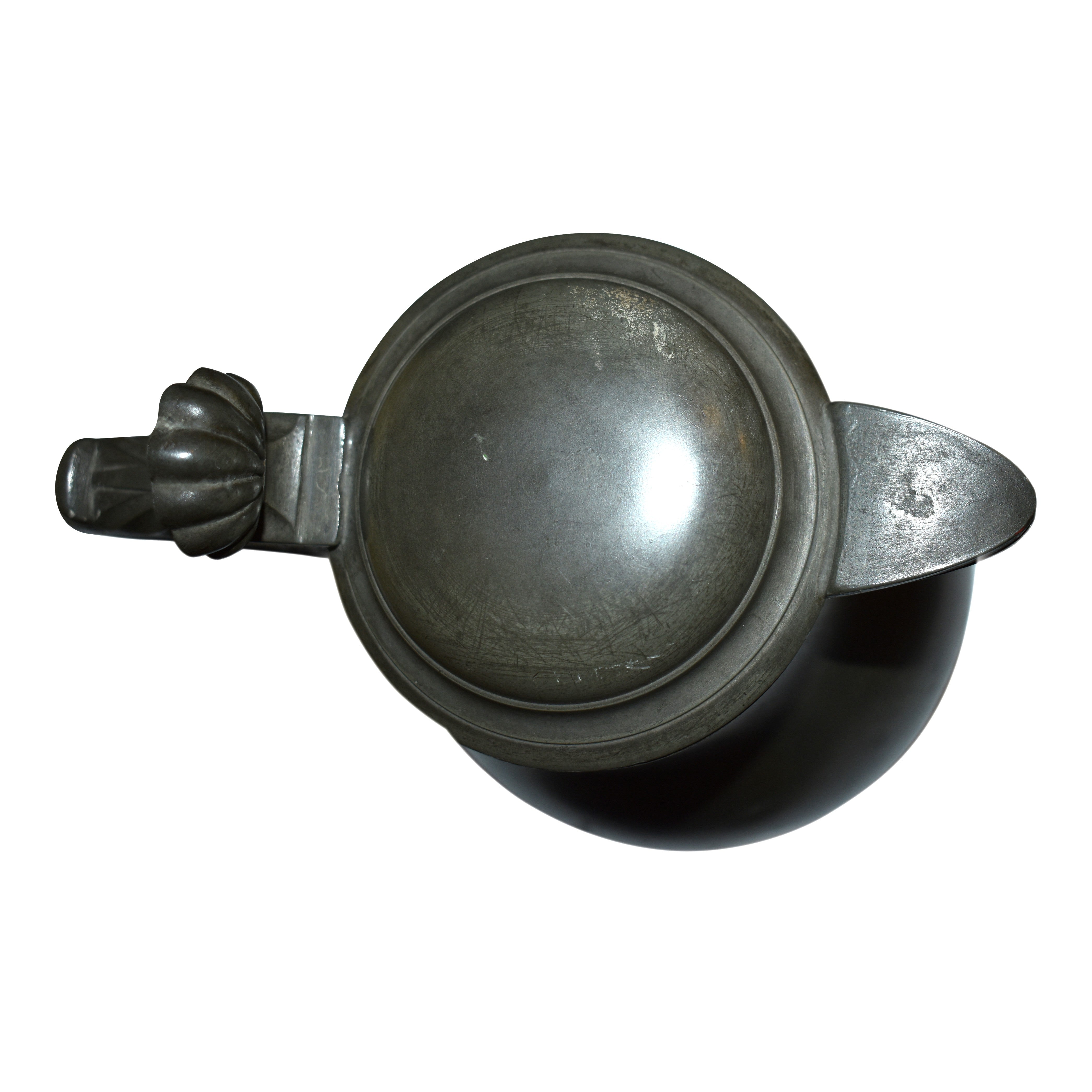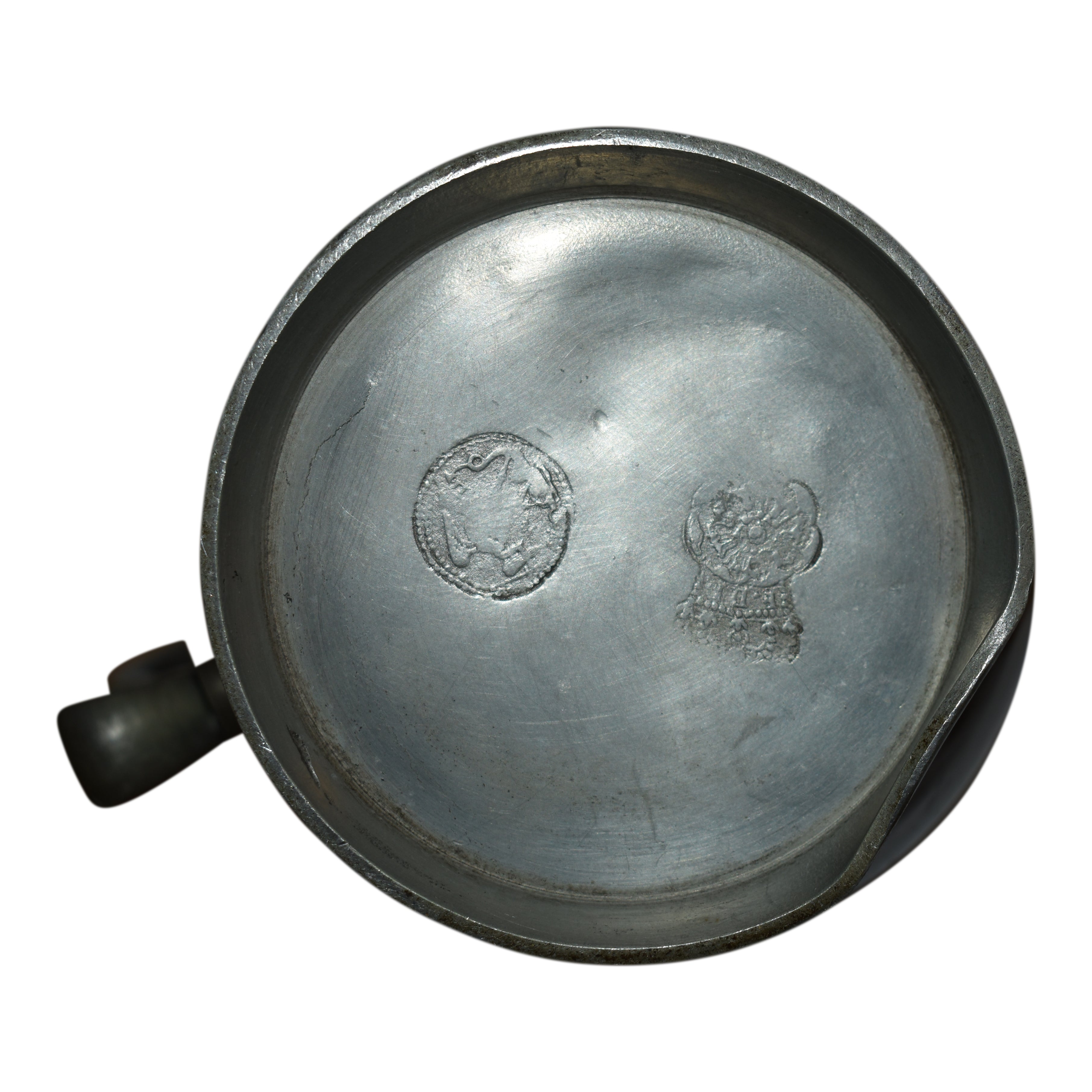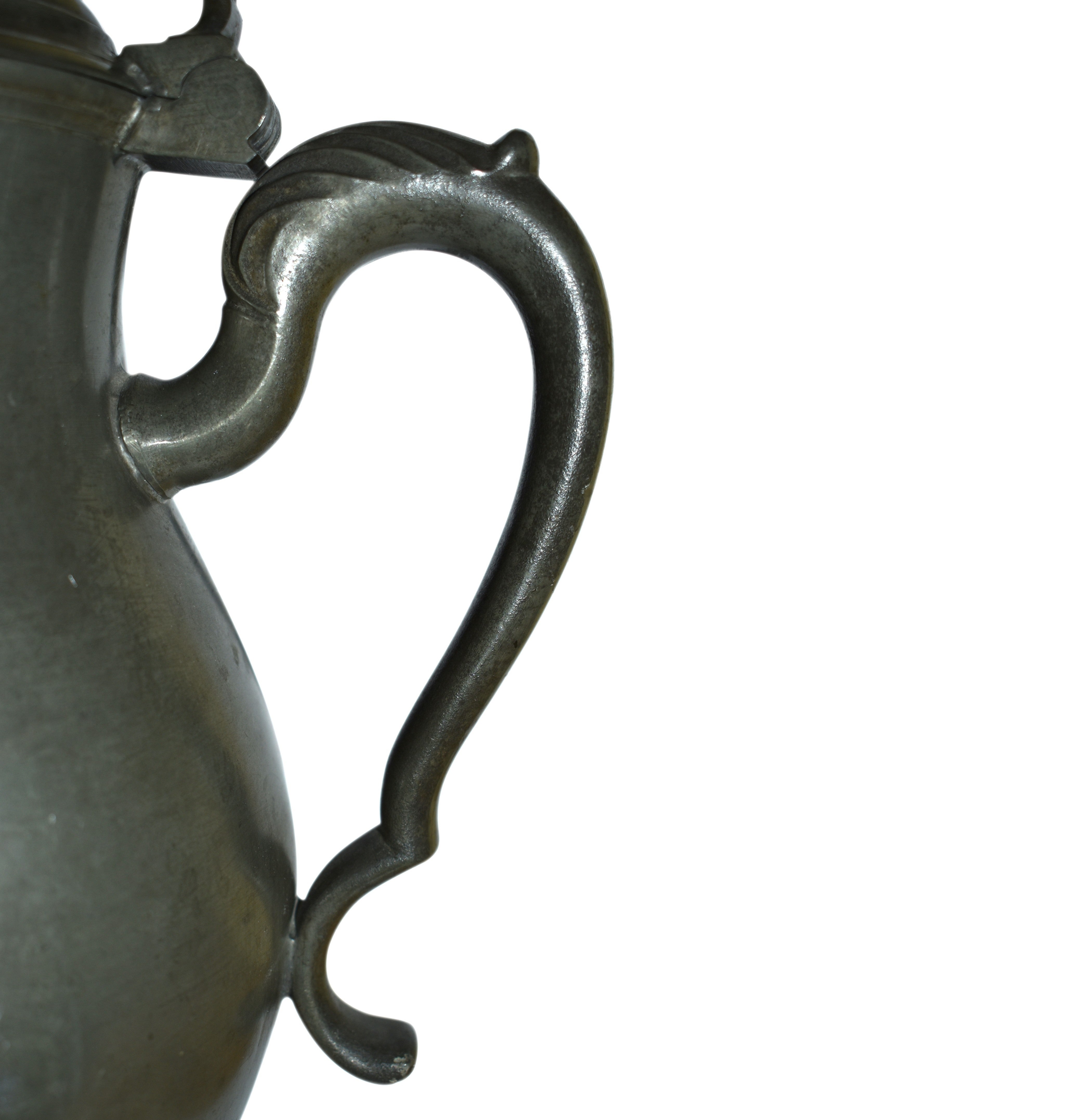 Crafted in the mid-18th century from pewter, this covered pitcher features a classic pot belly design, shell thumb lever, and stylish curved handle. Maker's marks on bottom of pitcher.