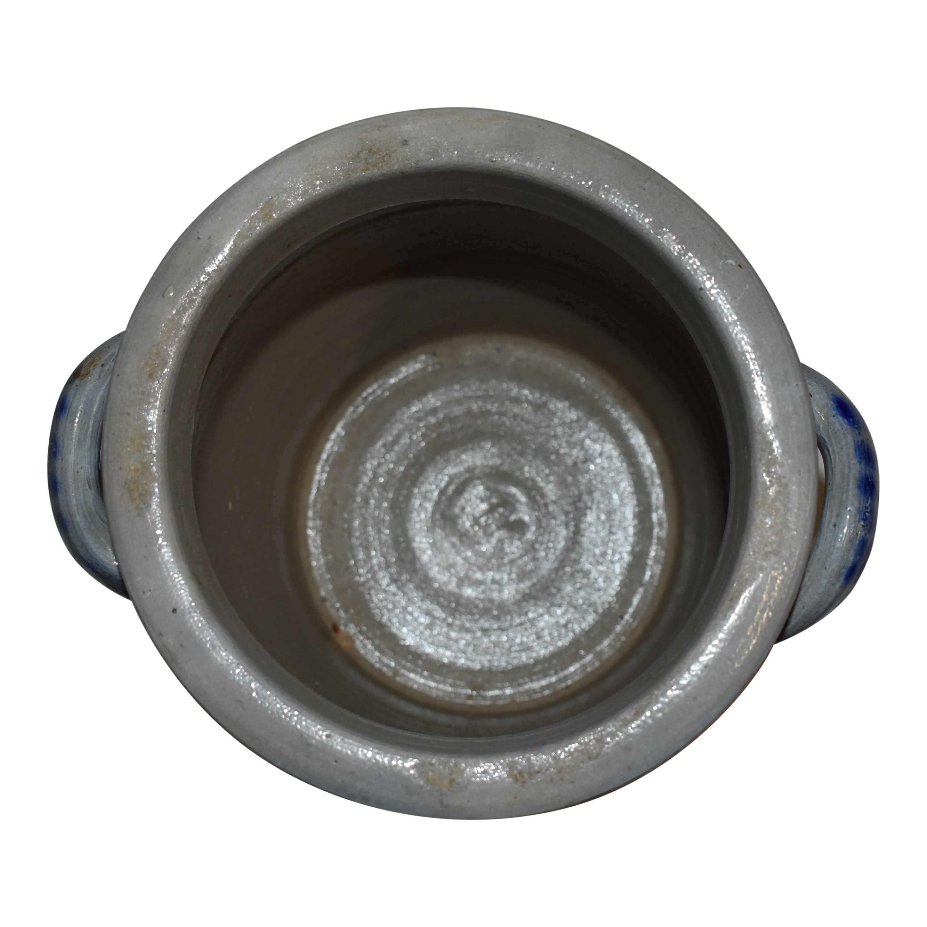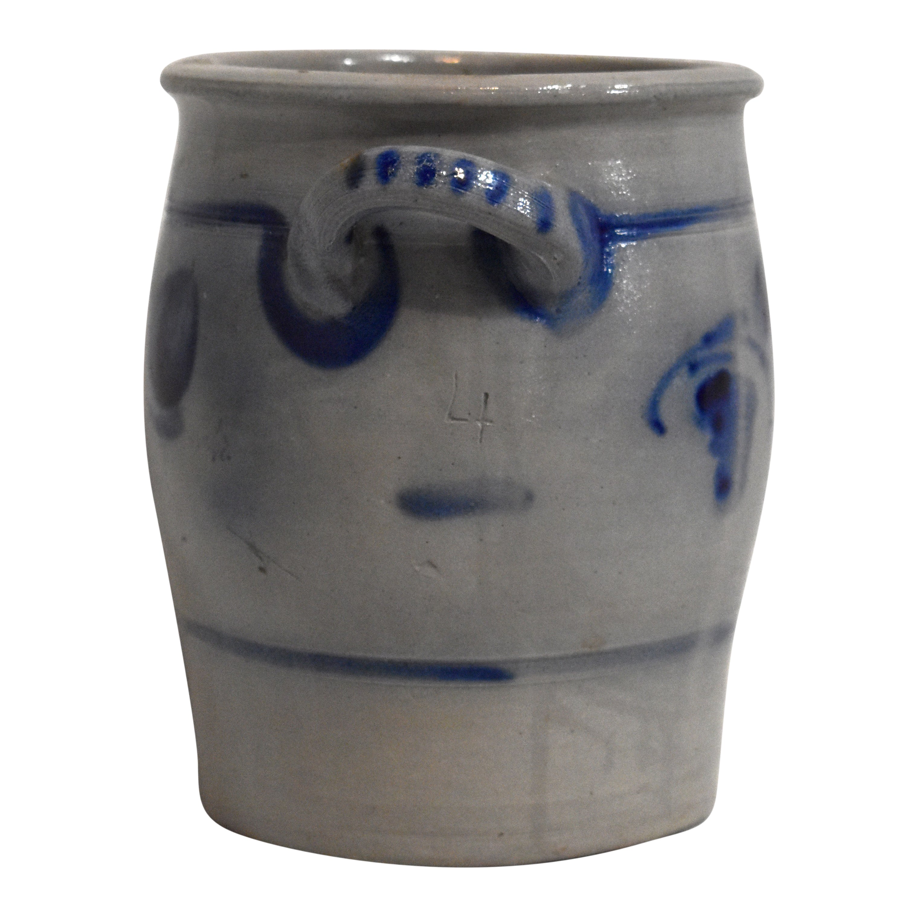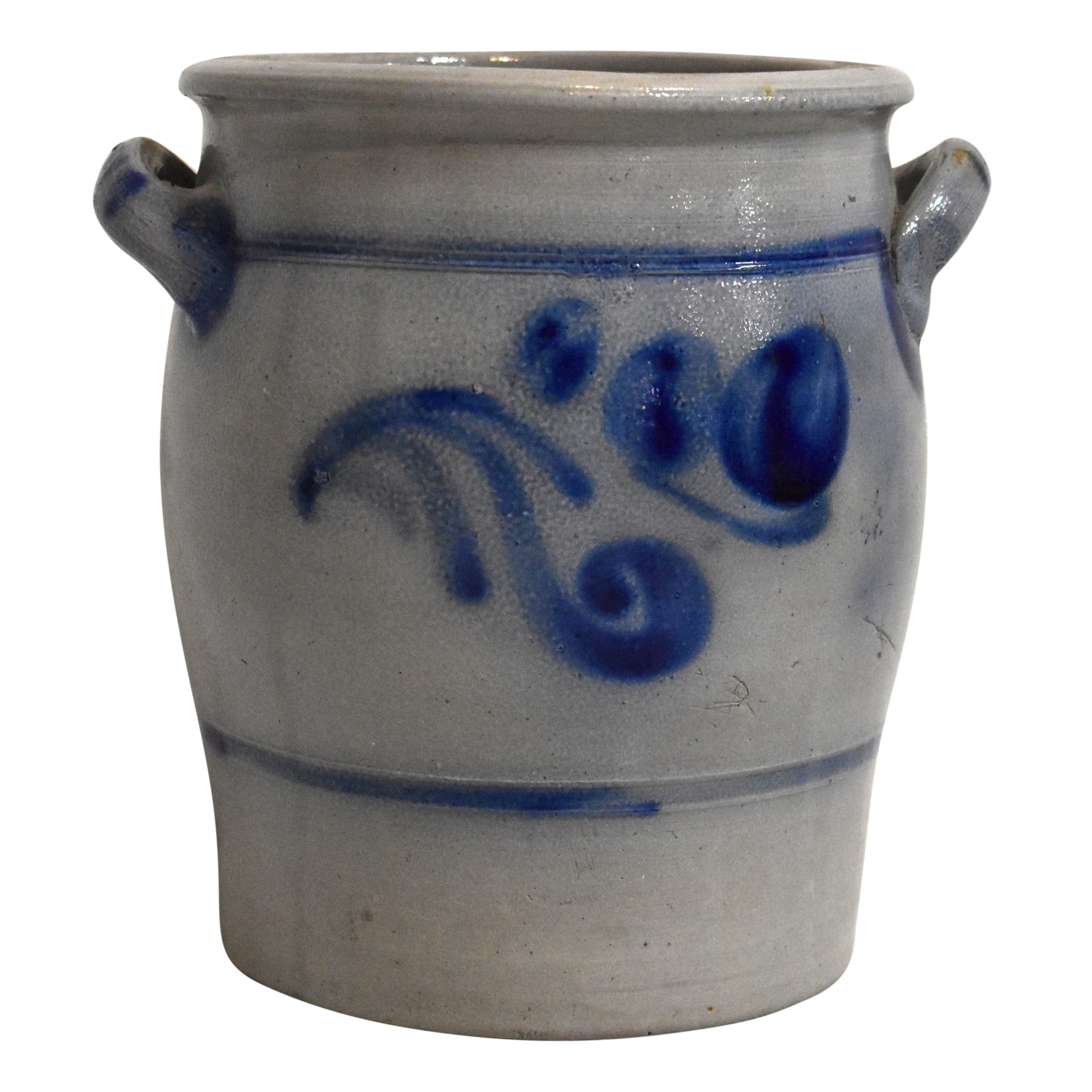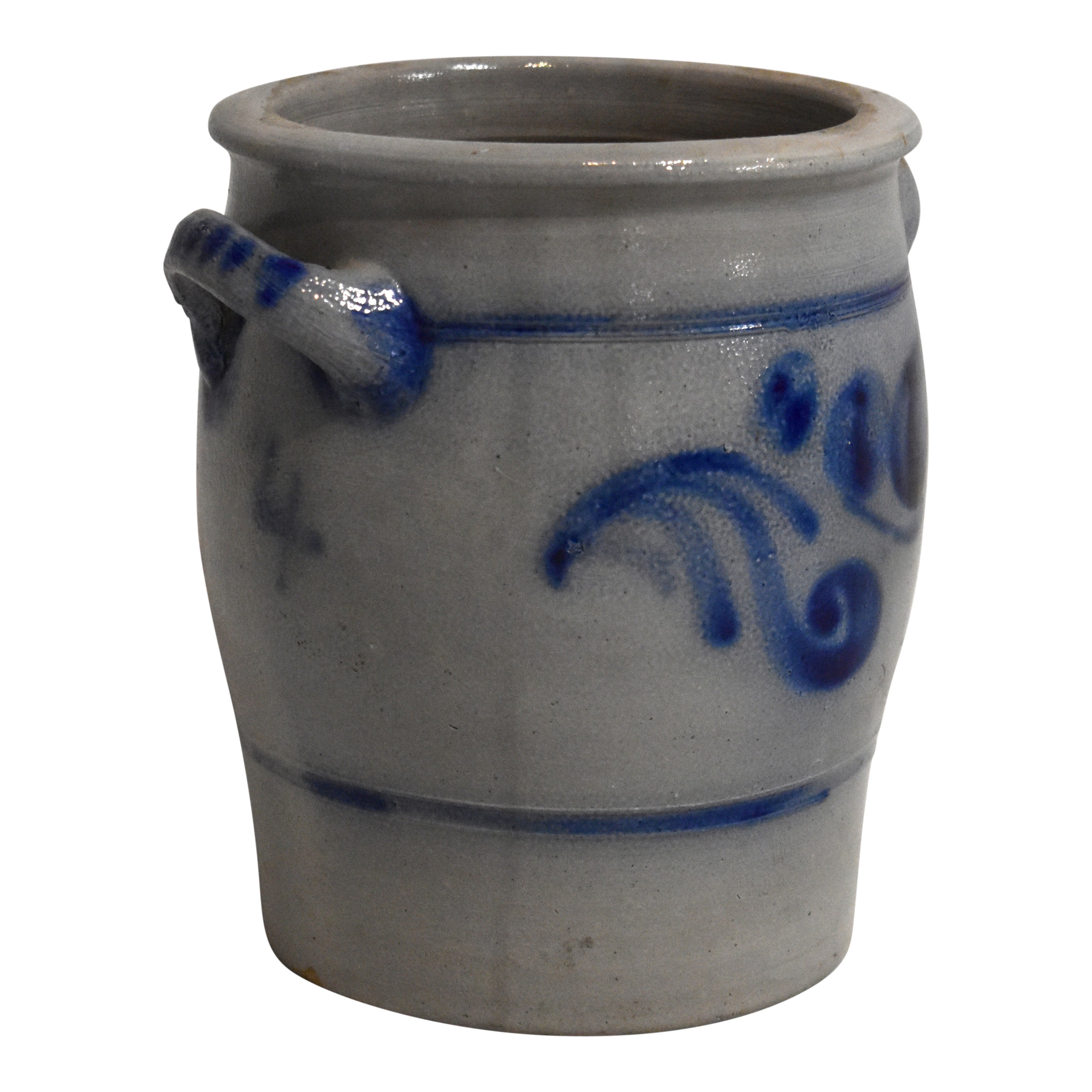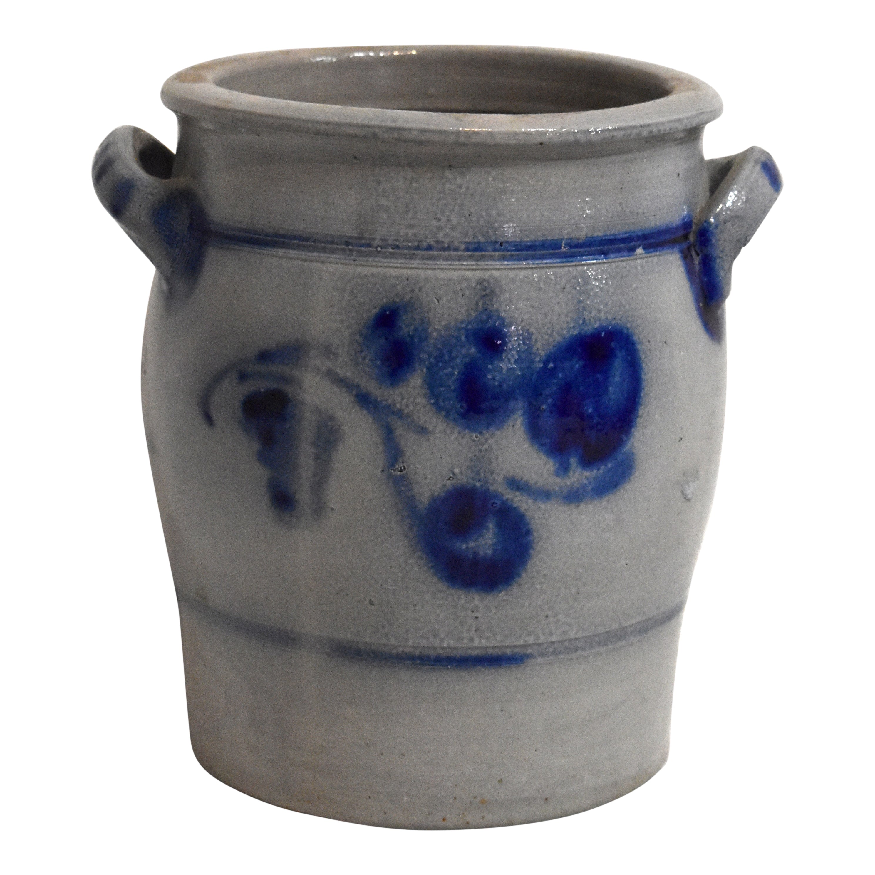Salt glaze stoneware dates back to the 1500's in Germany. While the pottery was fired, salt was added to the kiln to create a textured, nubby effect and a clear, glassy finish. This four liter open, ovoid shaped crock has two looped handles. Decorated with a rich, cobalt floral design, it brings old-world charm to any room.