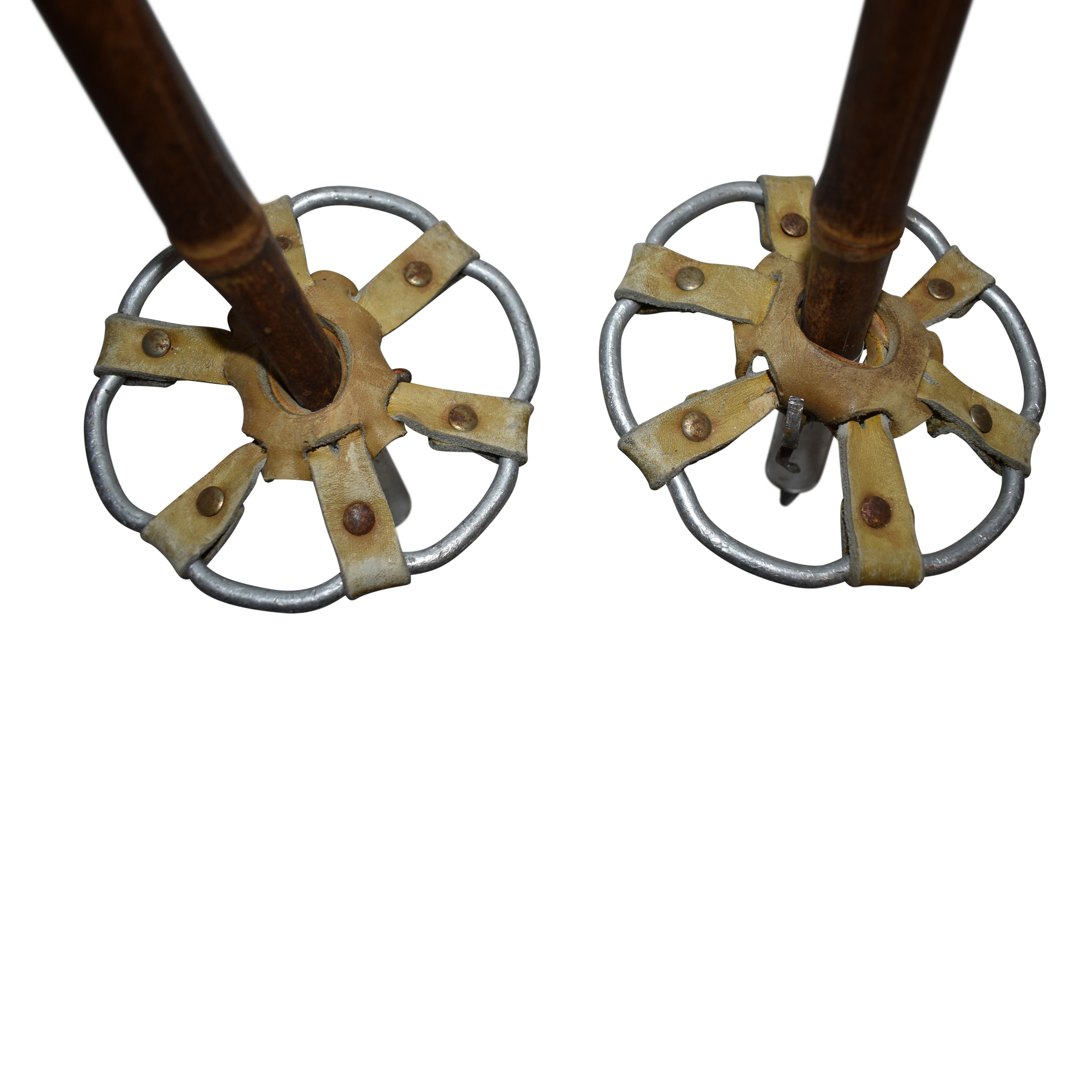Bring the thrill of the slopes inside with this vintage pair of ski poles! The set features lightweight bamboo sticks, leather hand grips, leather hand straps, and 4.75 inch metal baskets, which are secured to the poles with leather lacing.  Ski poles like this are a great addition to your mountain, cabin, lodge, or ski decor!