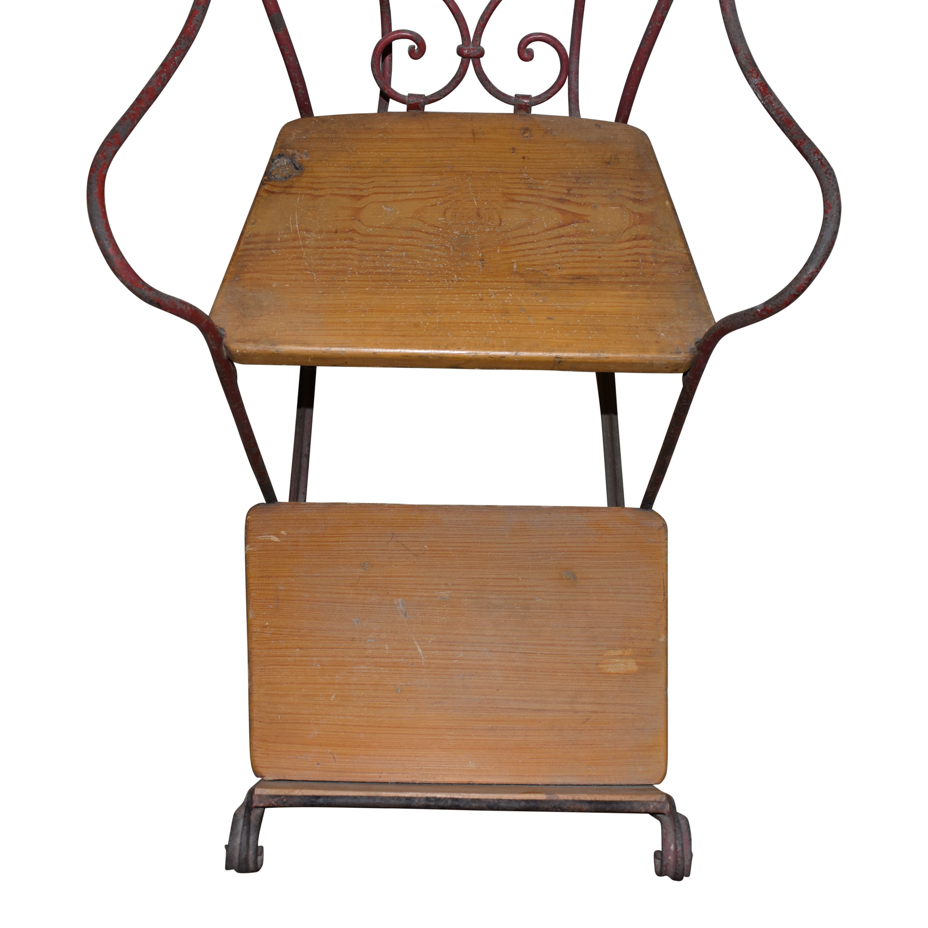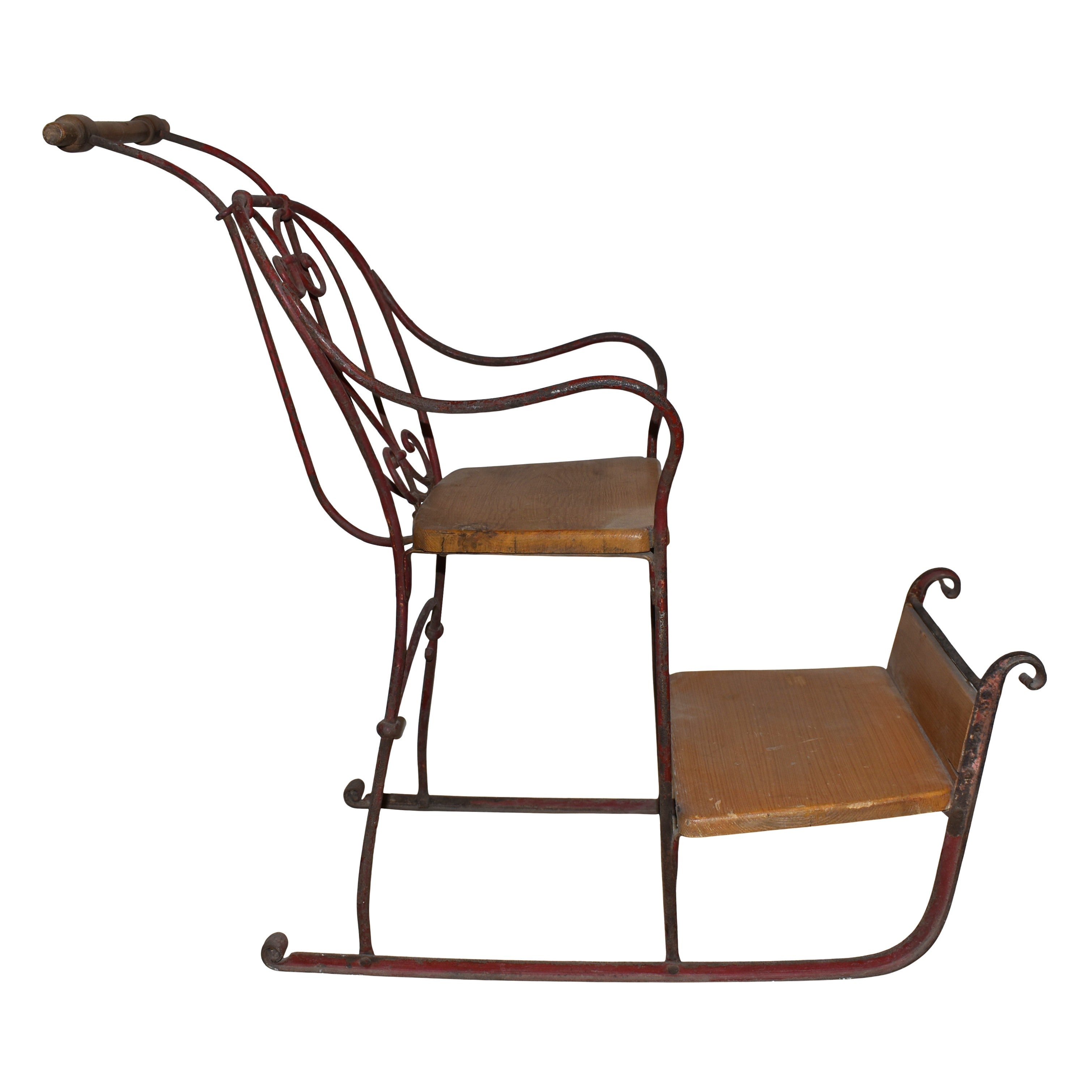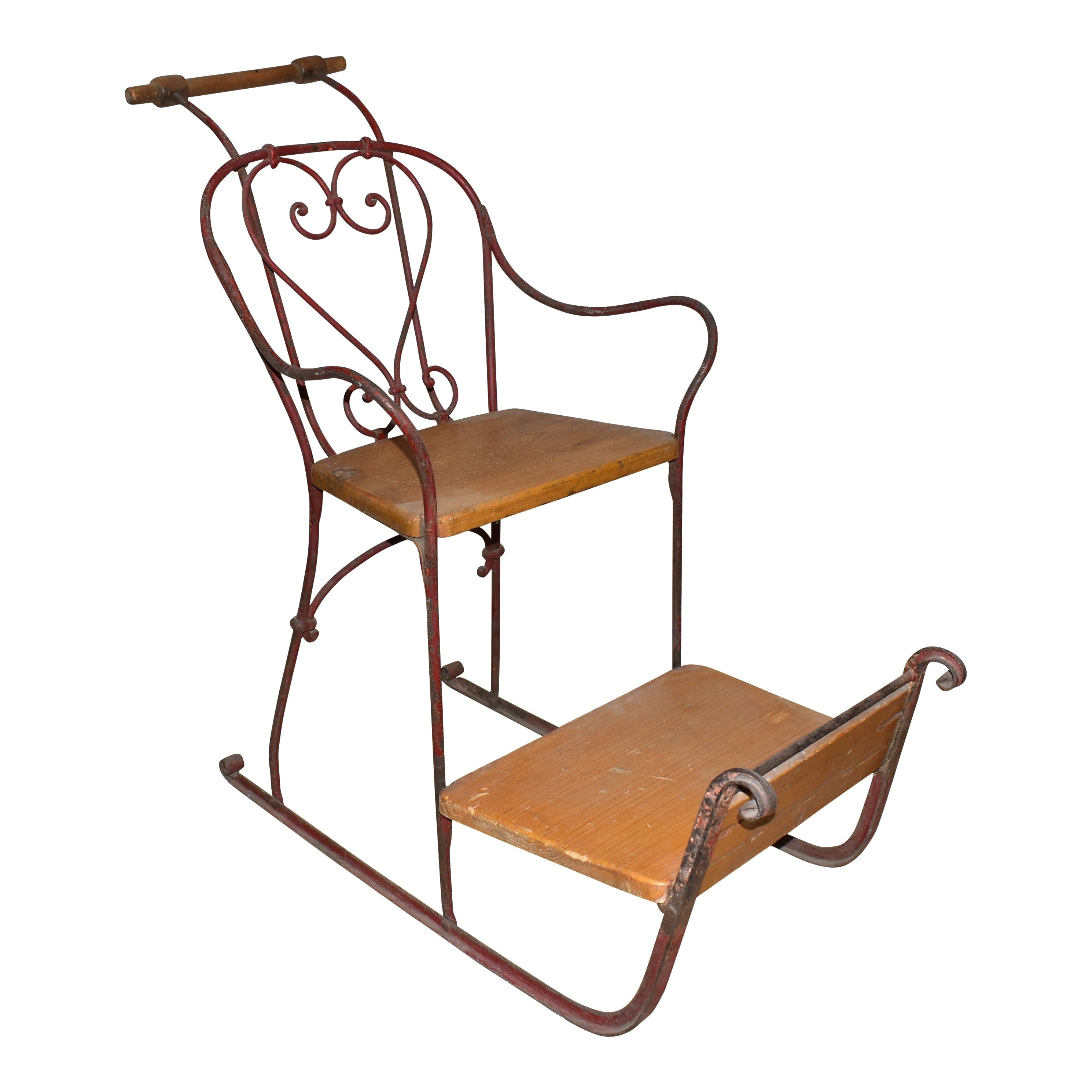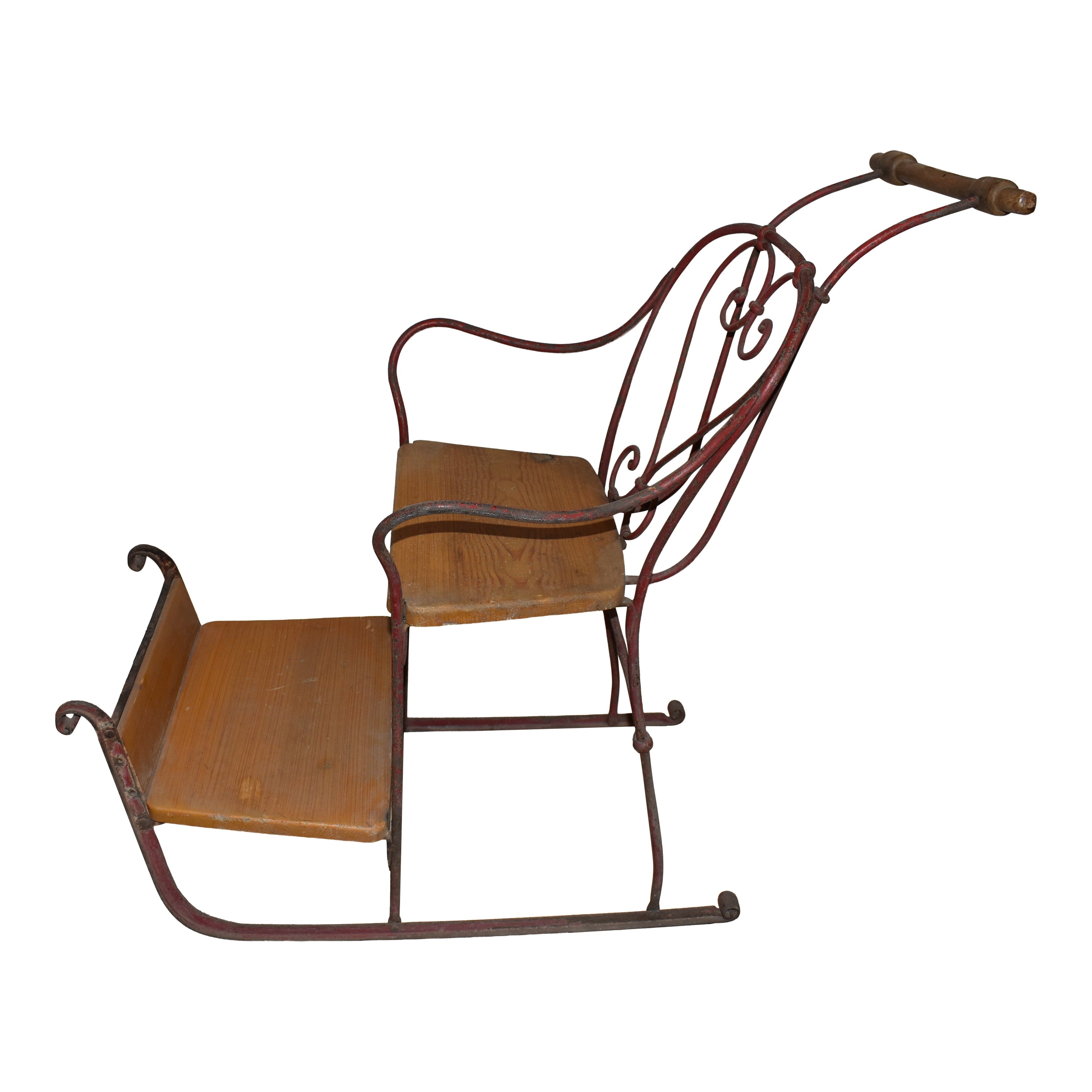 Designed as a manual kicksled with short runners for nimble maneuverability and quick turns, this delightful piece features a sturdy wooden seat and footrest secured to a metal frame. The sled was propelled by a driver behind the sled holding fast to the wooden handle that is secured to the chair's back. Ideal for use on slippery surfaces like ice or hard snowpack, the sled transformed ordinary snow days into adrenaline-pumping escapades.