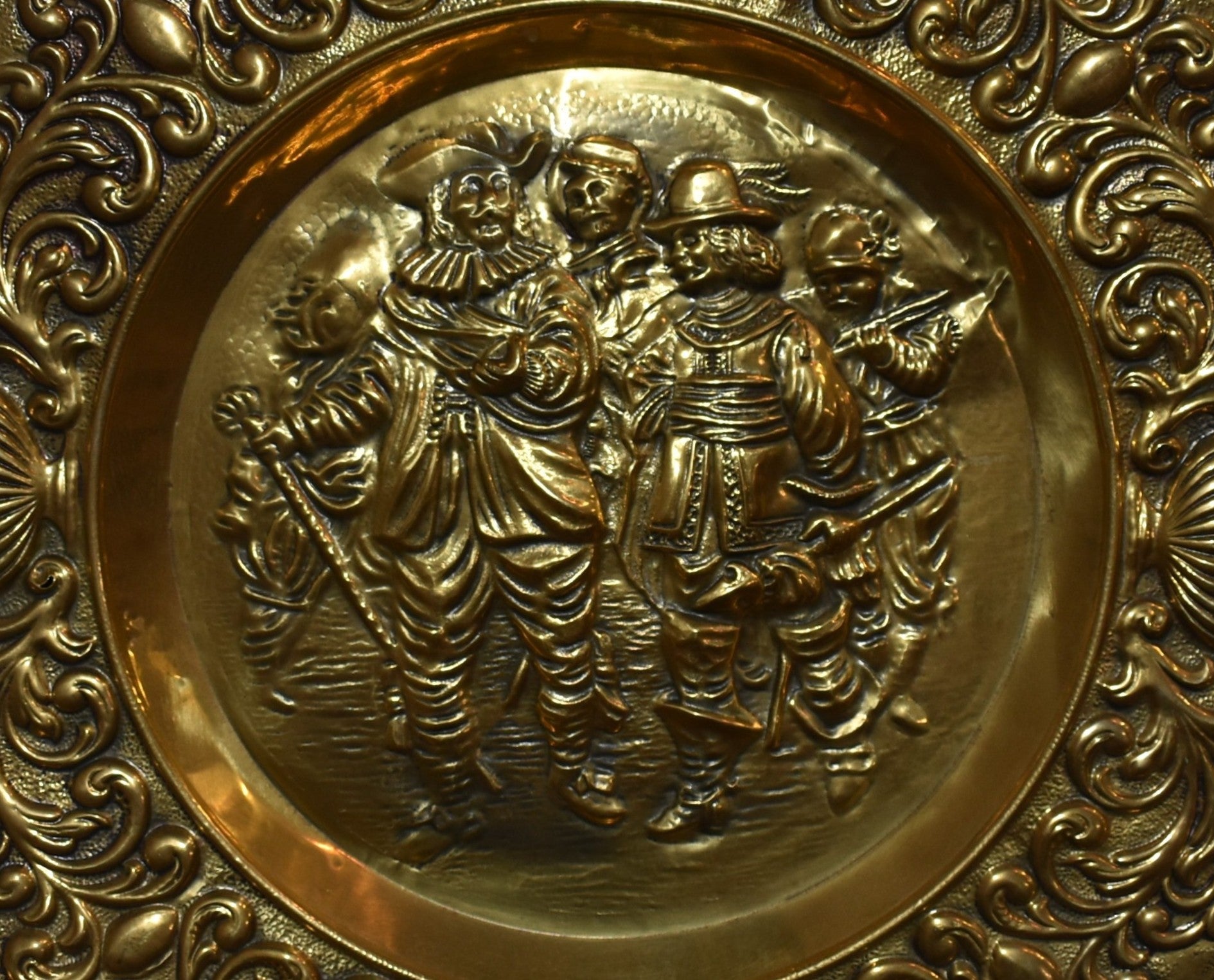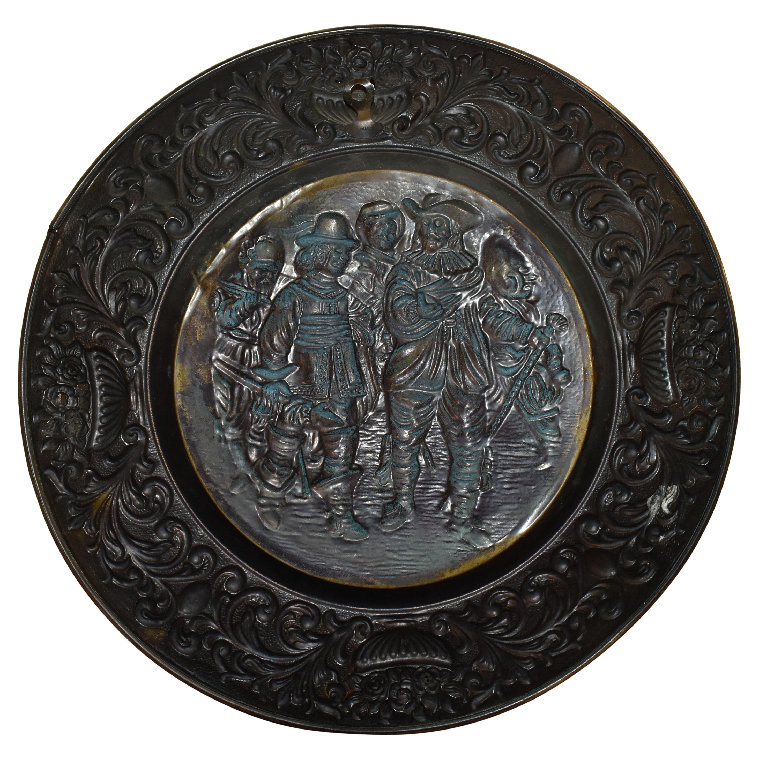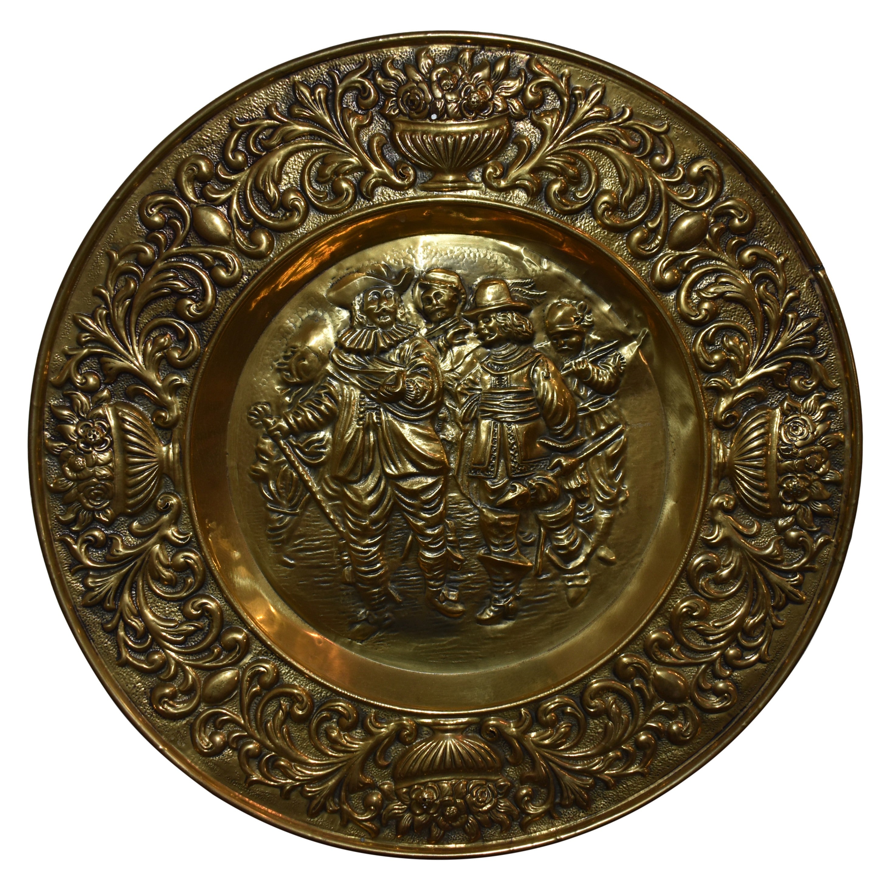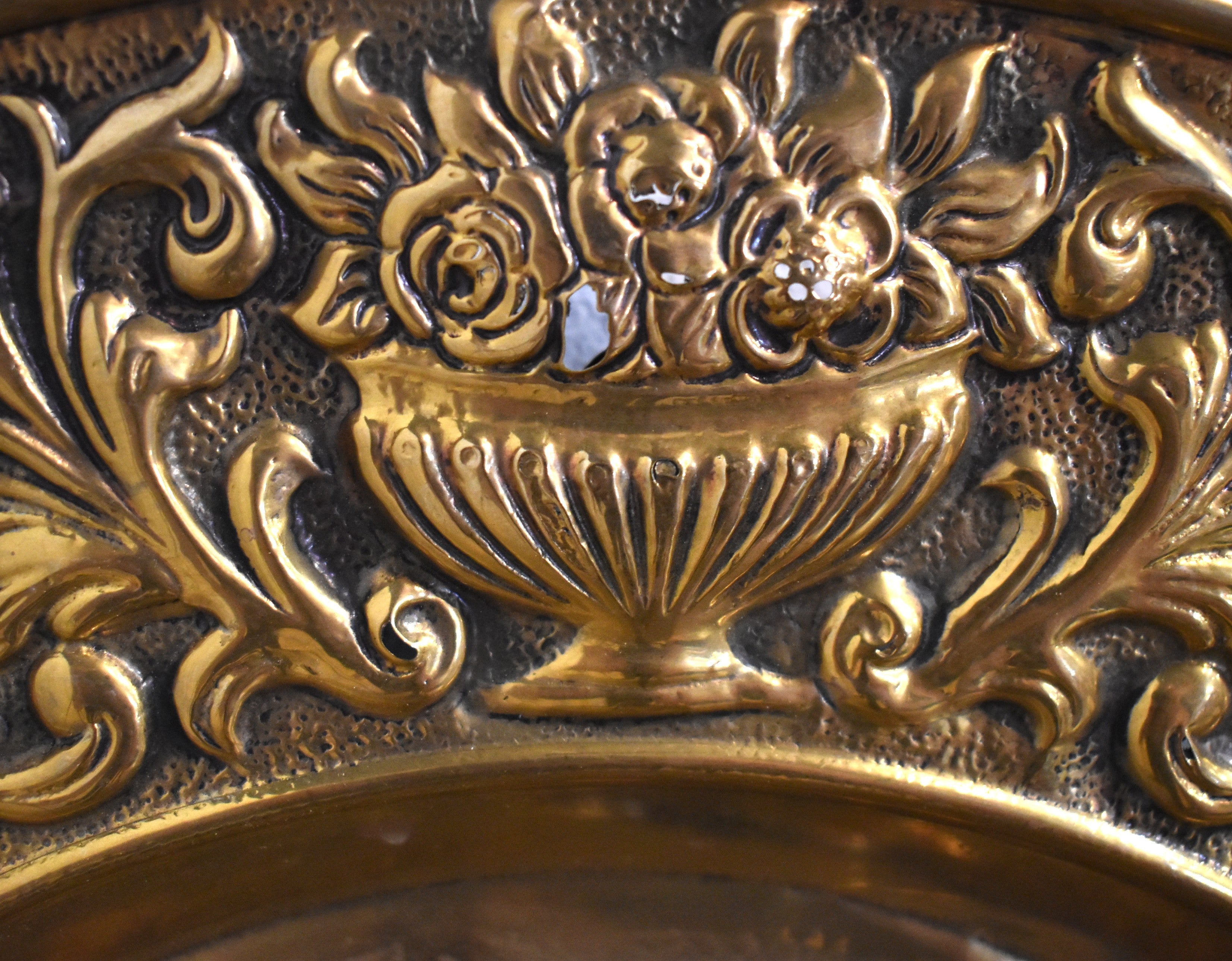 This beautiful decorative plate features an embossed scene at its center with bowls of flowers, flanked by scrollwork around the edge. Designed to be displayed on a wall, the plate has a small hanger on the back.
