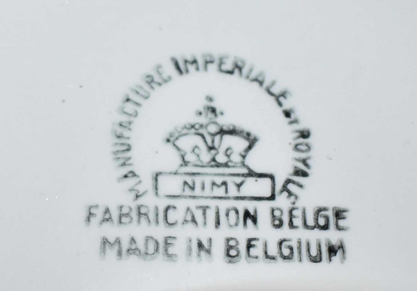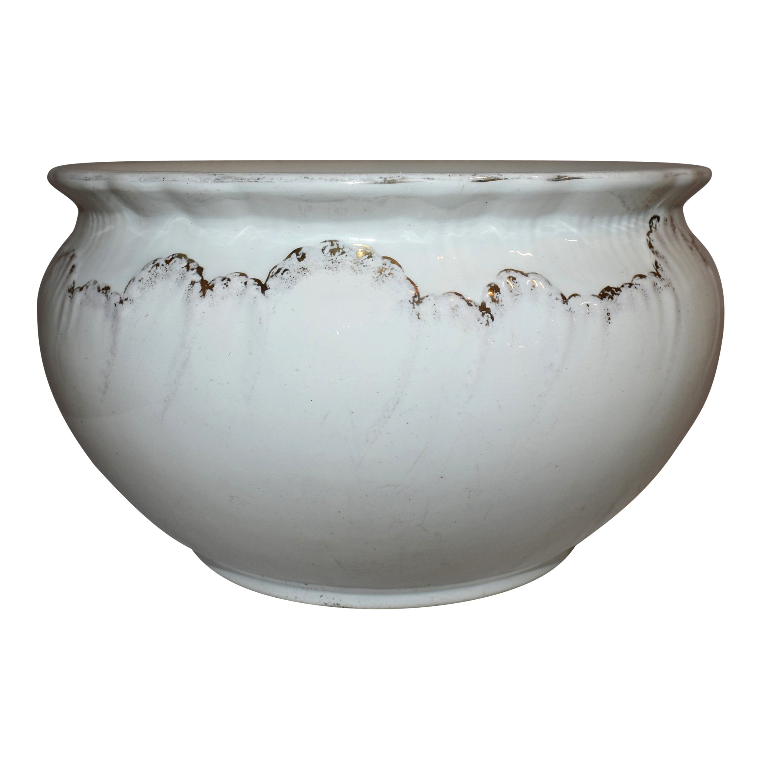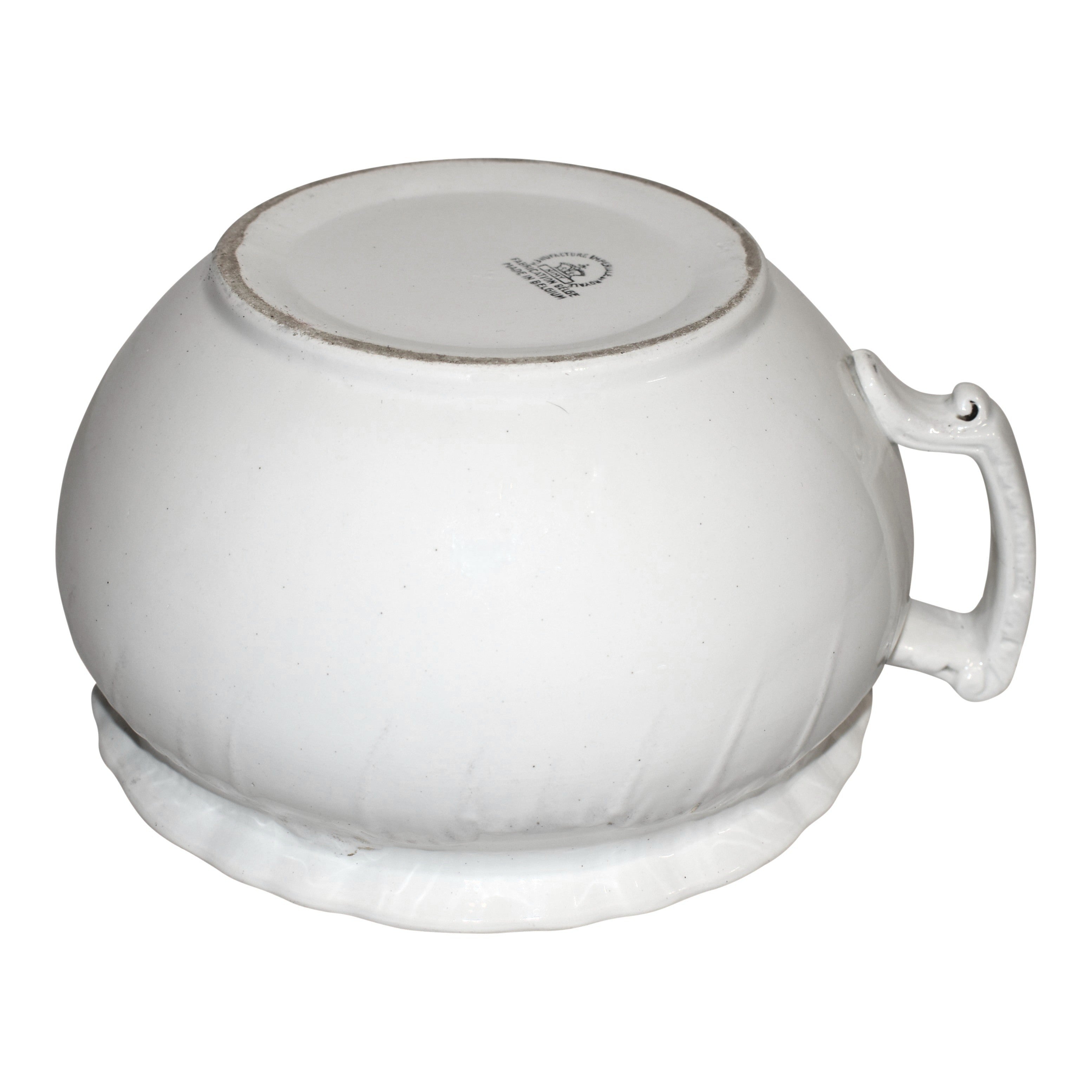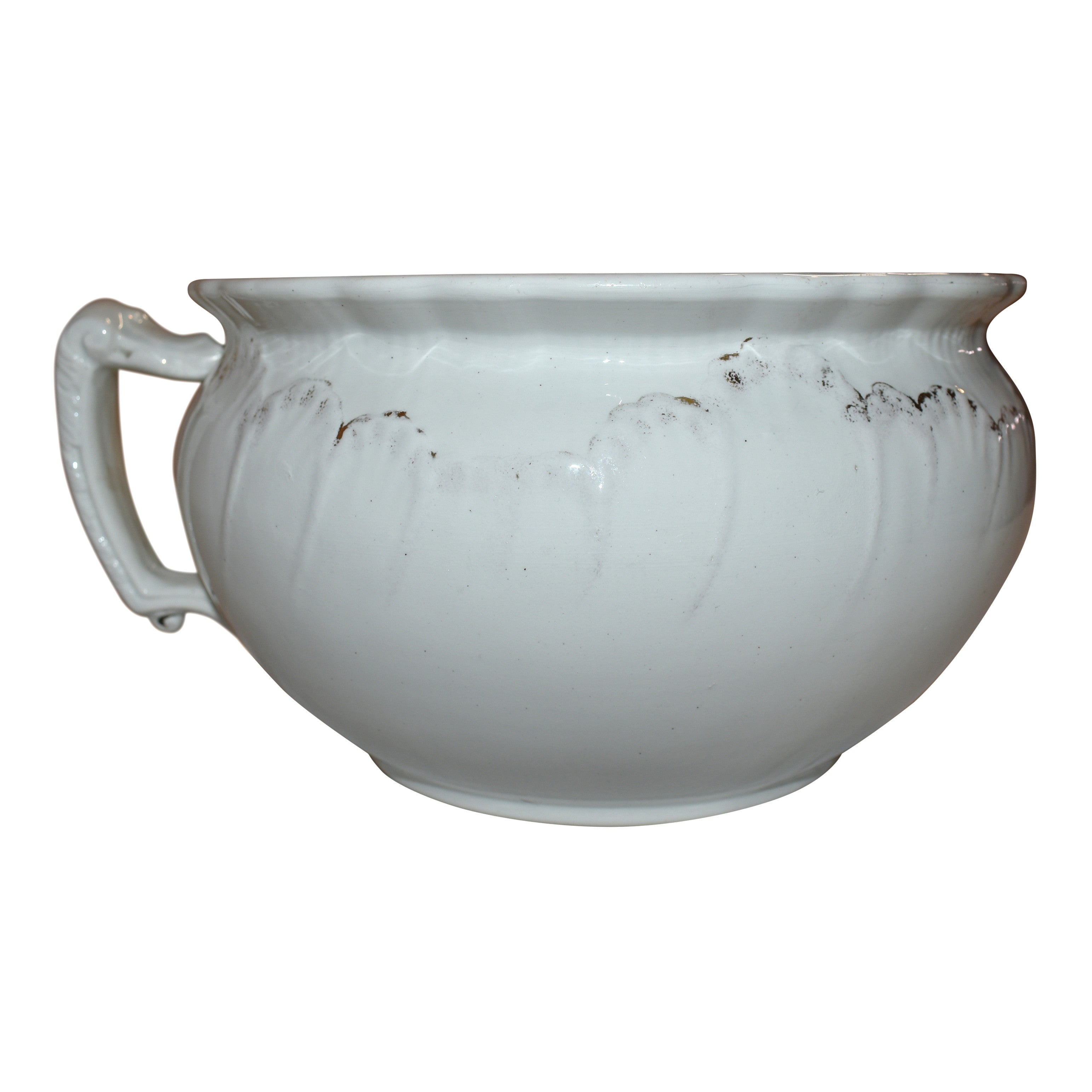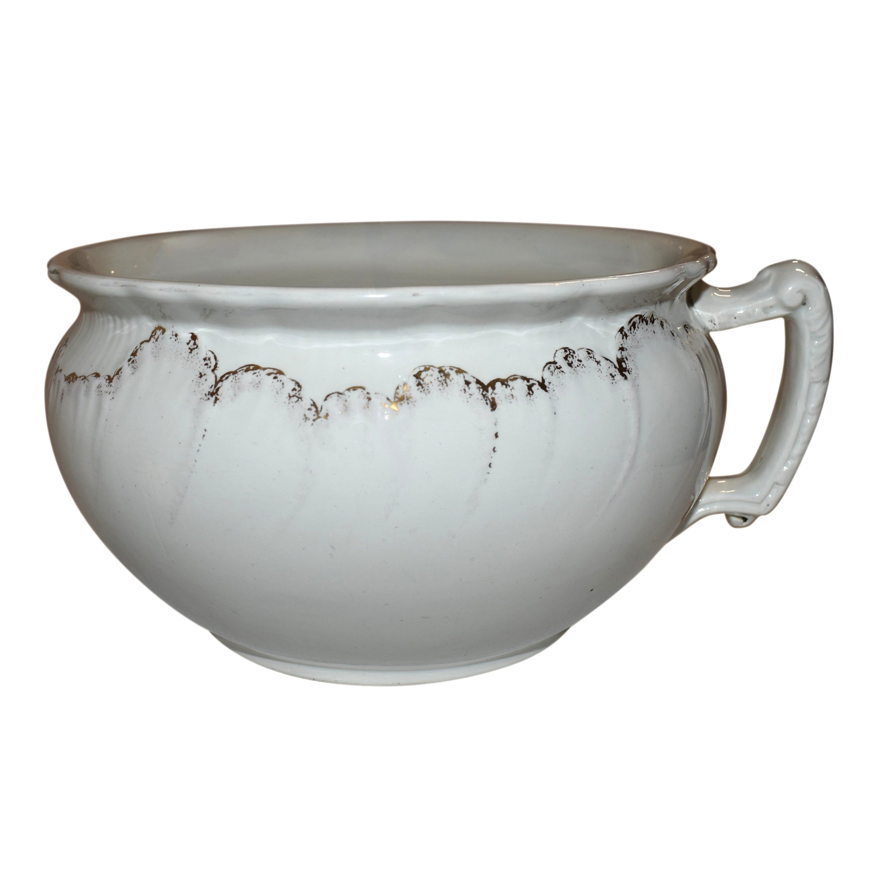 This Belgian chamber pot by NIMY, producer of Imperial and Royal from 1789 until 1951, exemplifies the refined domestic wares produced during the height of Belgian pottery manufacturing. NIMY pottery, renowned for quality and durability, created functional tableware and household items that graced Belgian homes. Crafted in white with gold accents, the design reflects the era's aesthetic sensibilities while maintaining the utilitarian purpose these vessels served. Maker's mark on bottom.