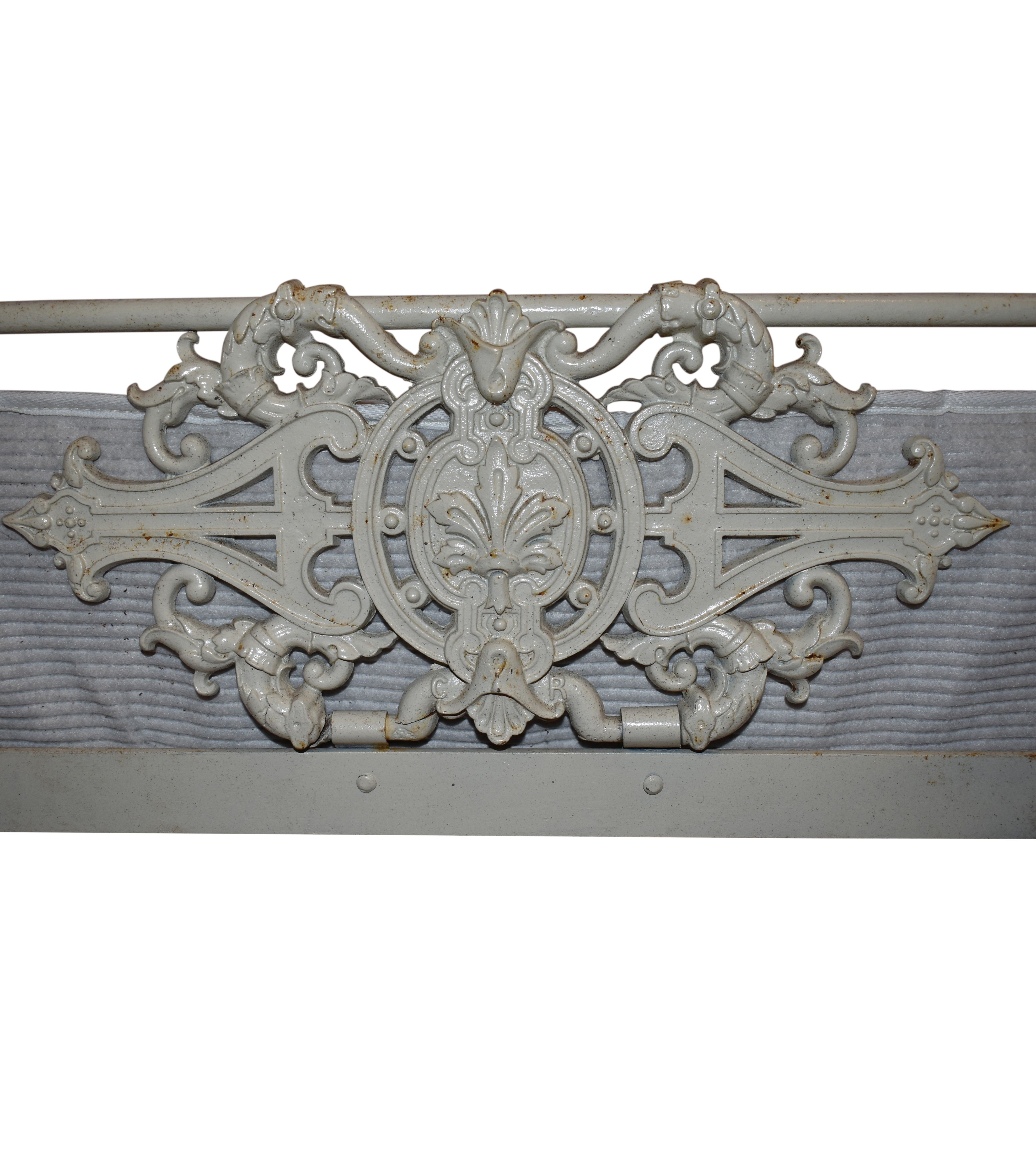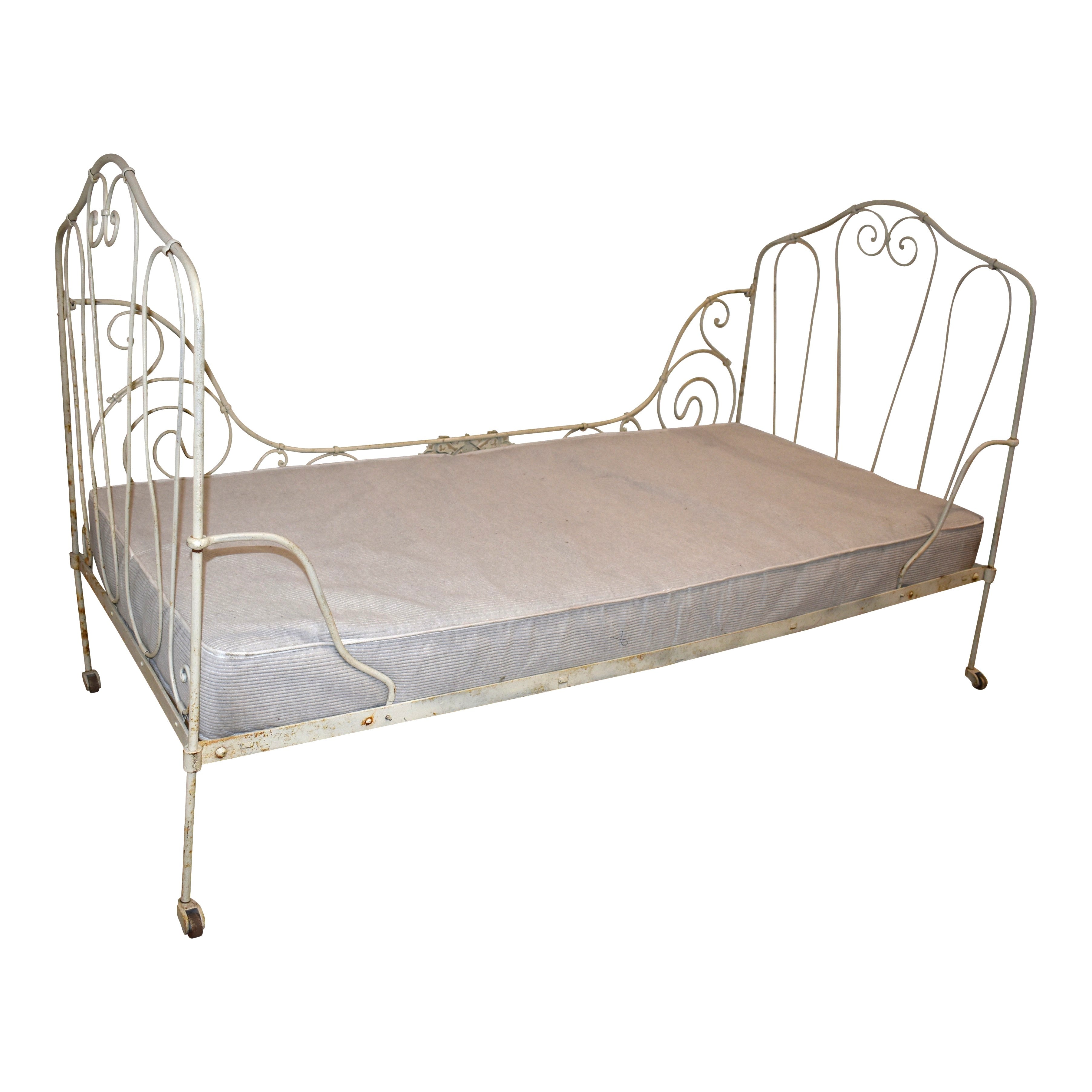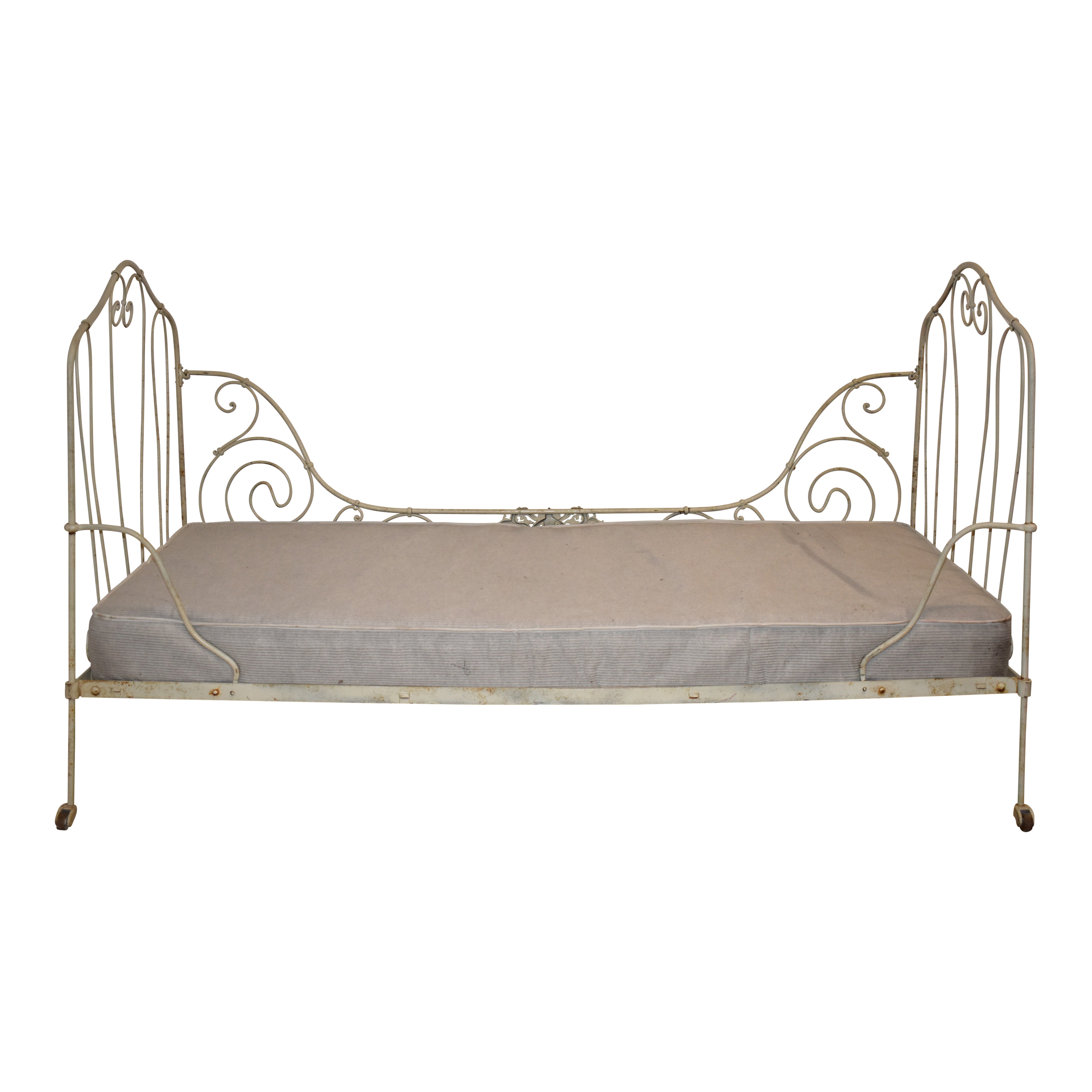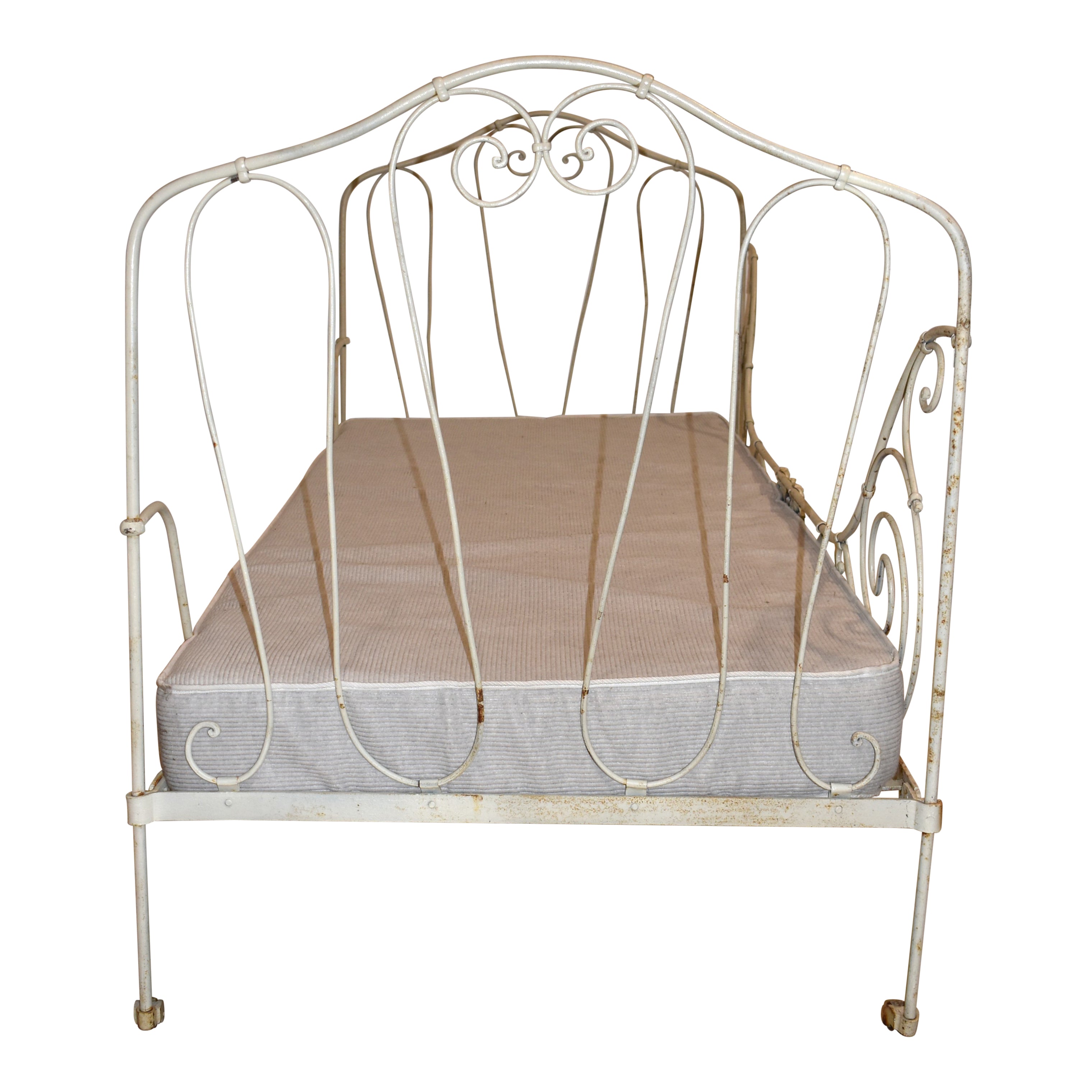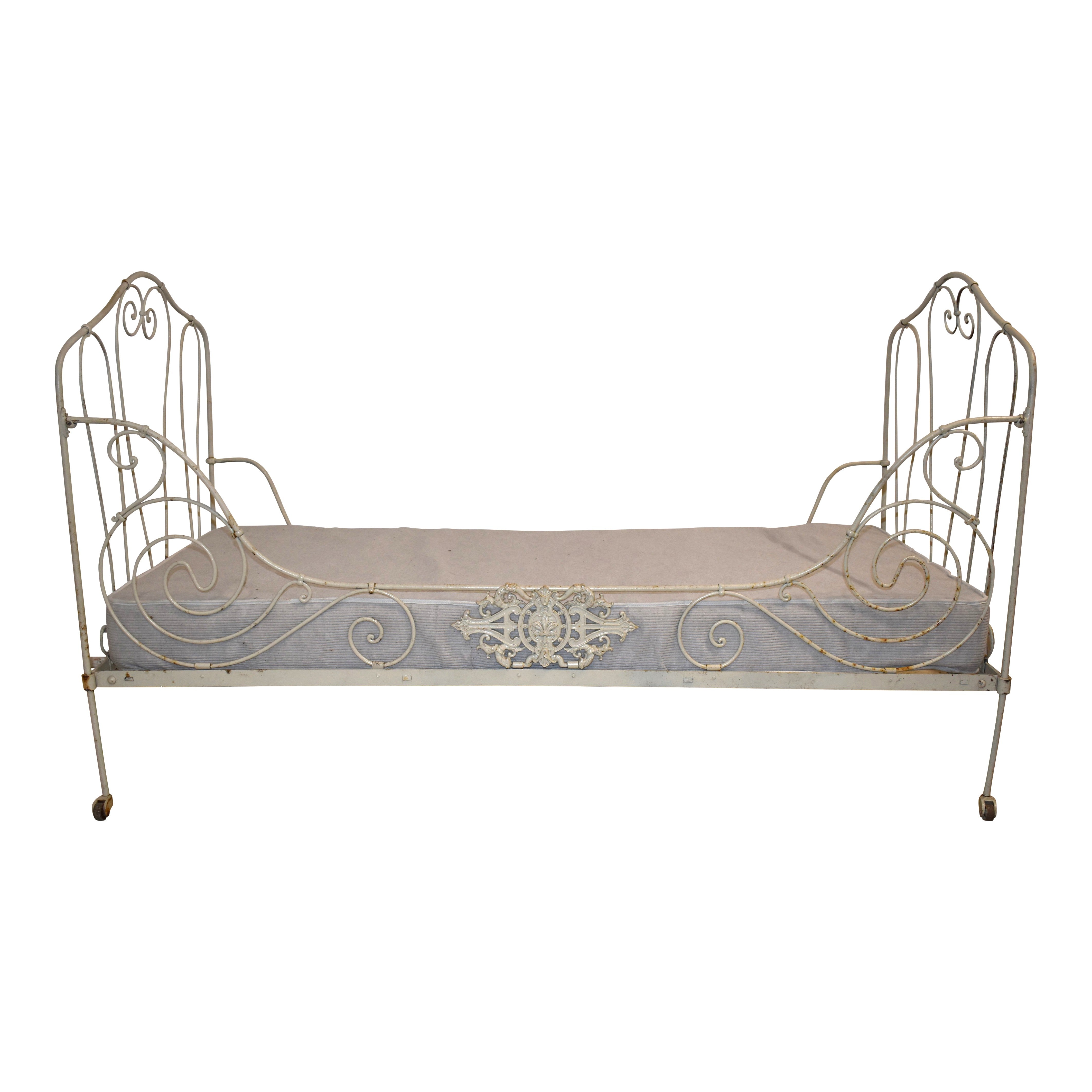 Made to be taken apart for travel, this campaign bed is as lovely as it is portable. It features tall sides, scrollwork, and a decorative pierced focal point on the center of the front panel. Raised on thin iron legs that terminate in small casters, the bed height is 17.5 inches.