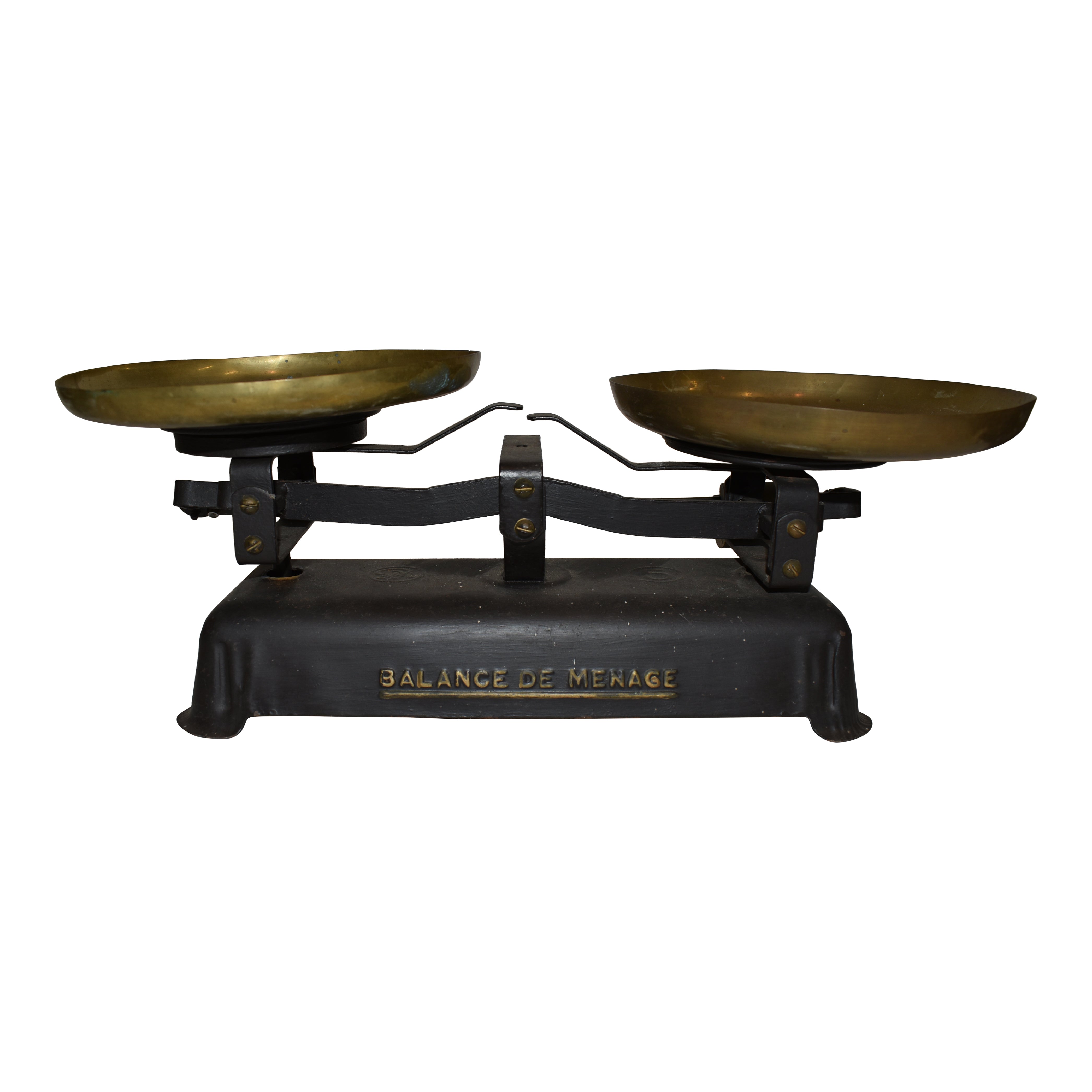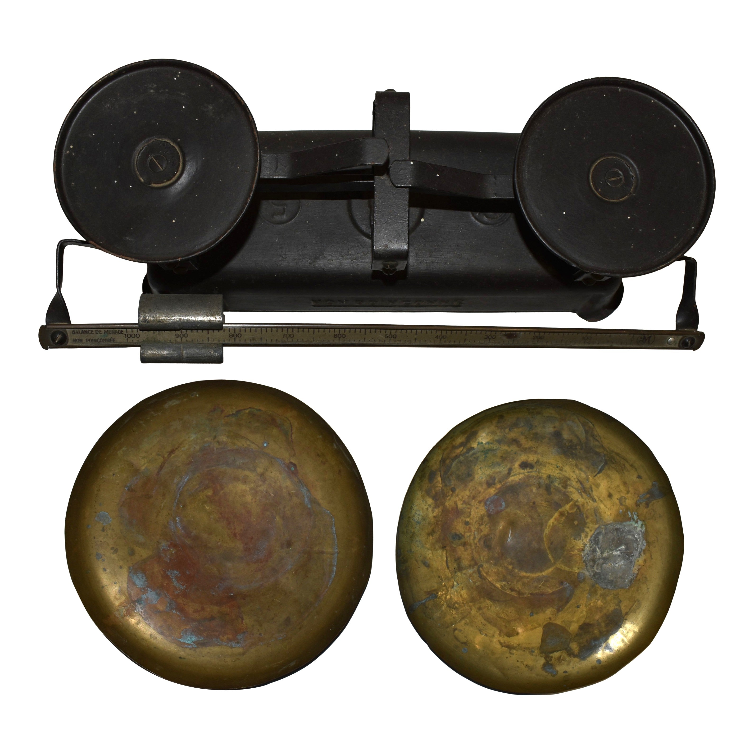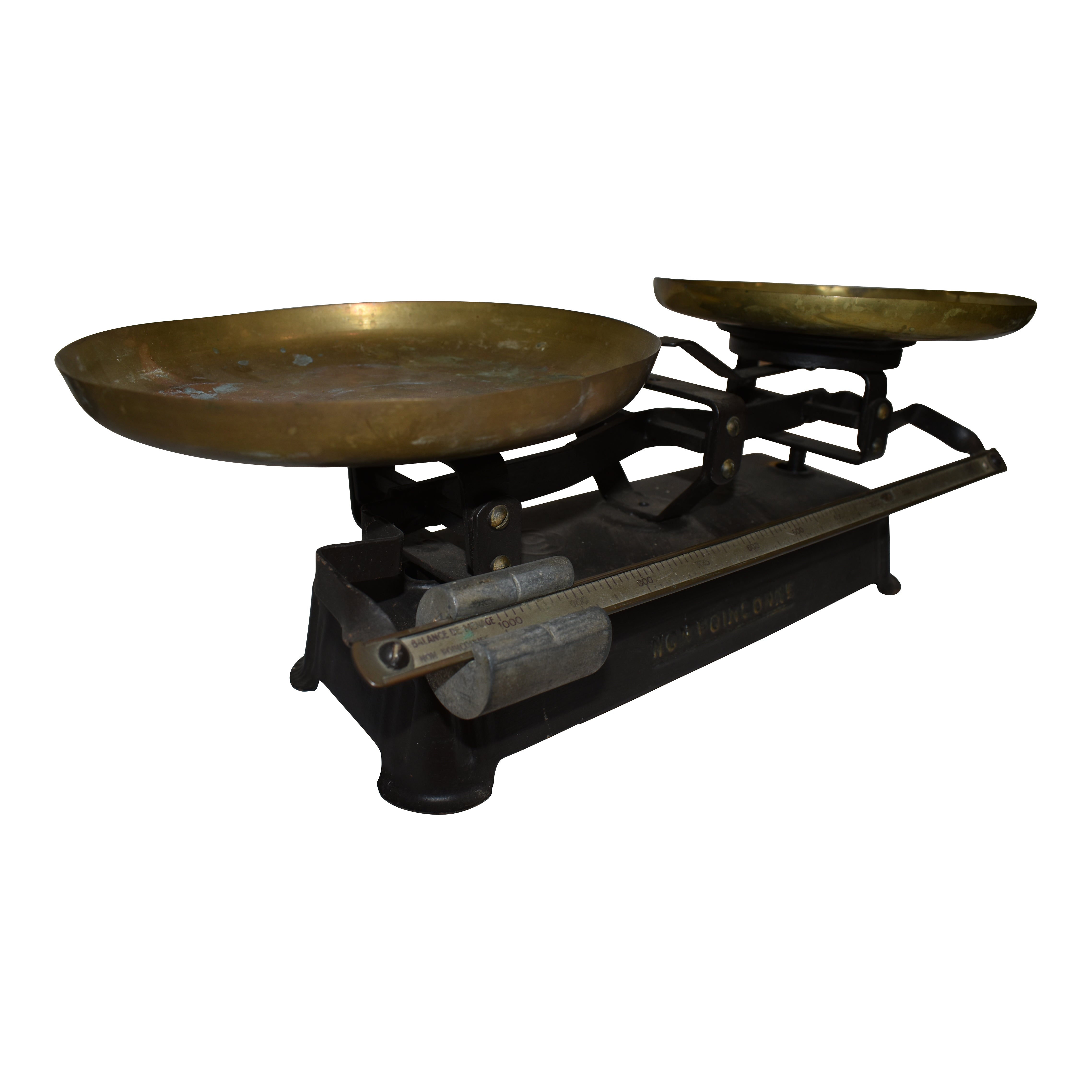 Made of a metal base with round plates at the end of each arm, this balance scale uses two shallow brass pans that rest on the plates for calculating weight. The dimensions of one pan are 8.5" x 1.25". The dimensions of the other are 8.25" x 1".