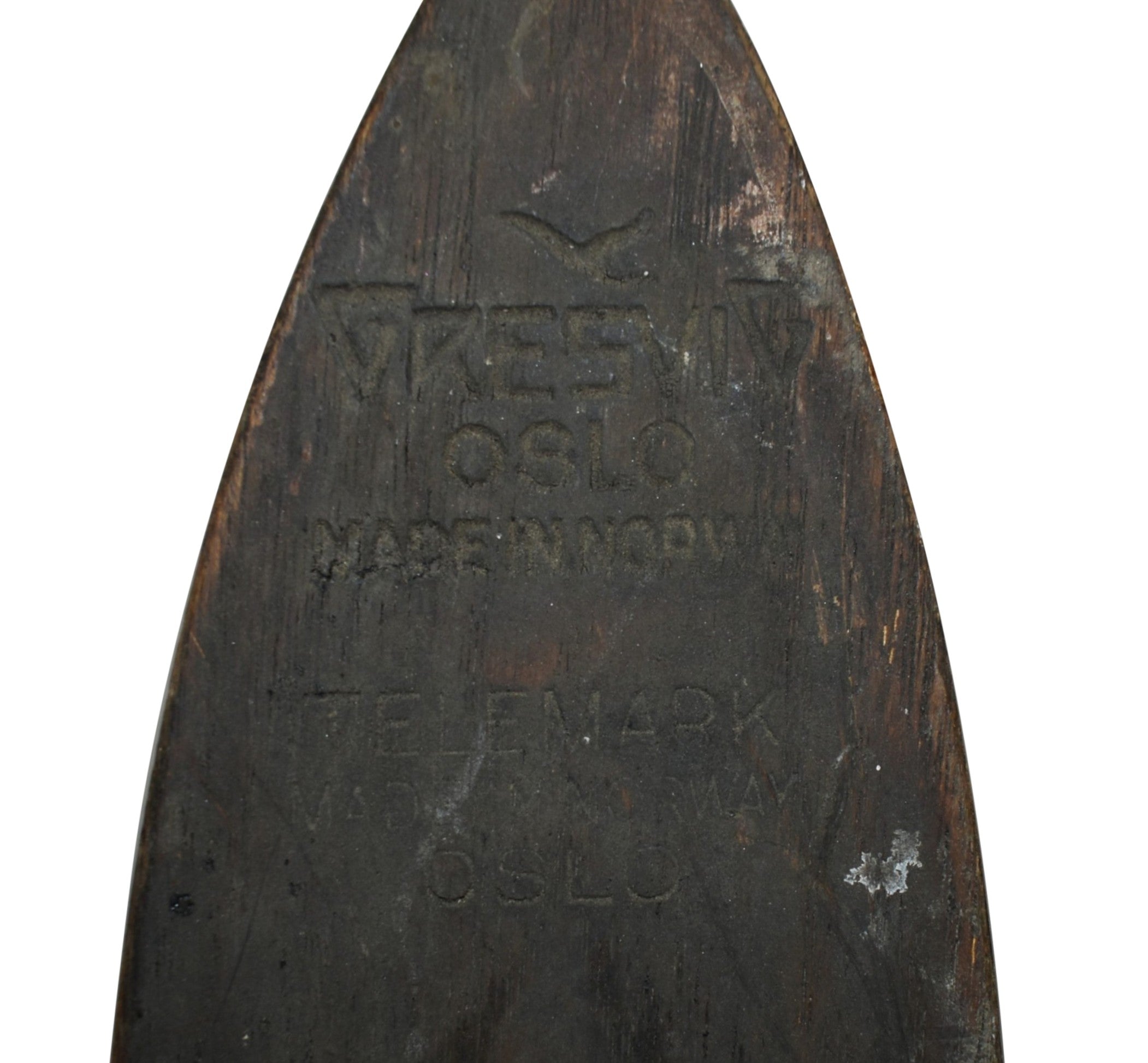 From the slopes of Norway, these classic snow skis feature telemark construction, combining elements for Nordic and alpine skiing. Made by Gresvig, they feature pointed tips with the original ski logo still visible on one ski. The bindings have been removed, giving the skis a sleek, streamlined look.