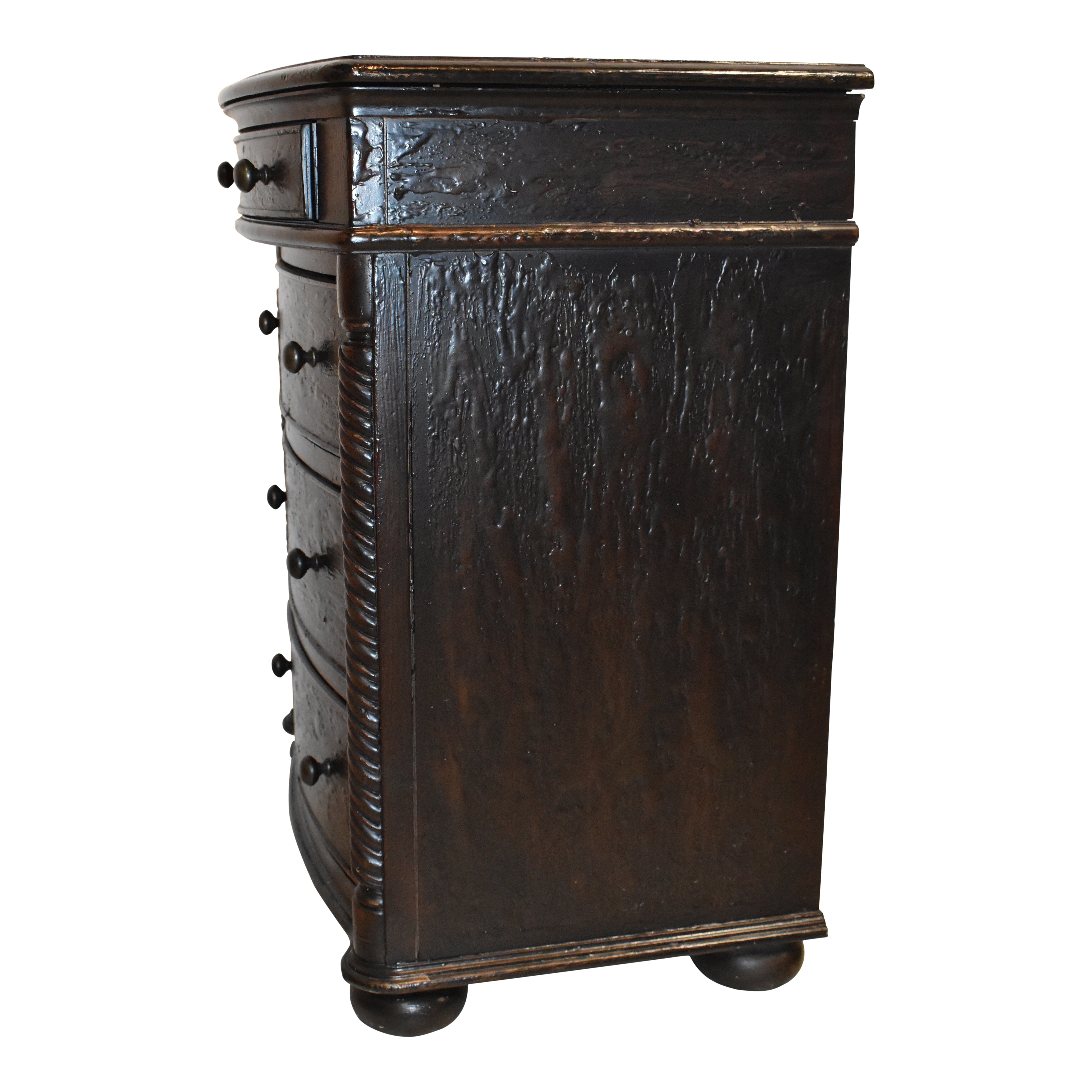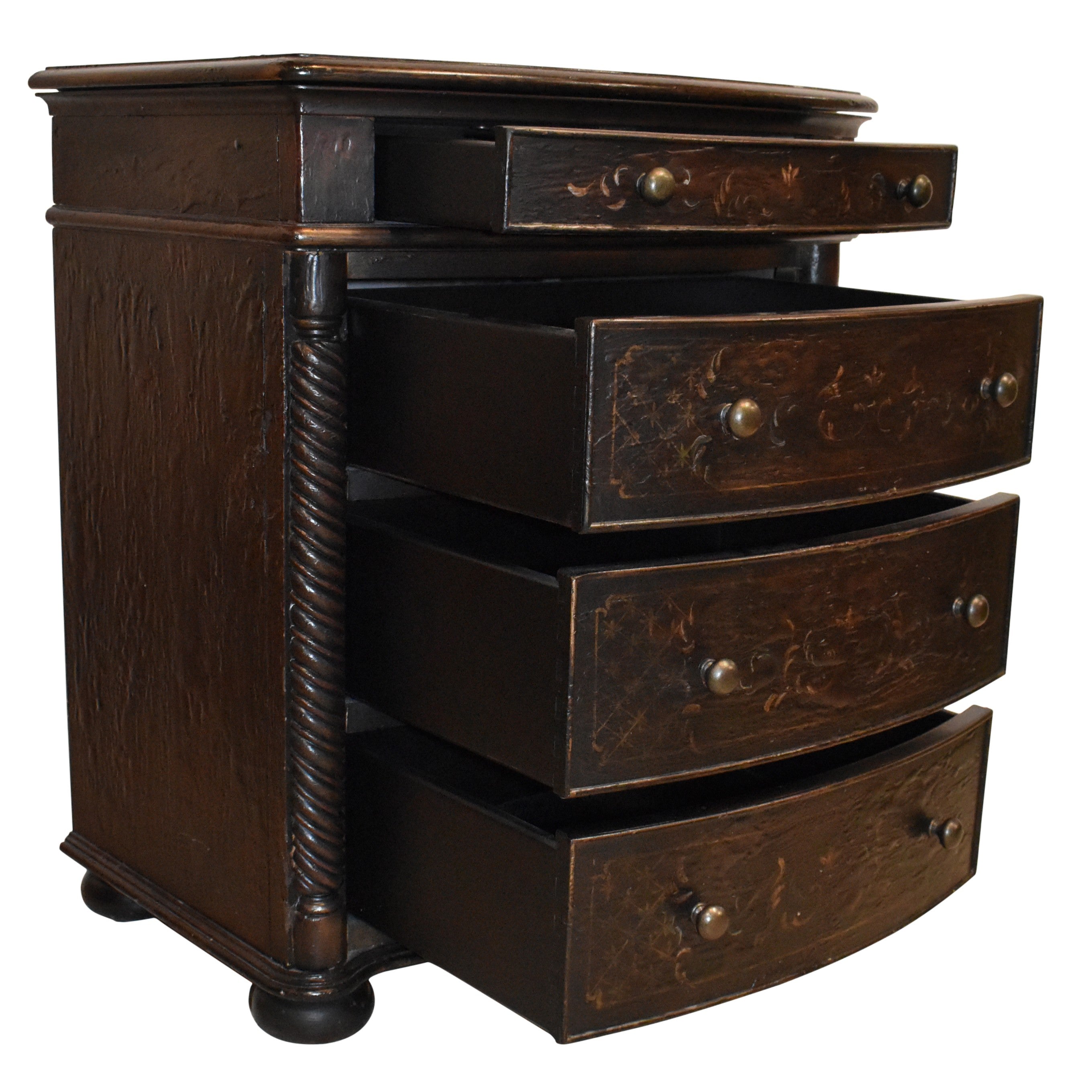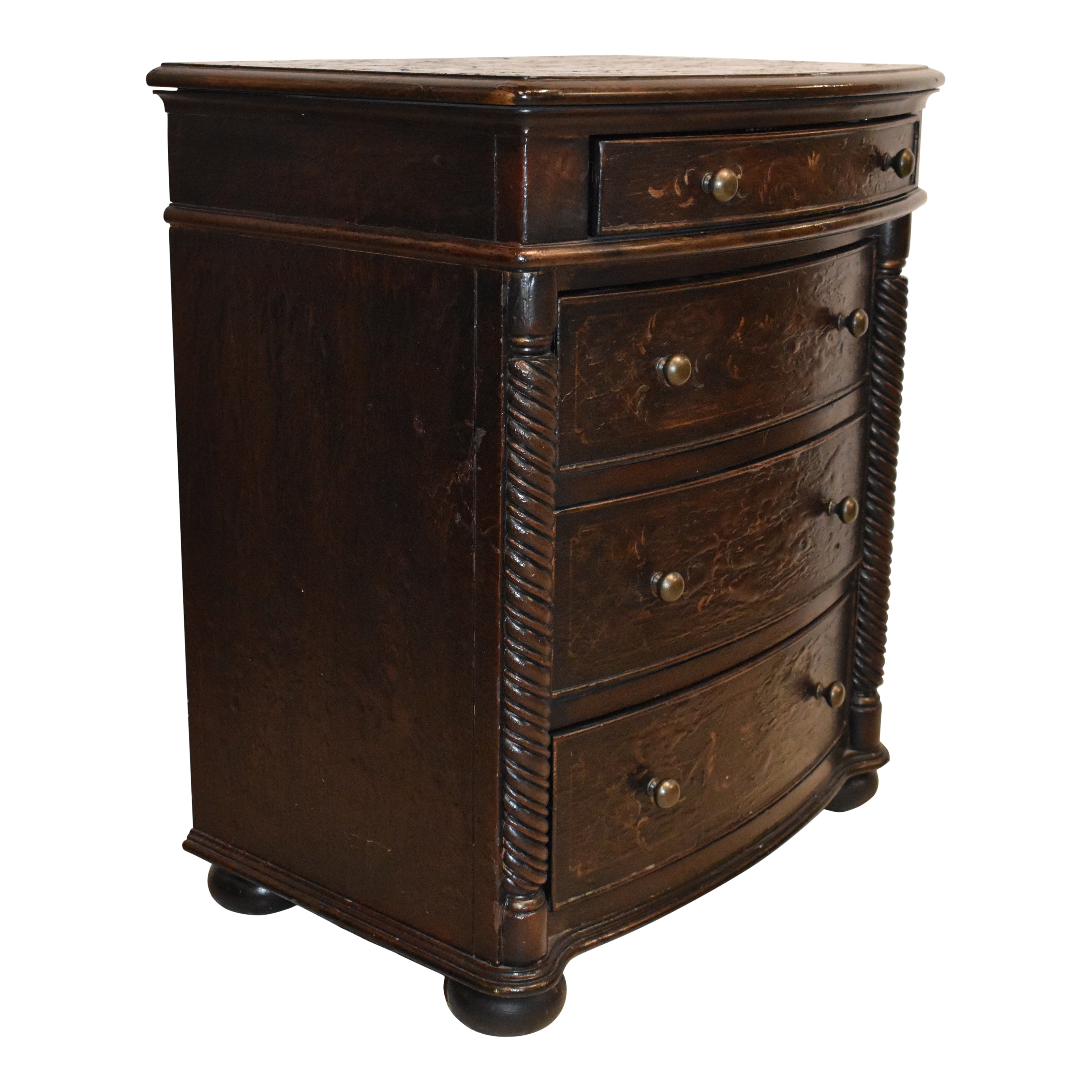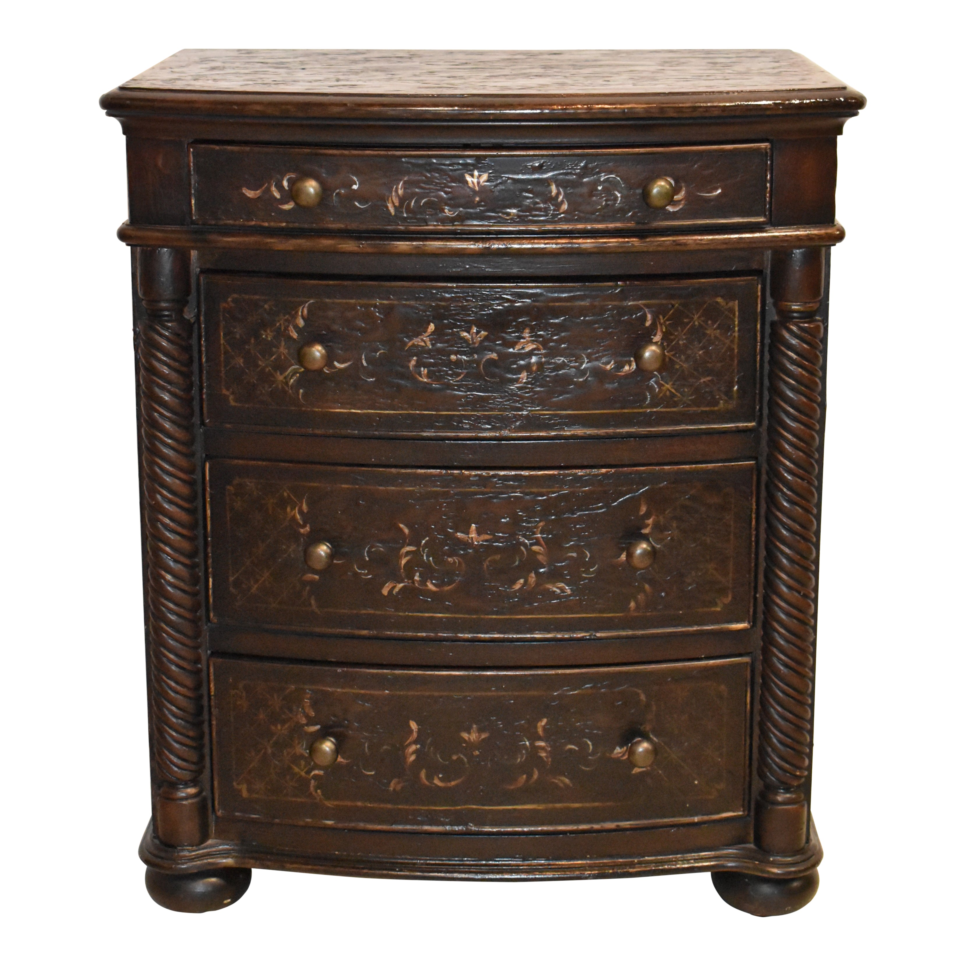 Gracefully and elegant, this four drawer bachelor's chest features a textured finish made to look like roughly-hewn wood, painted accents, and bun feet. We love the way the top slides forward to reveal a hidden lined drawer at the back to conceal your treasures. This is a newer item, not an antique.