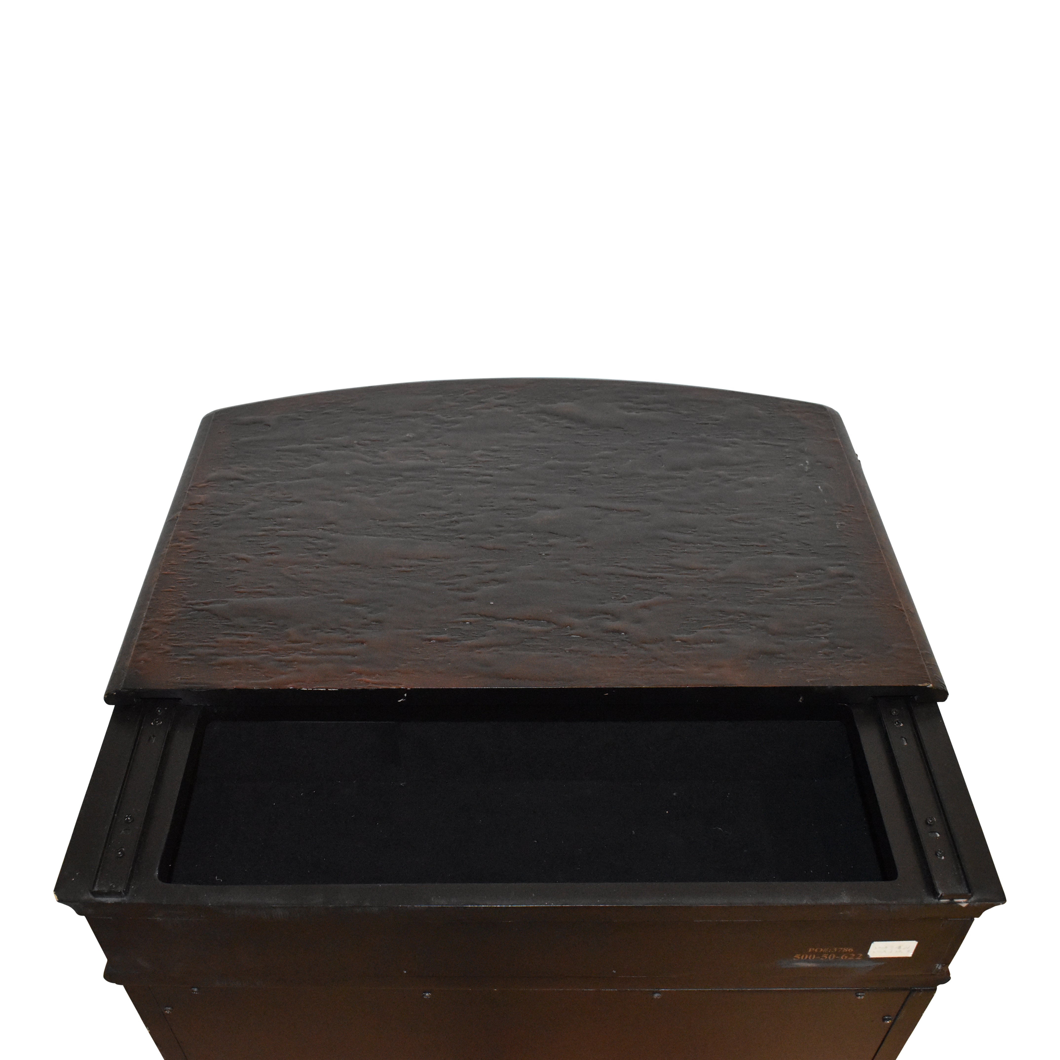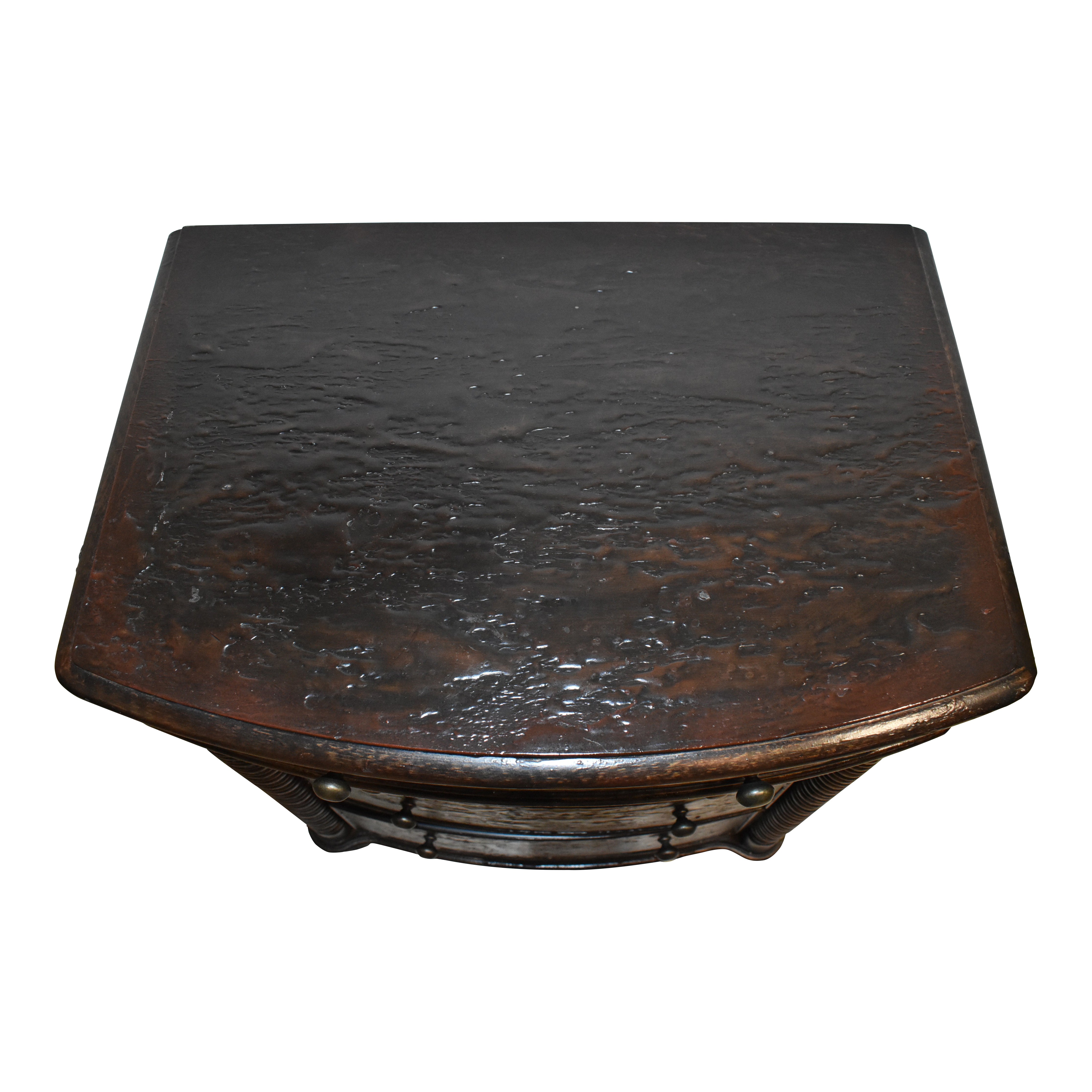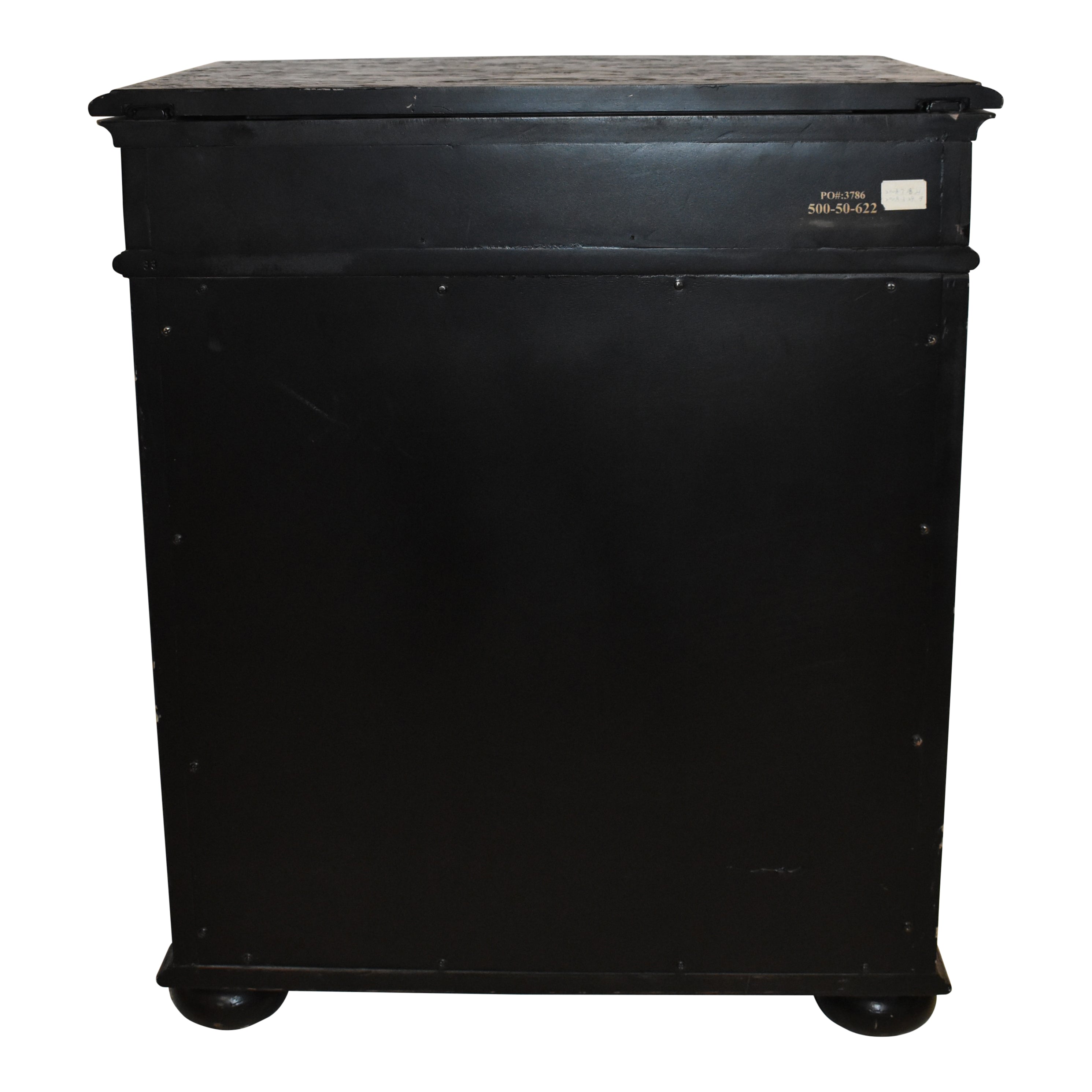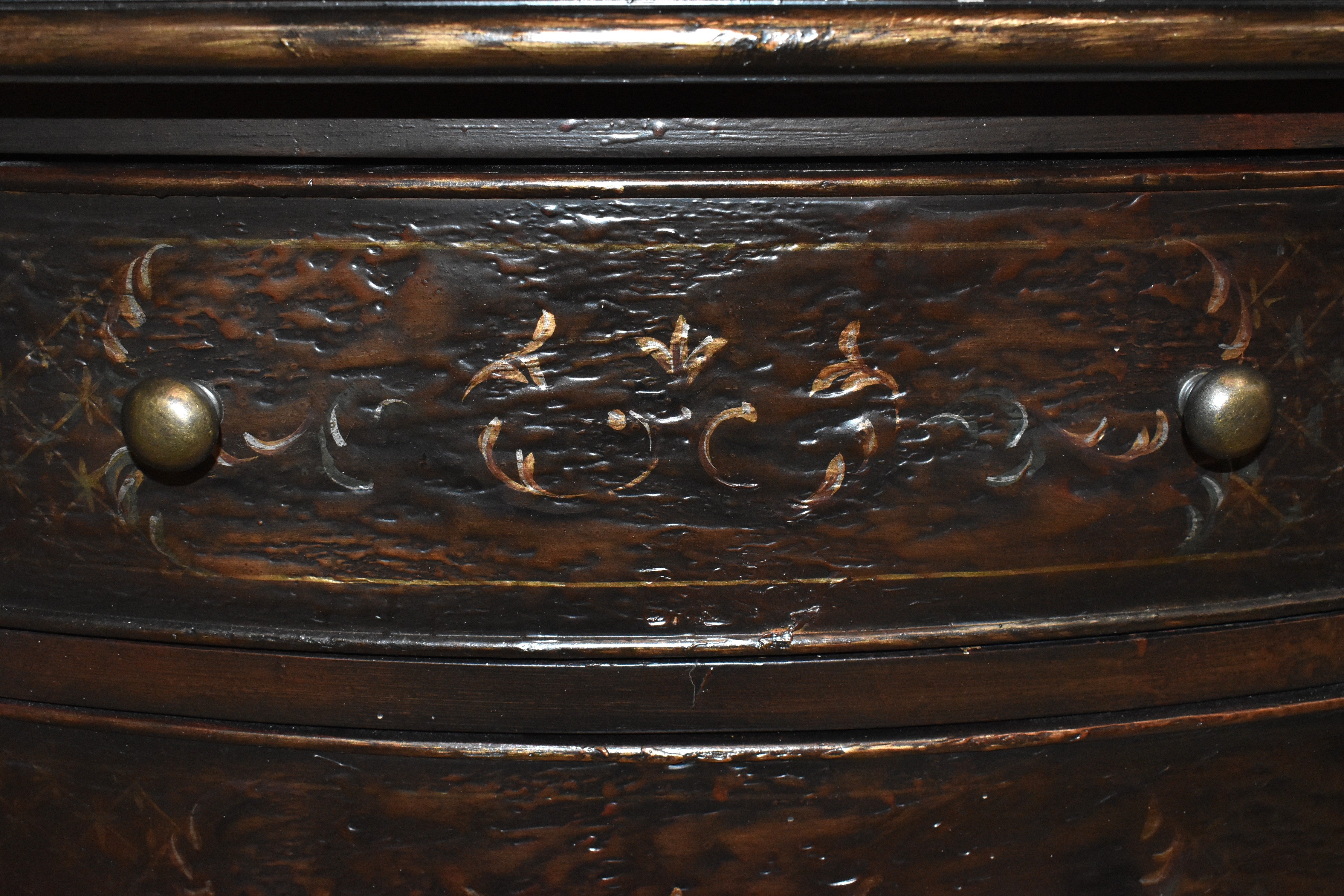 Gracefully and elegant, this four drawer bachelor's chest features a textured finish made to look like roughly-hewn wood, painted accents, and bun feet. We love the way the top slides forward to reveal a hidden lined drawer at the back to conceal your treasures. This is a newer item, not an antique.