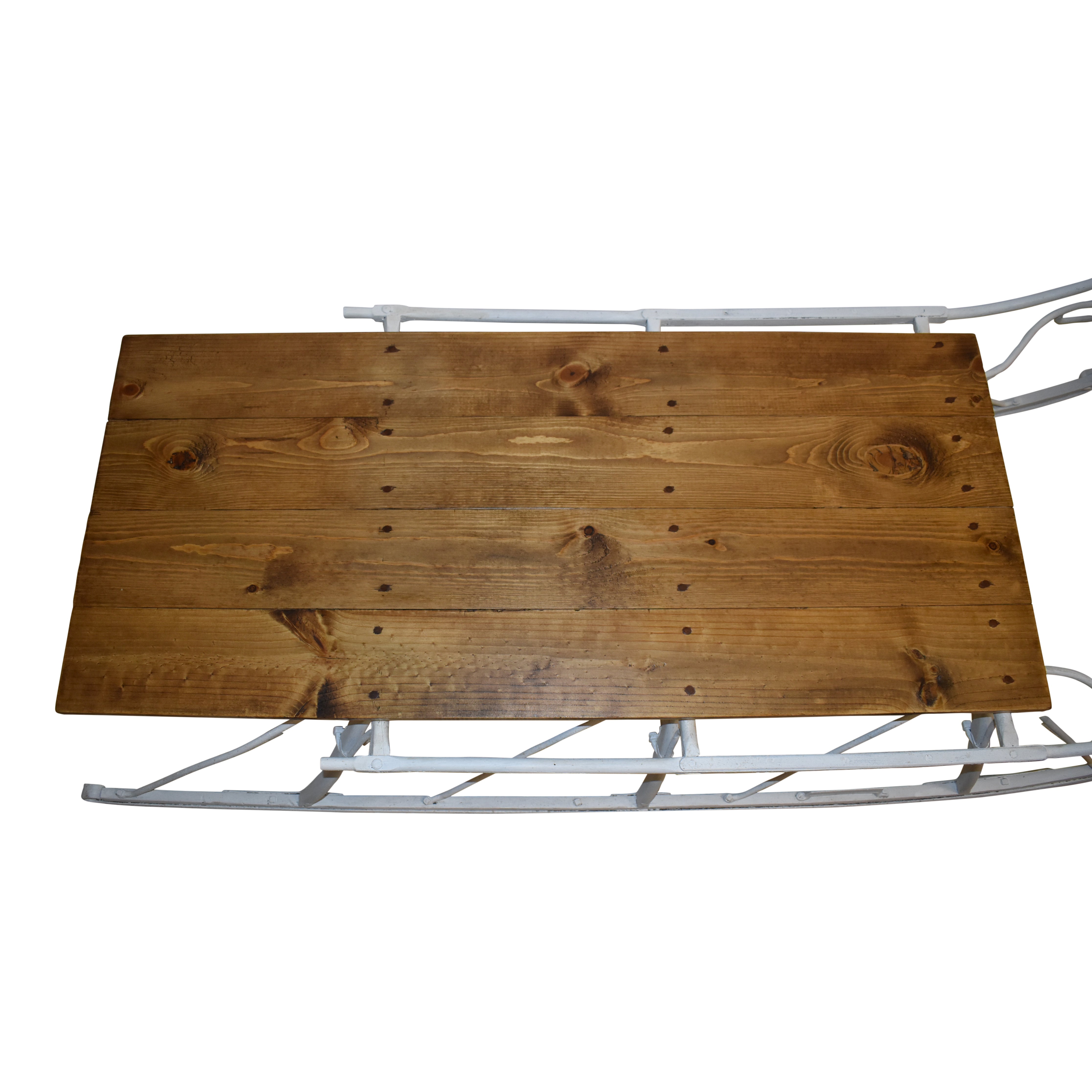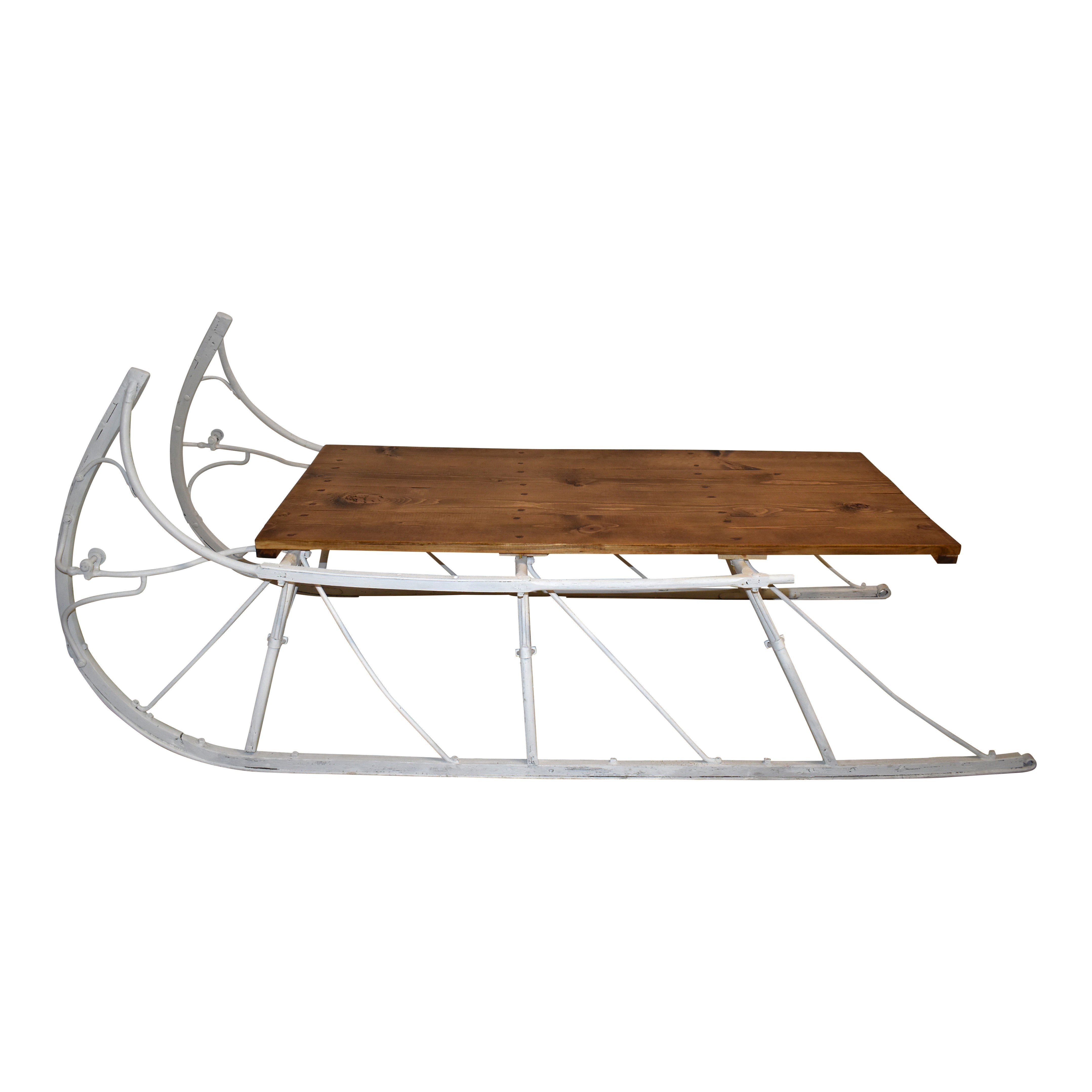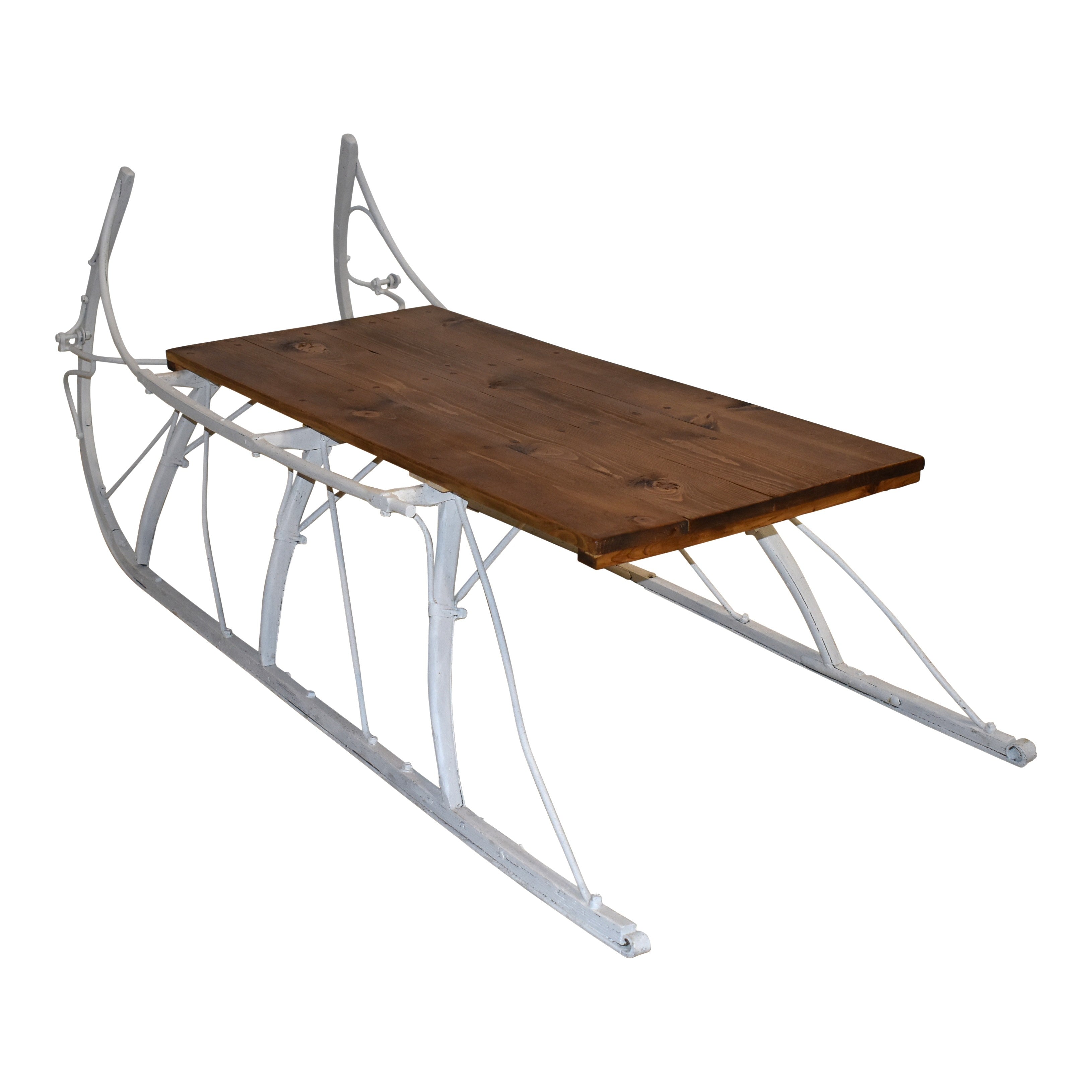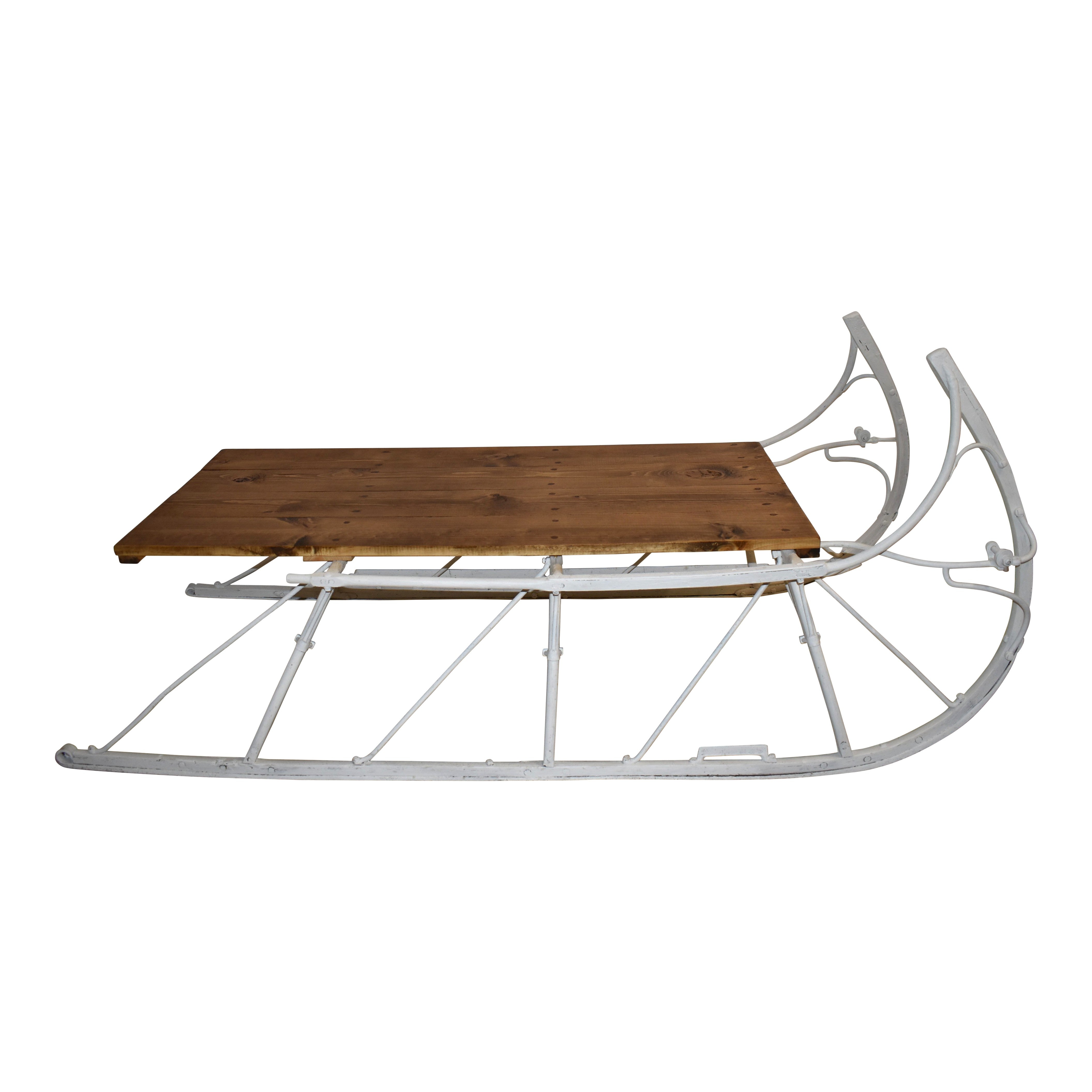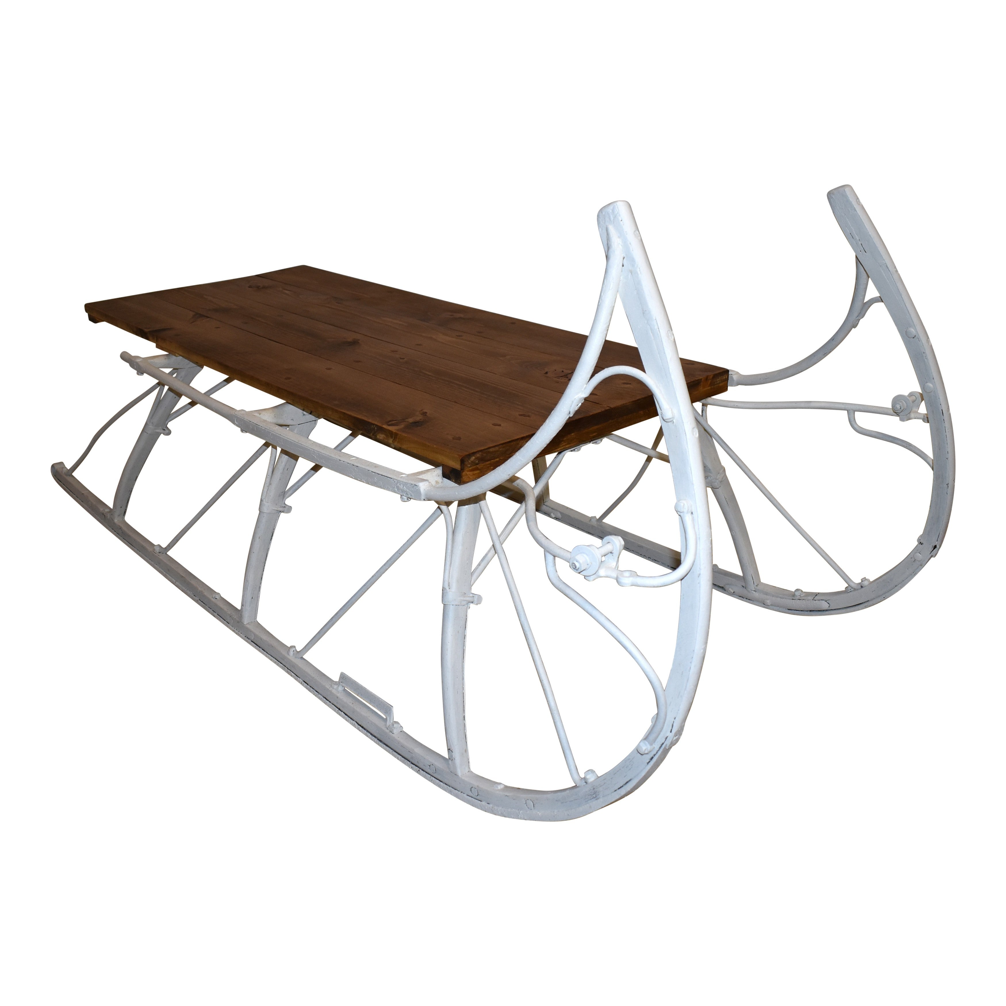 Redefine your living space with this custom-made, sleigh coffee table, a bold fusion of heritage and modern design. Crafted with authentic antique runners finished in white and topped with stained alder, this conversation piece doesn't just hold your drinks—it tells a story of adventure and craftsmanship that ordinary furniture wouldn't dare attempt.