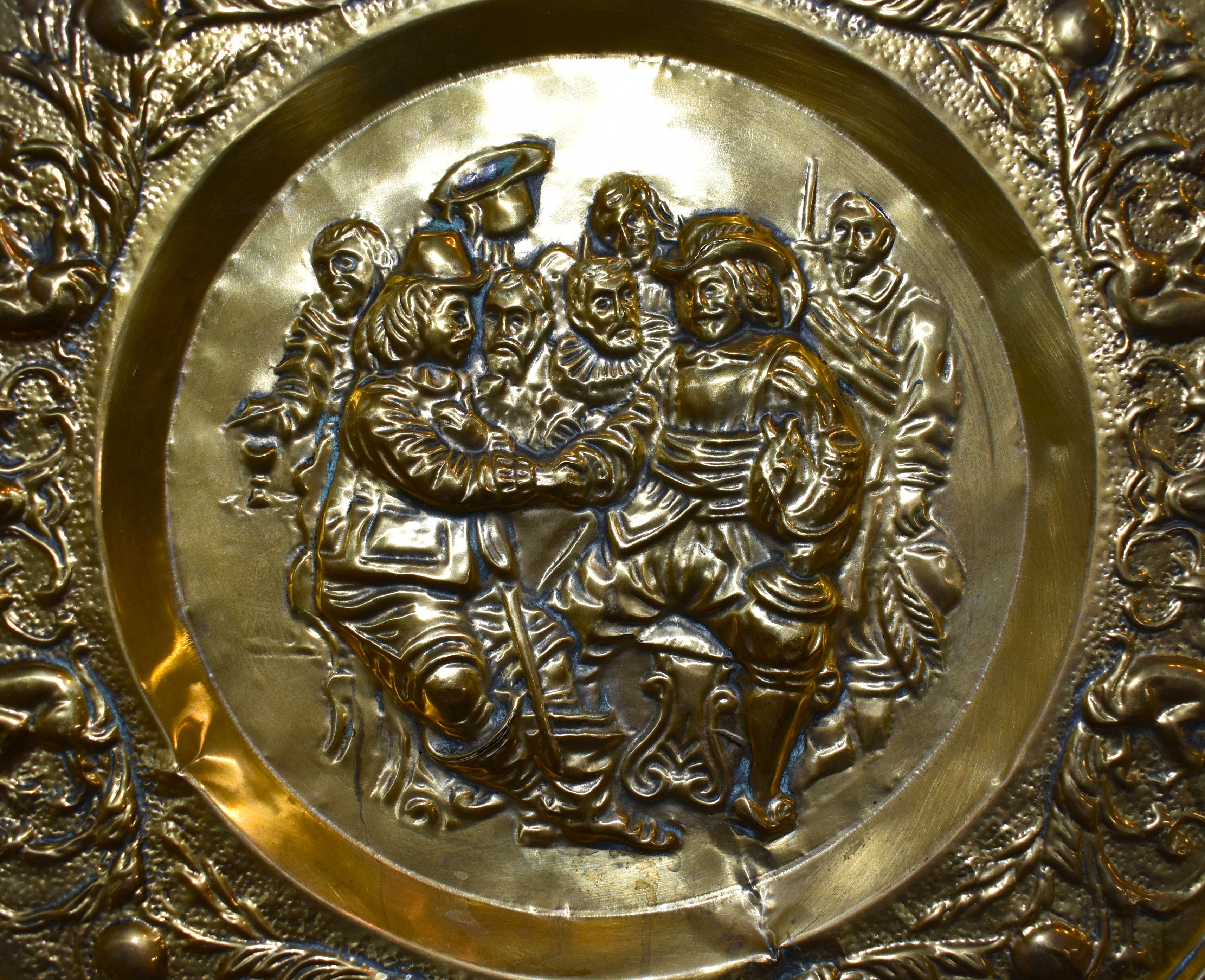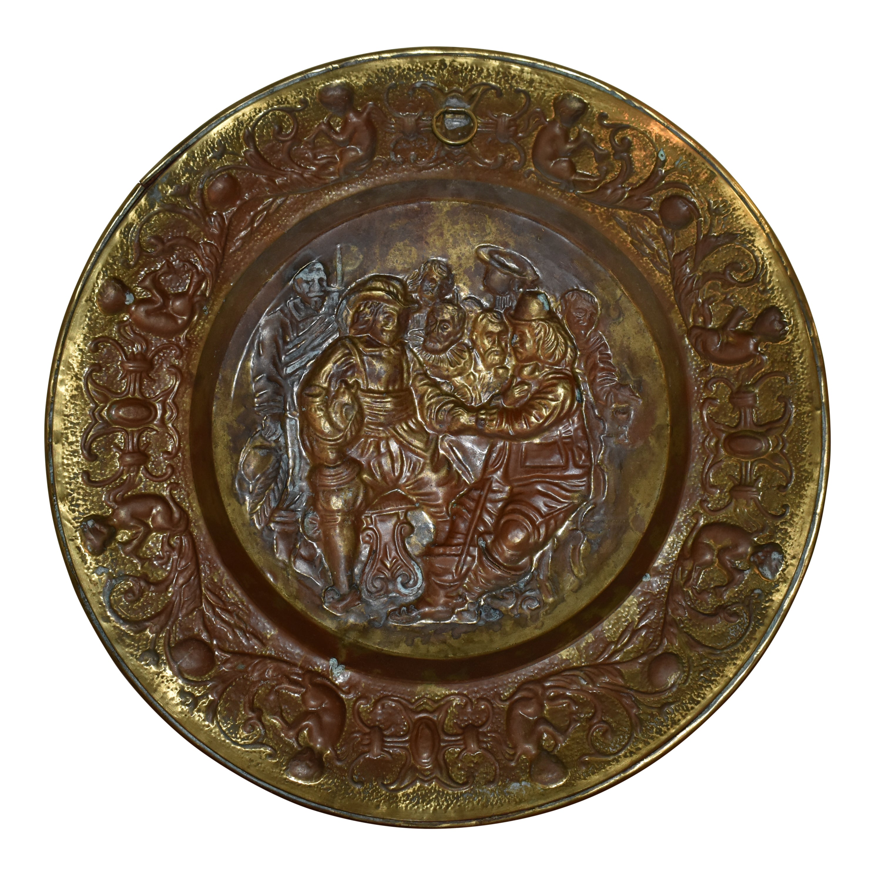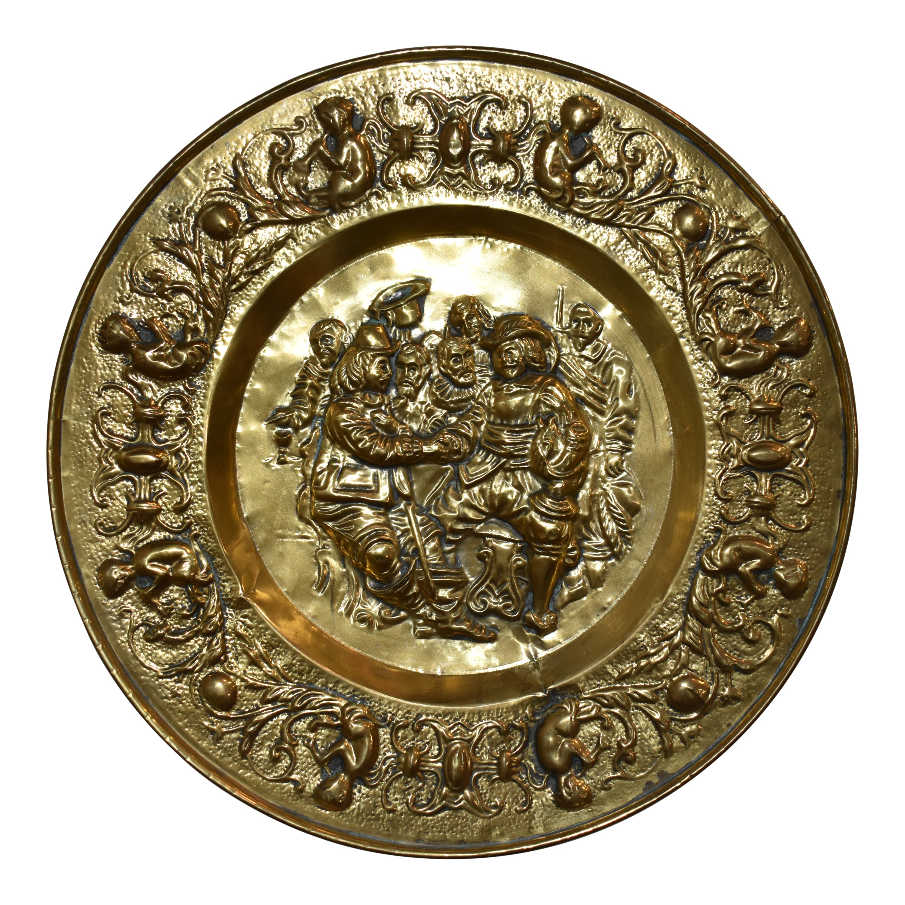This beautiful decorative plate features an embossed scene at its center with opposing cherubs playing horns, flanked by scrollwork around the edge. Designed to be displayed on a wall, the plate has a small hanger on the back.