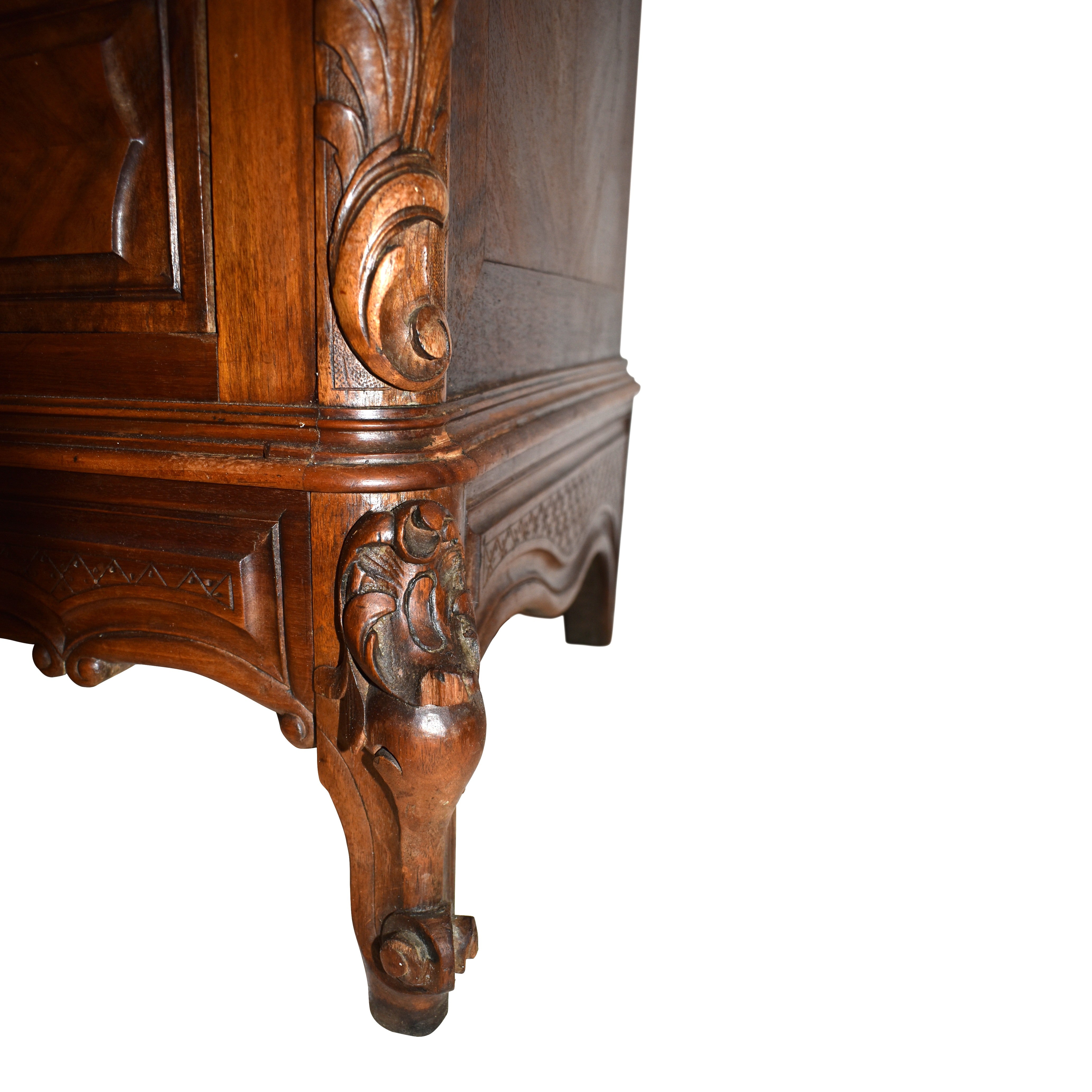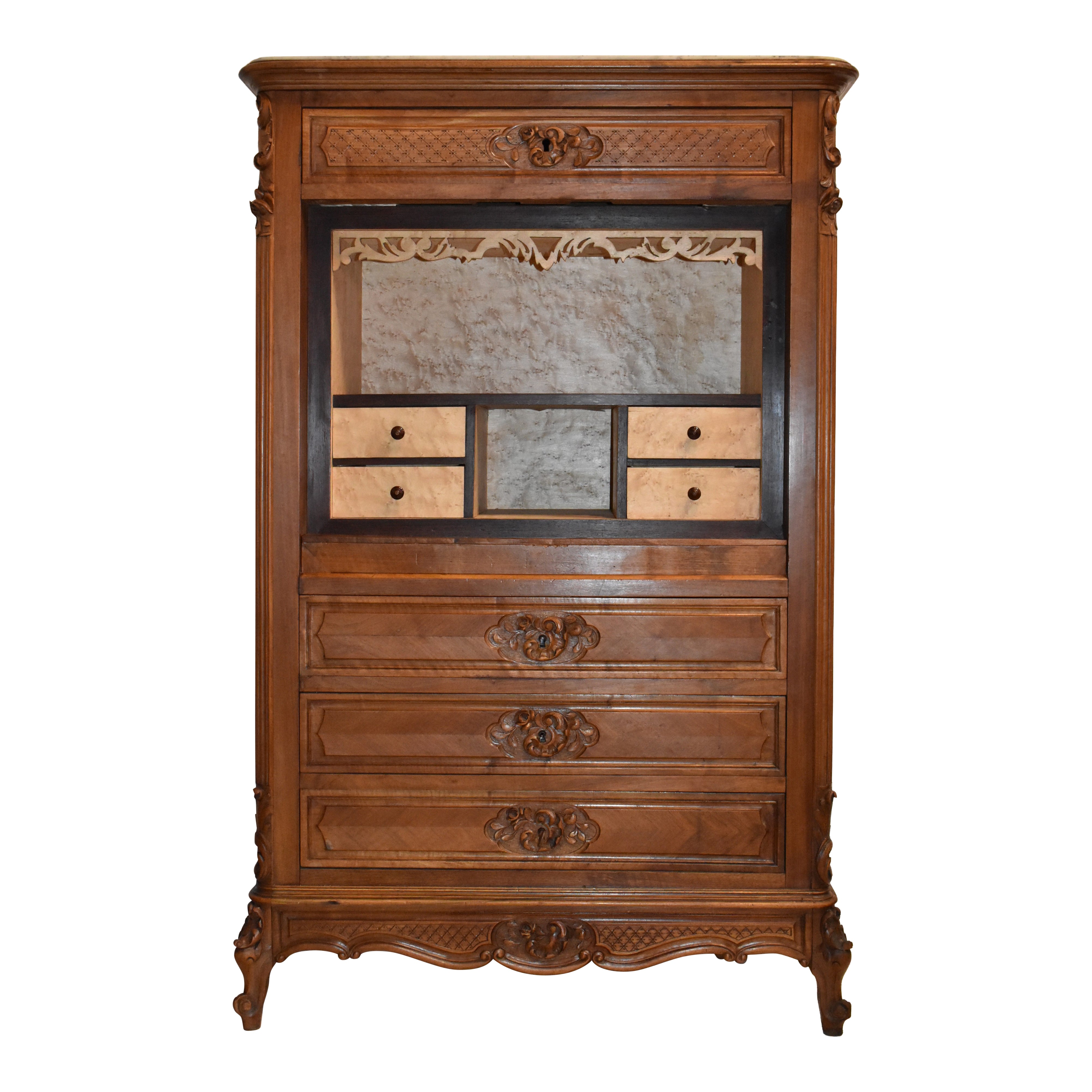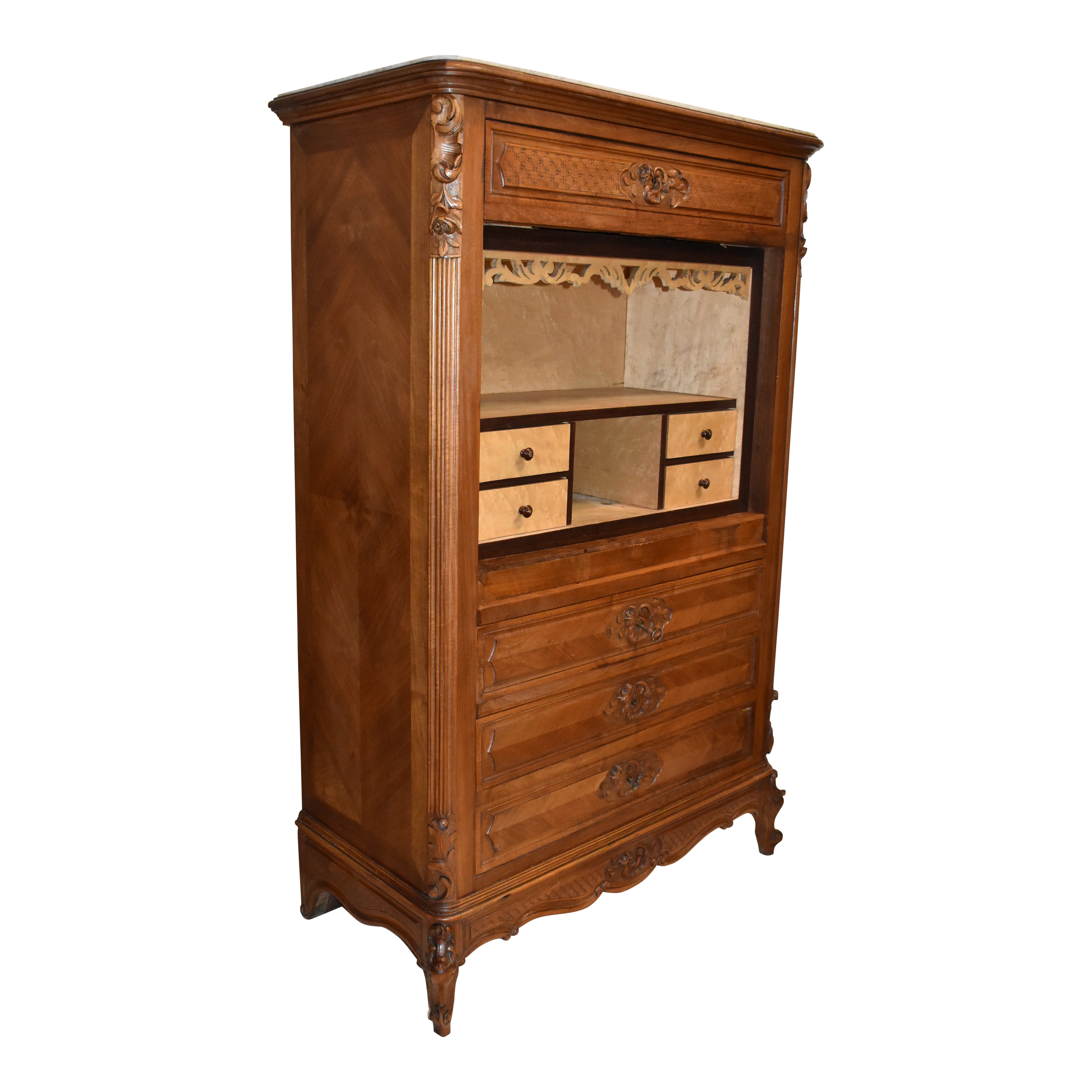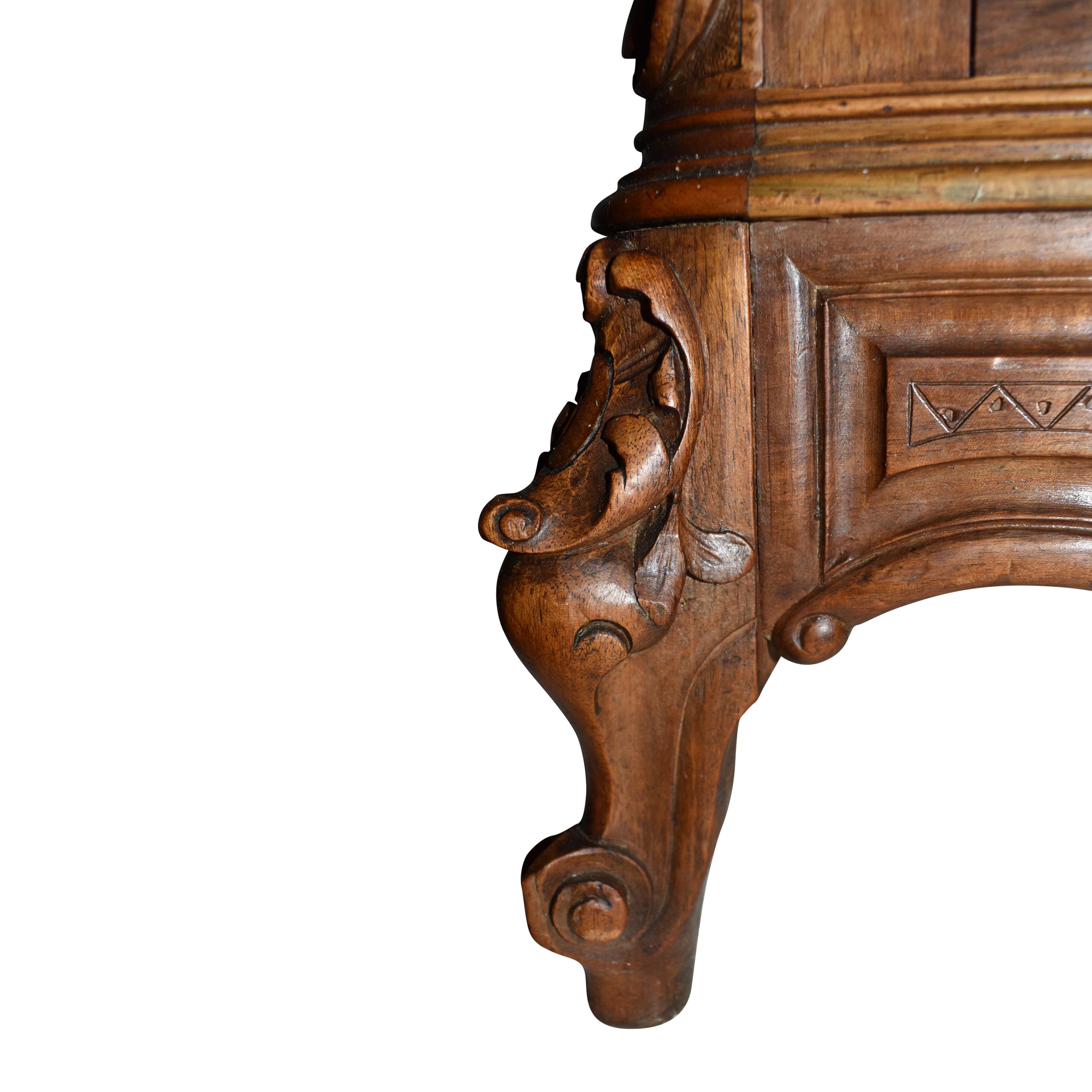 This elegant open-front cabinet showcases a rich walnut exterior paired with a light maple interior that beautifully contrasts for visual appeal. Featuring durable craftsmanship, the timeless charm of Louis XV style, and a smooth marble top, the cabinet's open front is perfect for displaying treasured items while adding a touch of classic sophistication to any room.